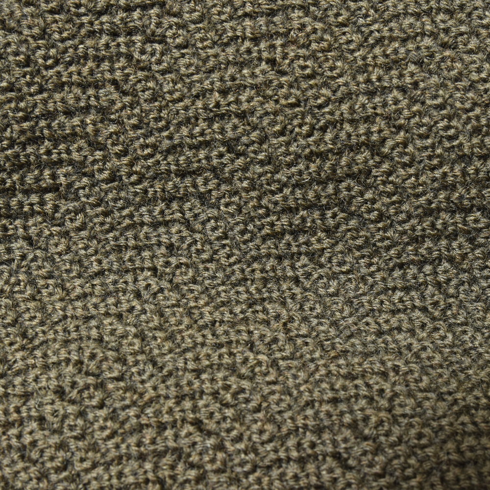 コチラのジャガードニットも奥行きを感じさせ単体でも見栄えが良い主役級のニット、色合いをオリーブにすることによってほんのりミリタリーな雰囲気を感じさせる塩梅は流石です。またさり気なく後身頃にモダンなタグを配置していまして、実際なくても困らないデティールではあるんですが、あると後ろ姿がすこ~しだけこなれて見える、そんなところも気が利いているんです。