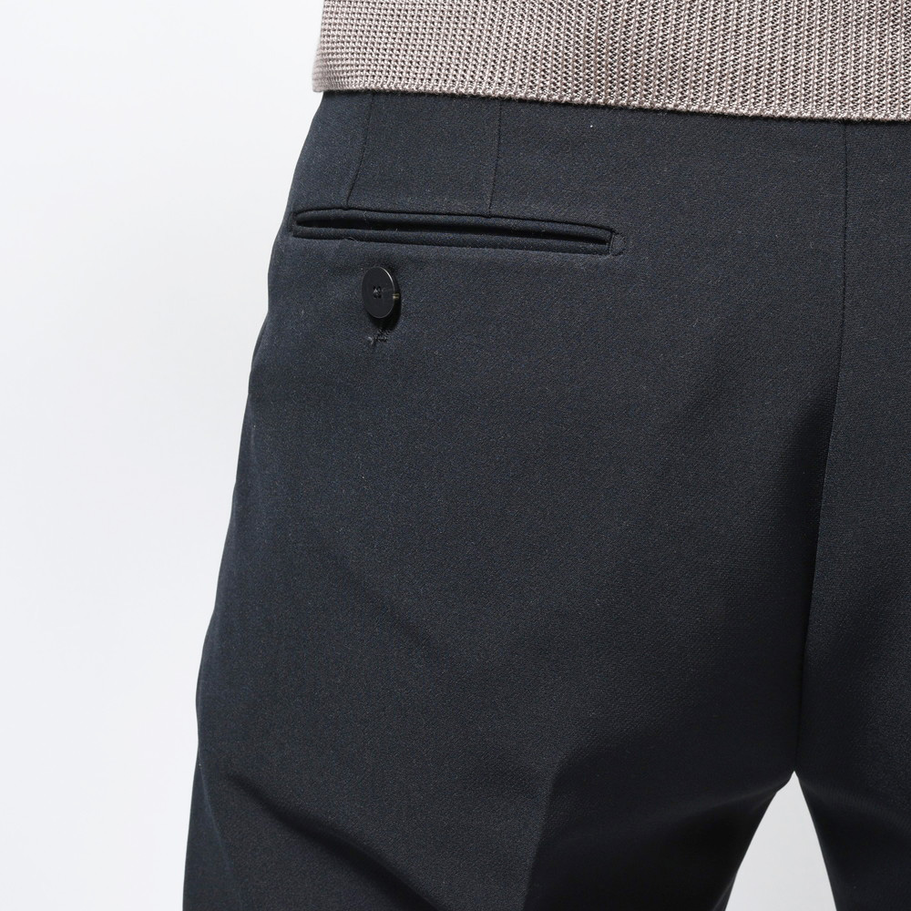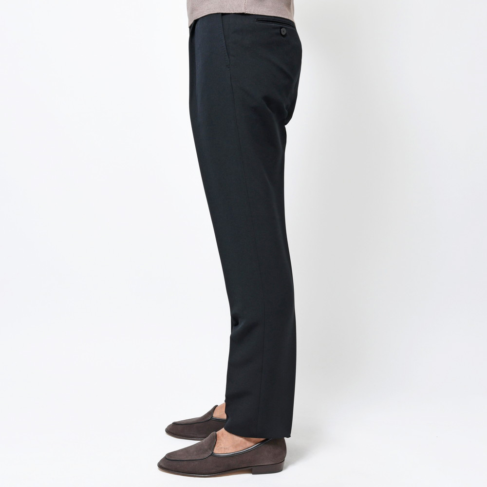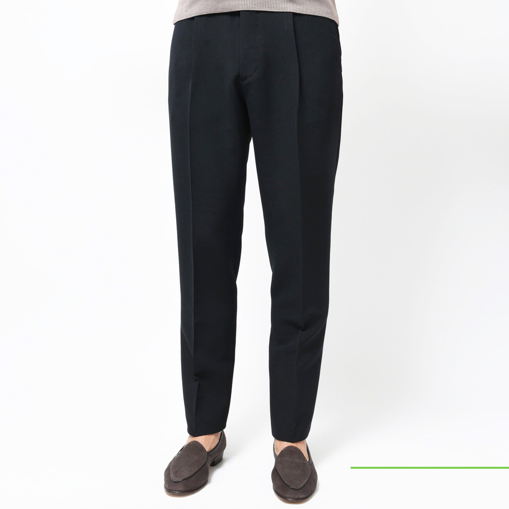 素材はジャージを採用することで、スマートでありながらもコンフォート性がありストレスなく穿いていただける仕上がりに。以前は2プリーツで採用していましたが、今回は1プリーツにすることで腰回りの雰囲気も気持ちモダンに見えるようになっています。