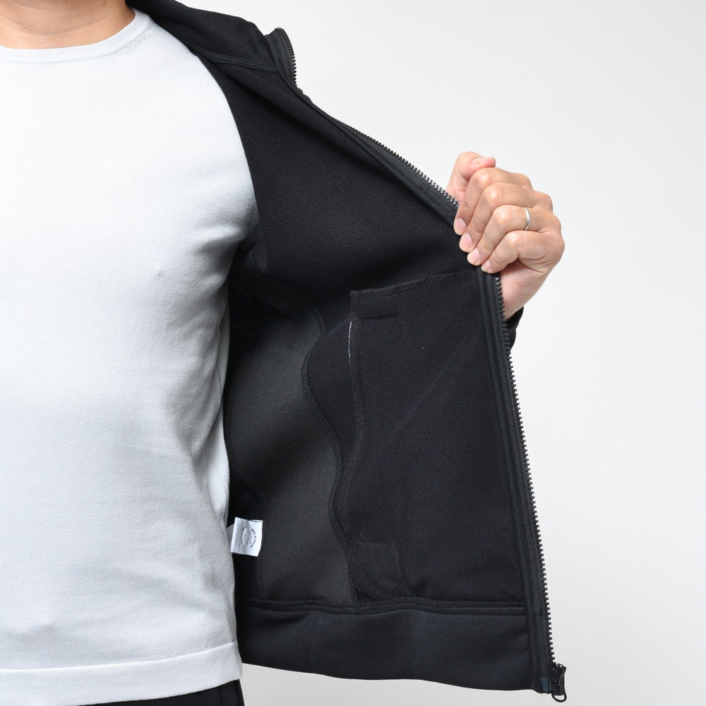 更に体の側面に沿うようにリブをセットすることで、手の上下、腕や腰の回転の際にシルエットを崩さずにスムーズに動くように計算されています。生地全体を均等に伸ばすのではななく、特に伸縮性の優れた部分を作ることでシルエットが崩れないように設計された、非常に美意識の高い一着だと思います。