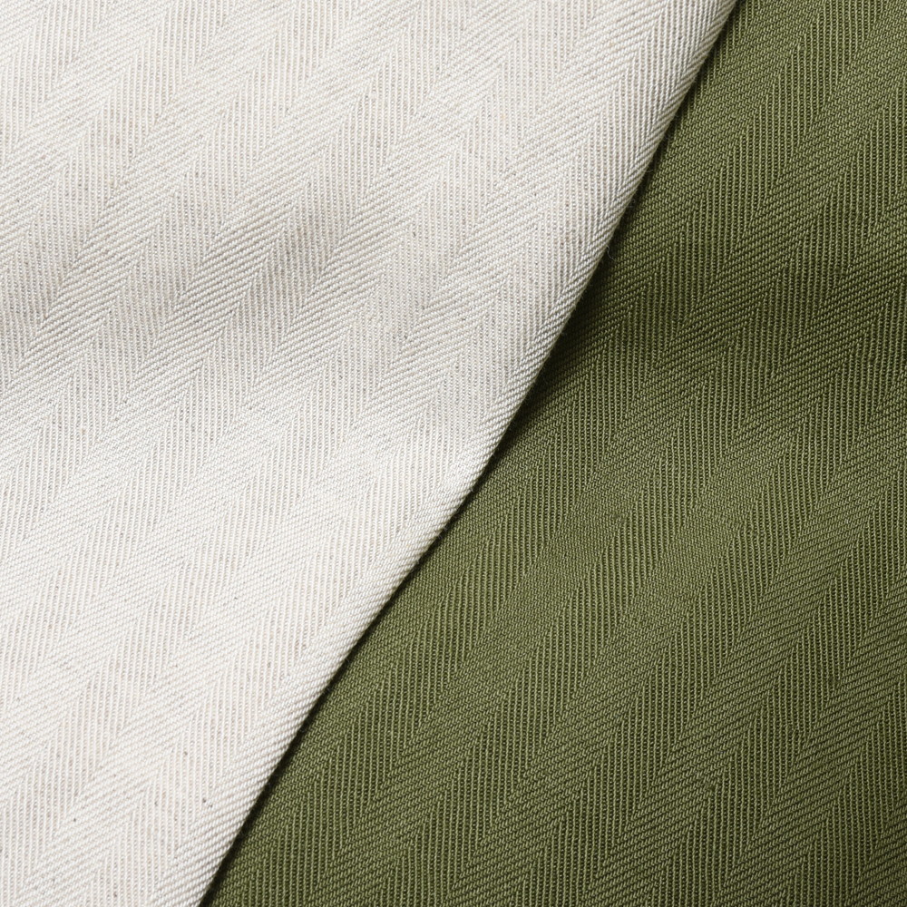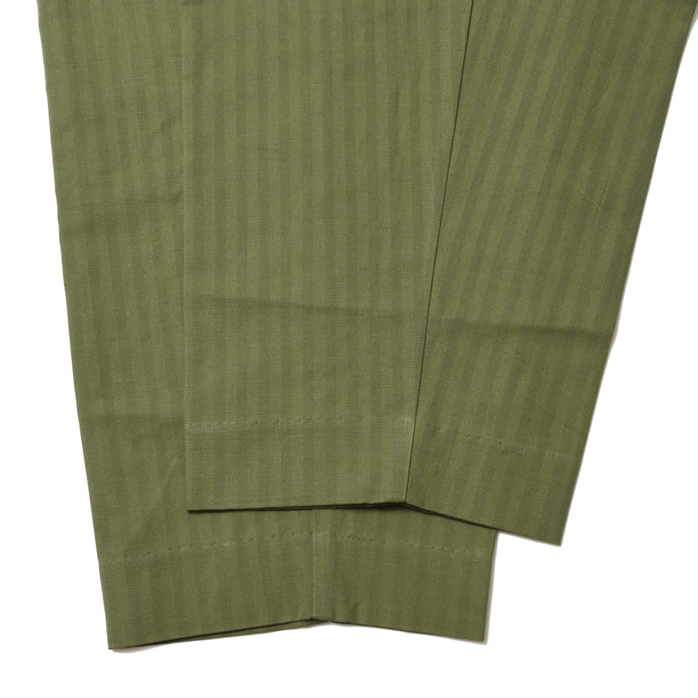 密度の高いヘリンボーン生地の風合いがタフな雰囲気を感じさせつつ、シルエットによって抜けた感じを演出するバランスがお見事でちょっと他にはない黄金比率。クセのある形ですが合わせるシューズのボリュームによって印象ががらりと変化するタイプなので、そういった意味でも面白みがあって挑戦し甲斐のあるパンツと言う印象なんです。
