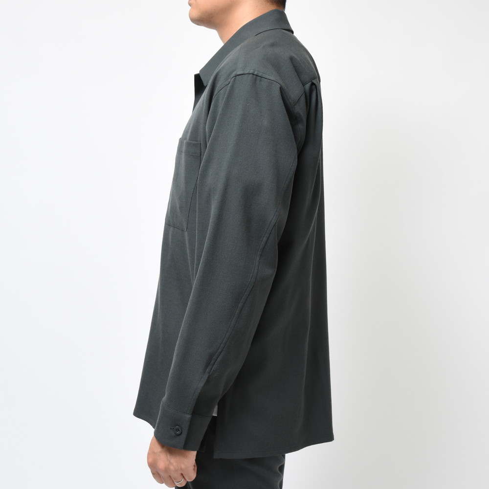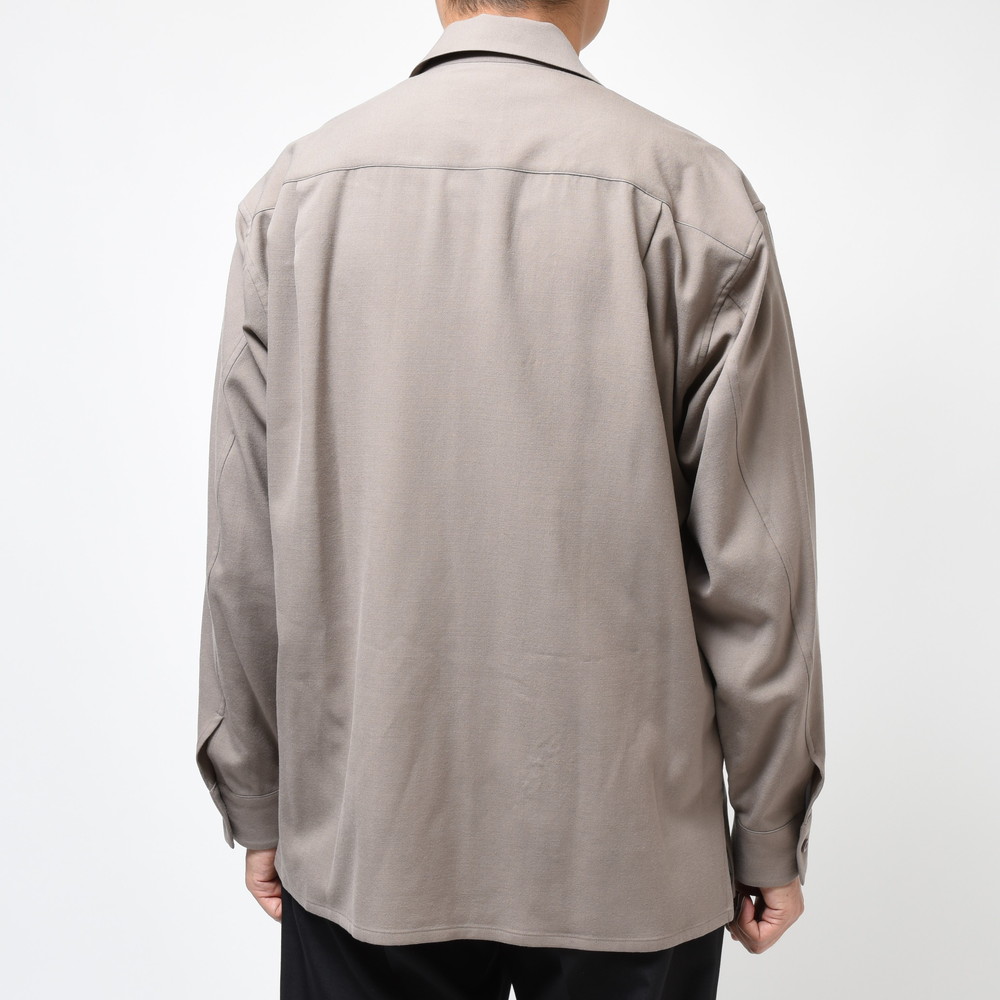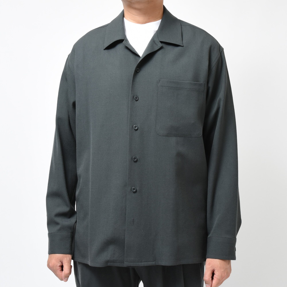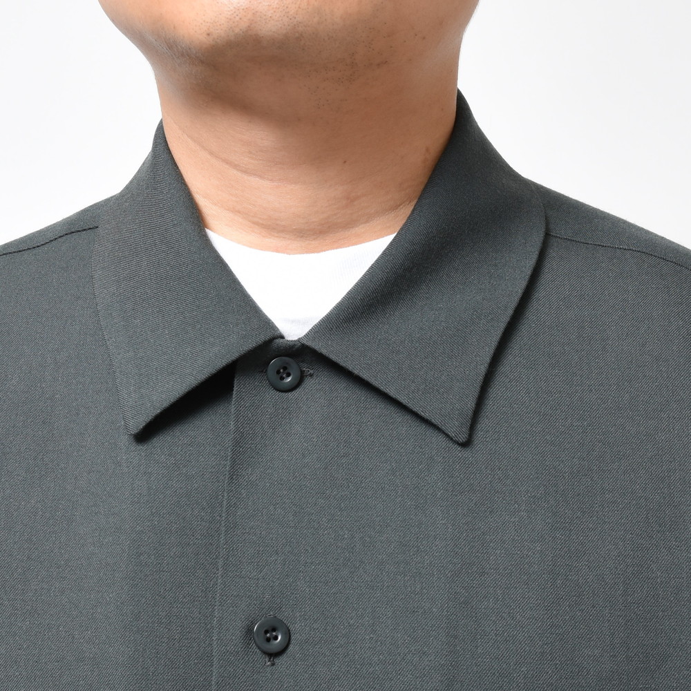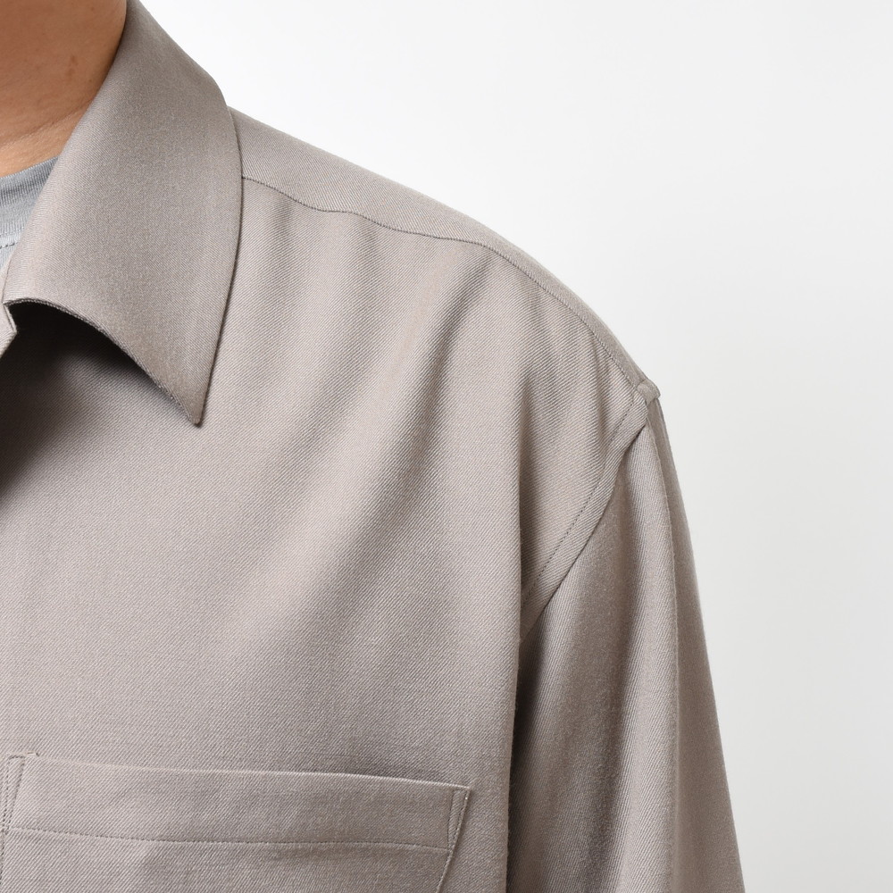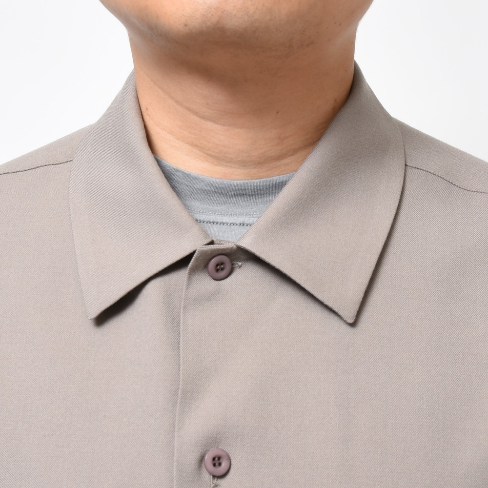 これまでは化繊での提案が多かったシャツですが、今回はウールのサージ生地で仕立ててある為、何処かクラシカルな要素も感じさせつつ現代的に着ることが出来る、そんな一着に仕上がっています。