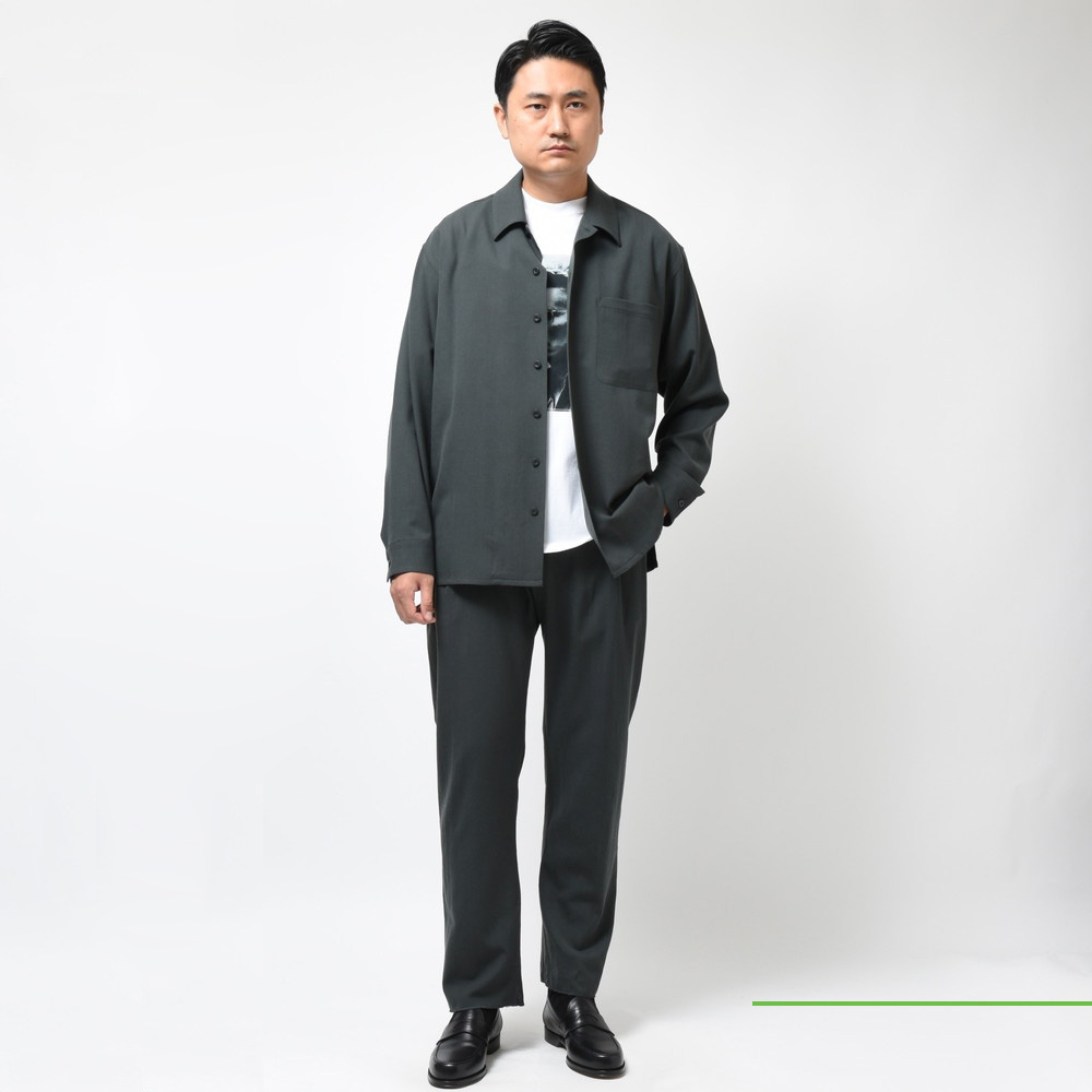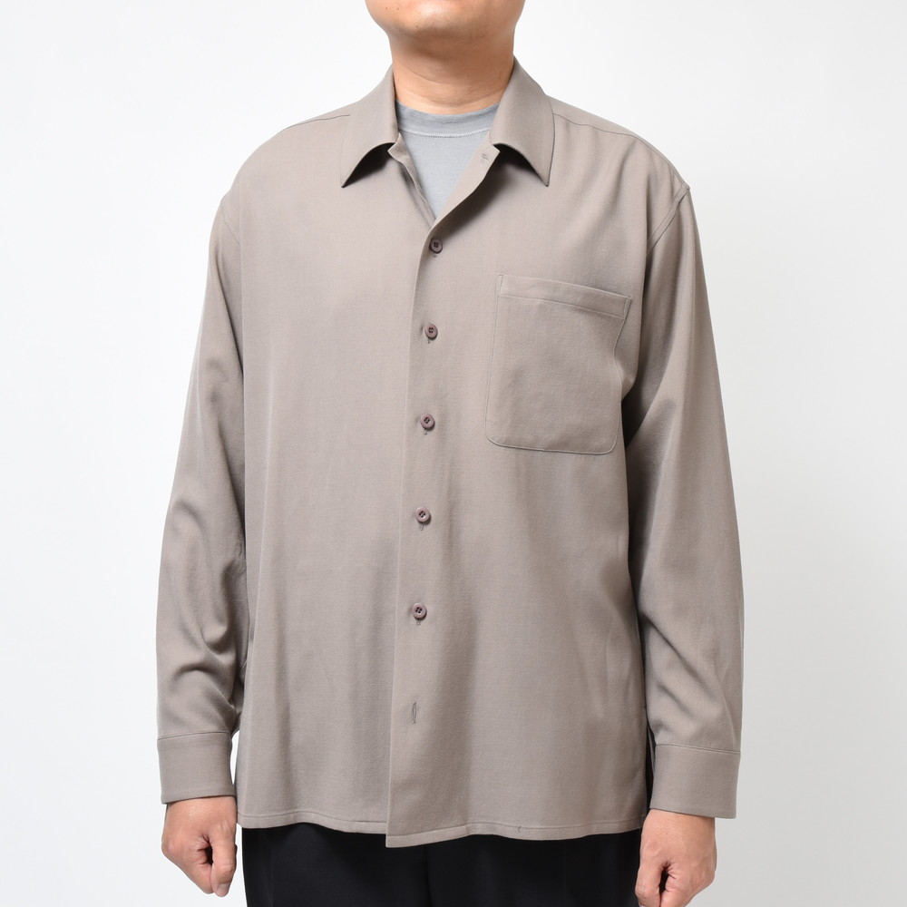 何とも言えないムードのある色合いが素敵なオープンカラーのシャツは、適度に緩さを感じさせるボックス調のものになっていまして、前を開けてドレープを楽しんでも良いかもしれません。