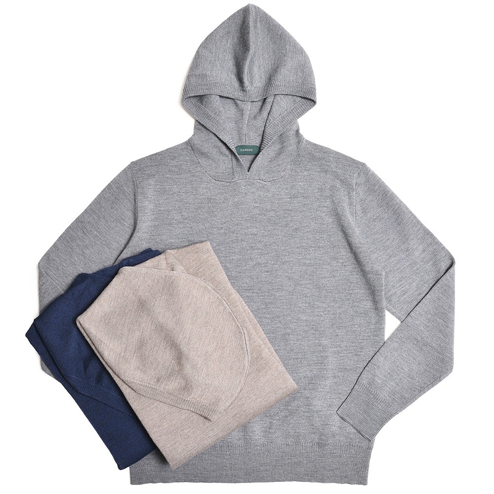 ZANONE(ザノーネ)のセンスの良さが凄く表れていると感じるプルオーバーニットフーディーがこちらでして、一般的なニット組織ではなく張りコシが強いミラノリブを採用しているところが最大の特徴です。