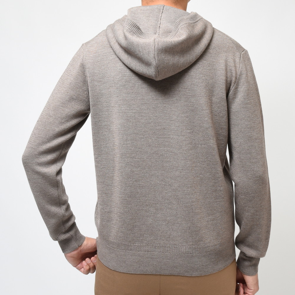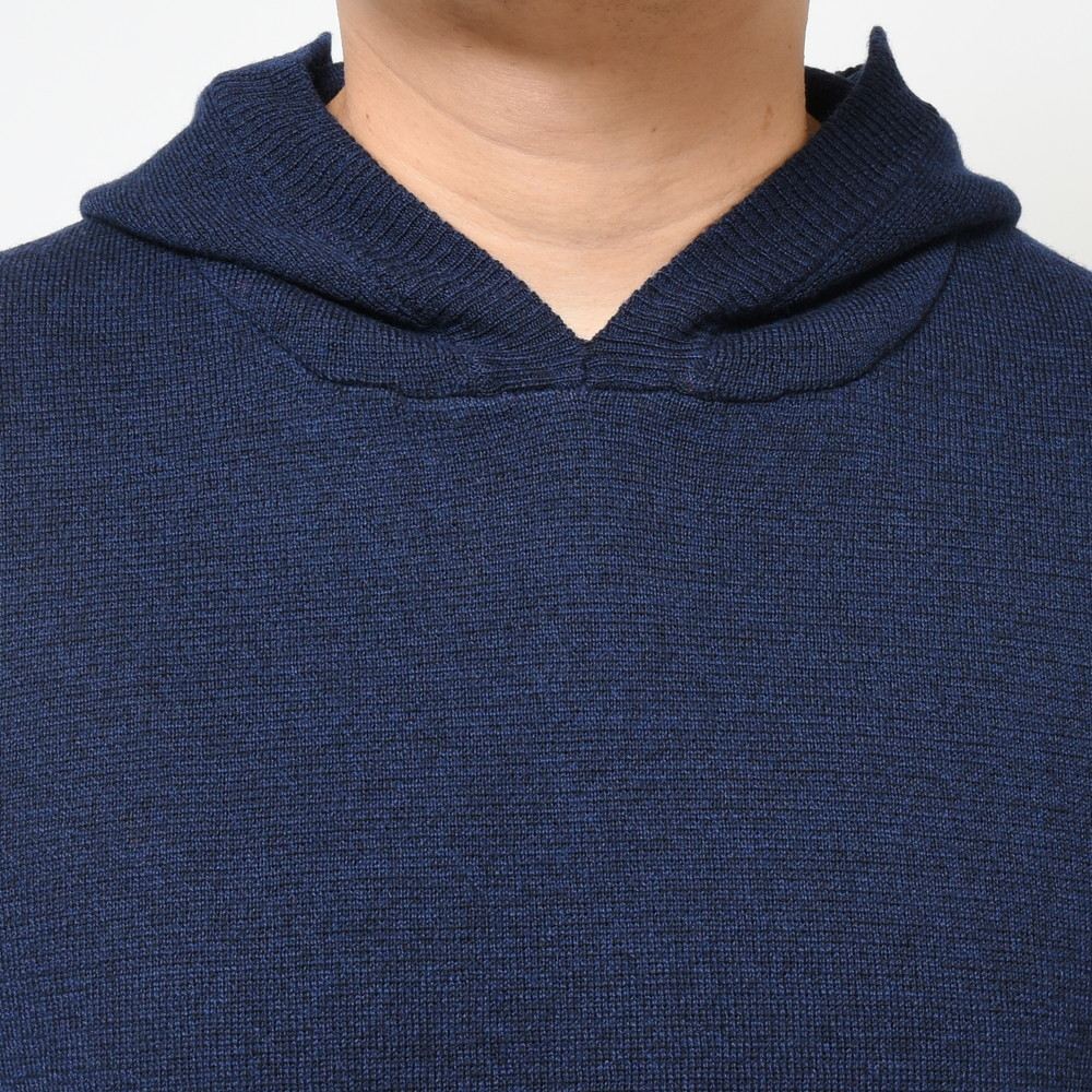ニットのフーディというと以前はジップ型のイメージが強かったんですが、今はプルオーバーのタイプの方が良く見かけるようになりました。