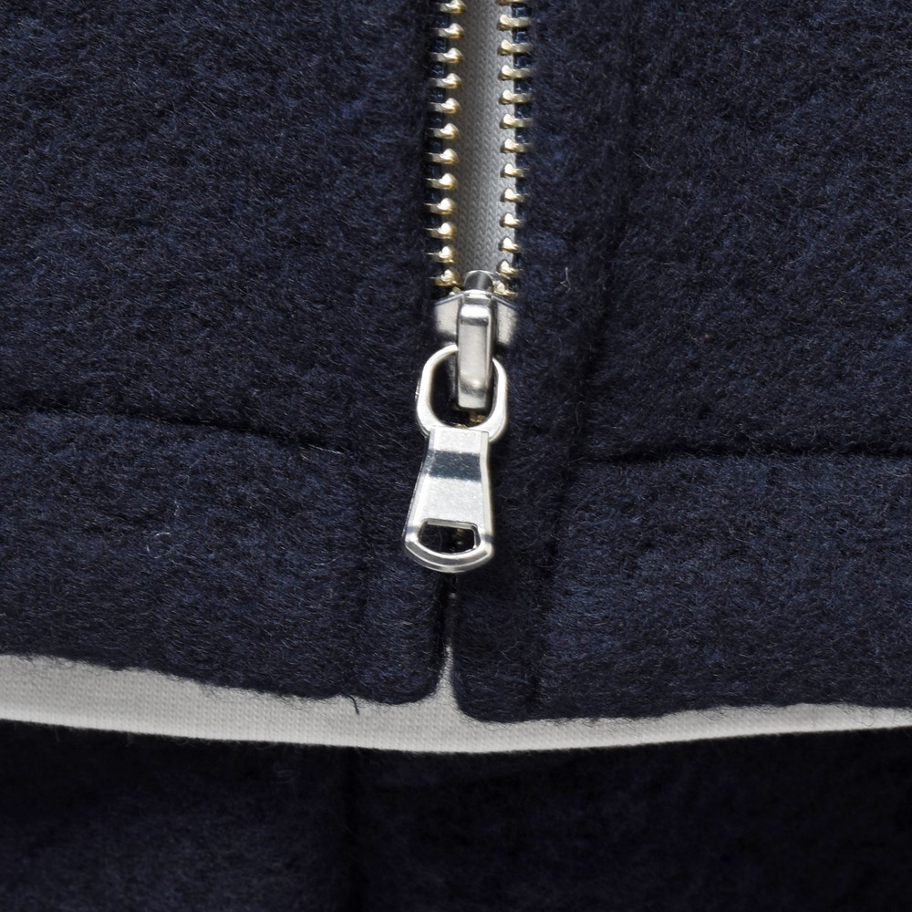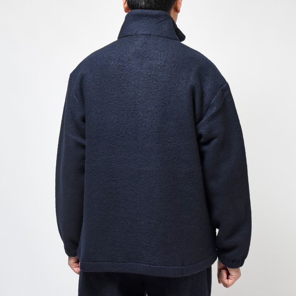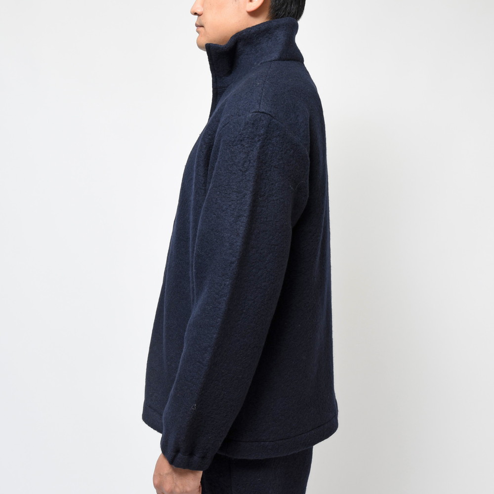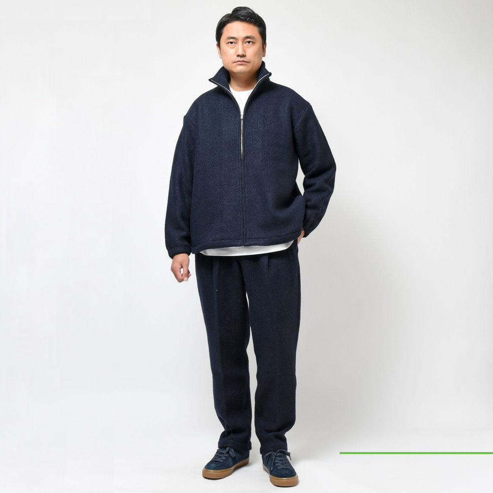スタンドカラーのトラックジャケットタイプのフリースブルゾンは、いわゆるアウトドア系のしなやかで柔らかな物ではなく、ある種無骨で強さを感じさせるタッチ。でも素材の上質さが物語るエレガンスがあり、製品としてのミックス感が素晴らしい一着です。