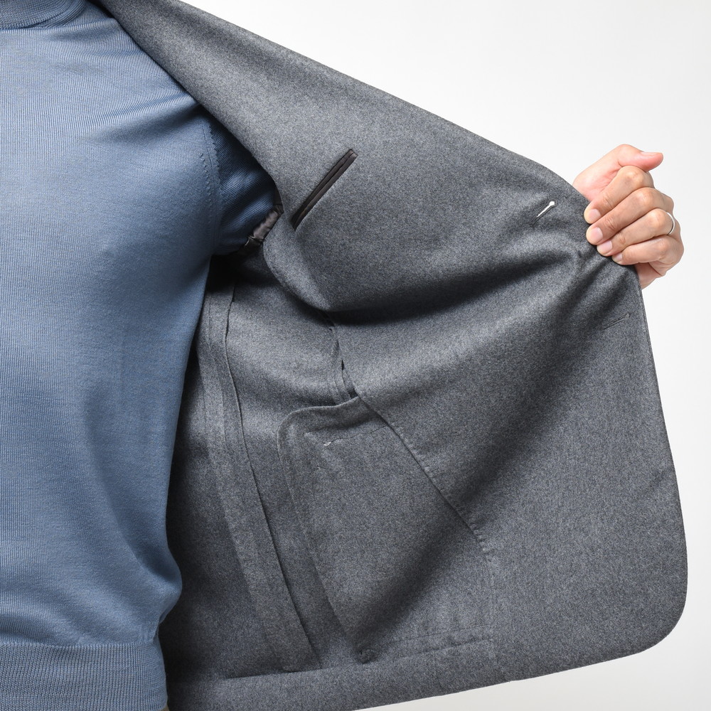 縦のラインが強調されていることから上質でありつつ少し張りのある生地が良く似合うモデルなので、今回採用したのは美しい奥行きを感じさせるグレーフランネル。沈み込むようなメランジ発色が素晴らしい、極めてクラシカルなファブリックですね。