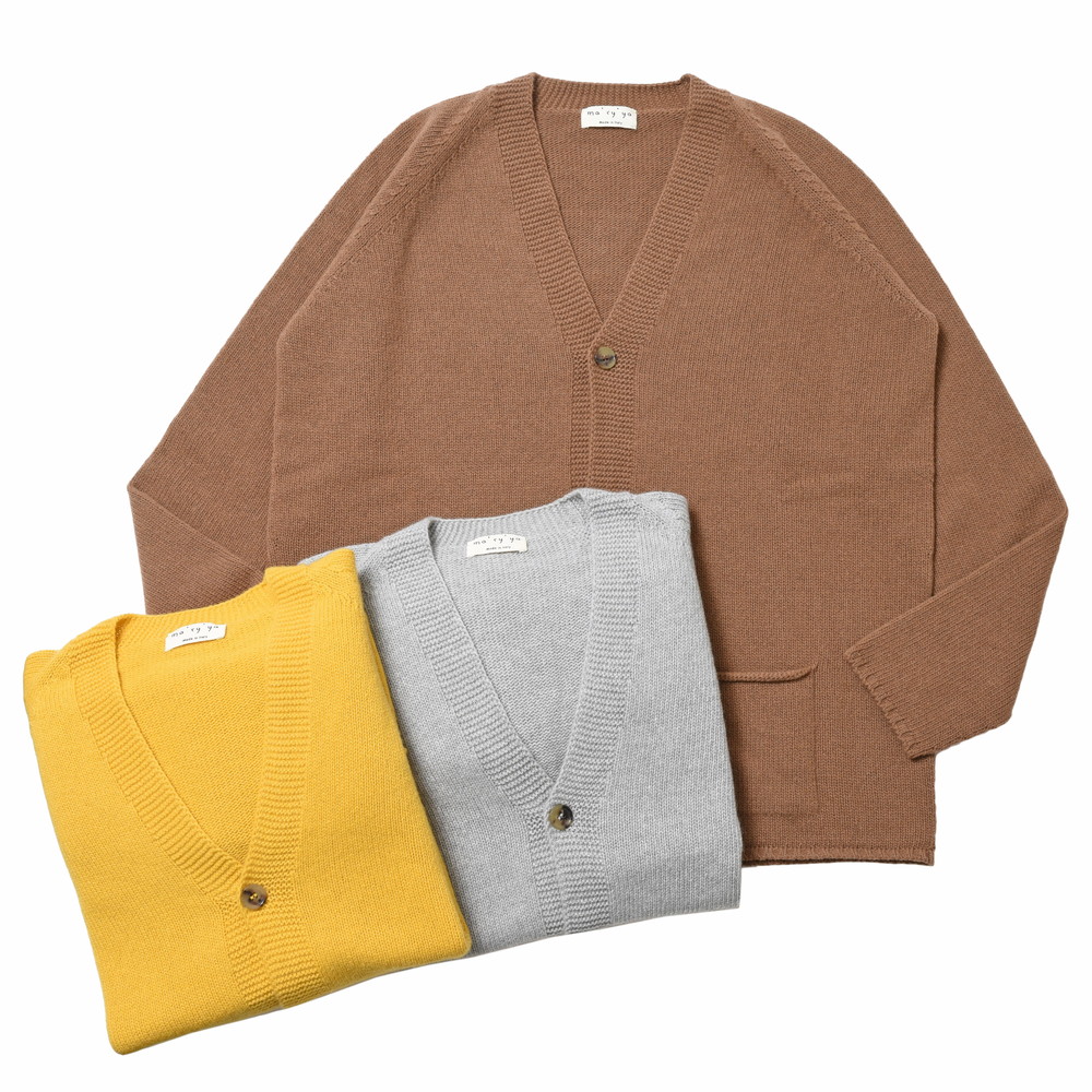 シンプルなんですが、前立ての雰囲気や少な目のボタン数など、ma'ry'yaらしいデザインが施されたほんのりマイルドで柔らかなカーディガンです。