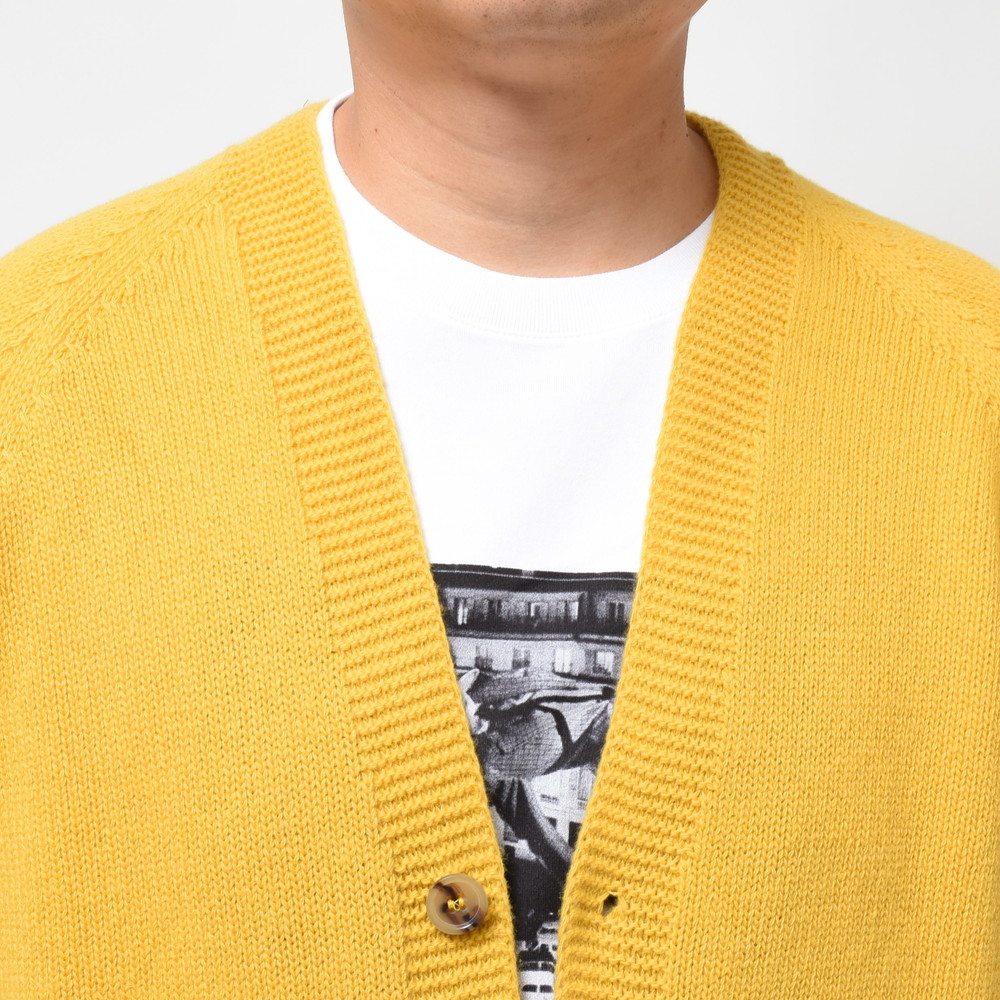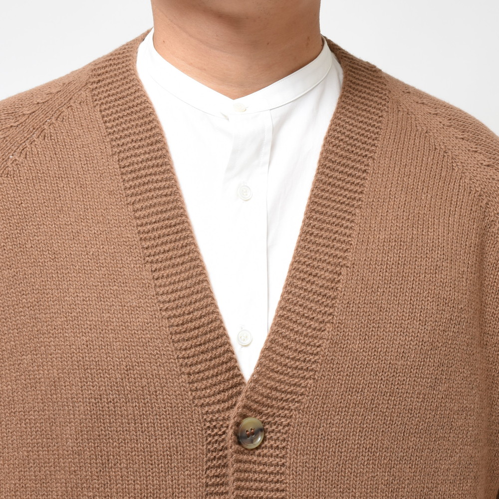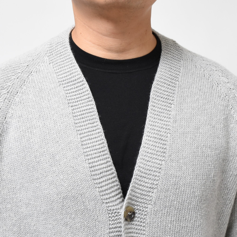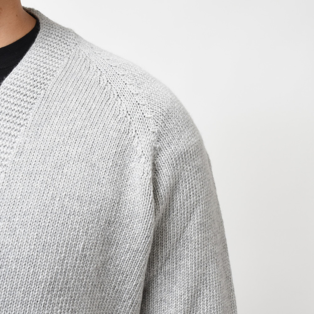 裾部分には絞りを入れずストンと落ちるようにしているのがポイント、これによりスマートなシルエットであっても窮屈感が出ずスッキリと着ていただける形に。片意地張らずに着ることが出来るのがカーディガンの良い所、サッと羽織れる一着はデイリーに活躍してくれるはずです。