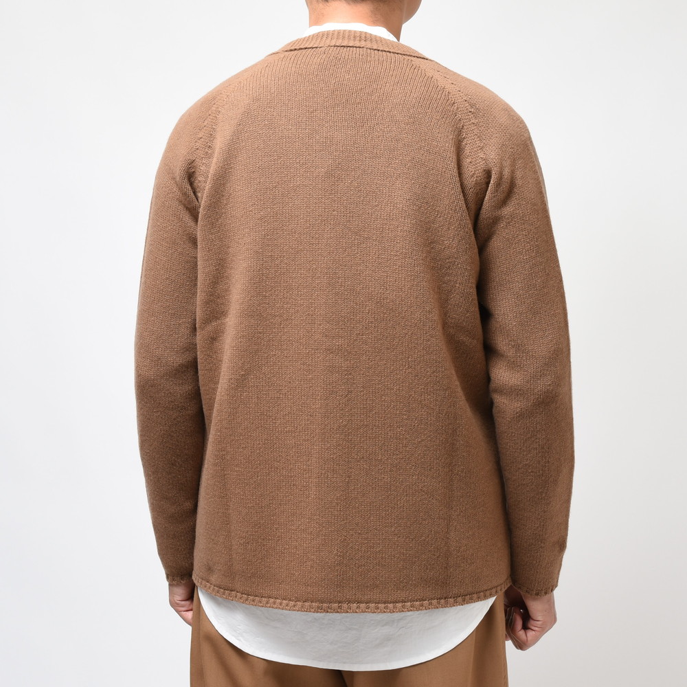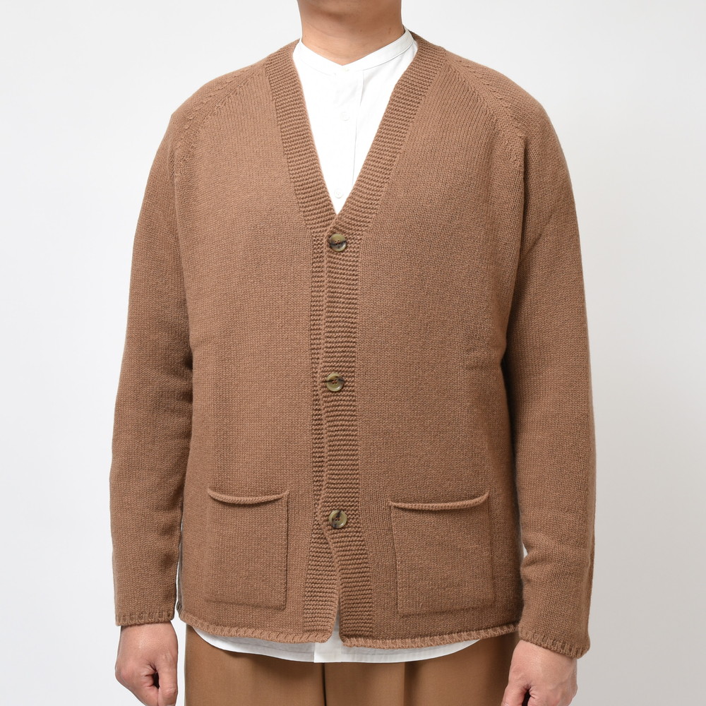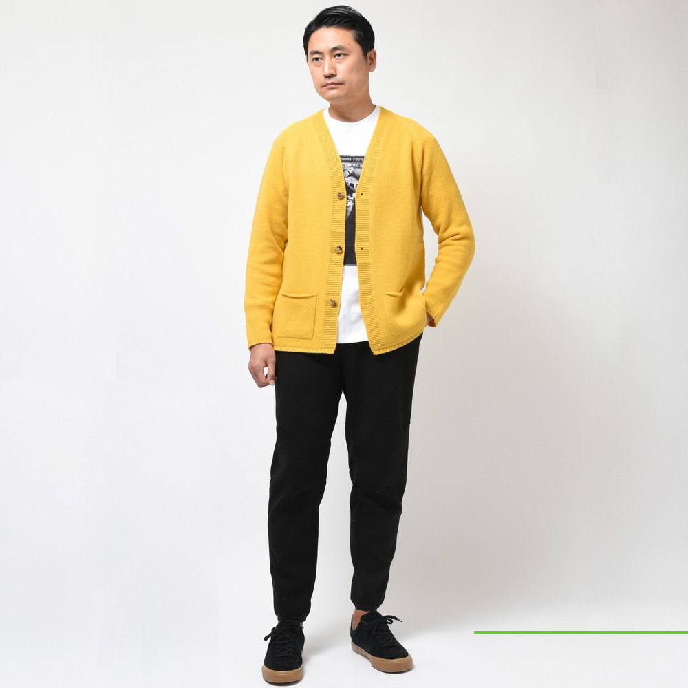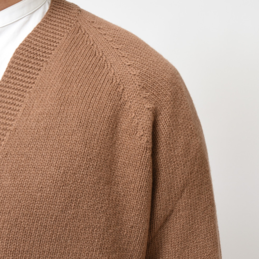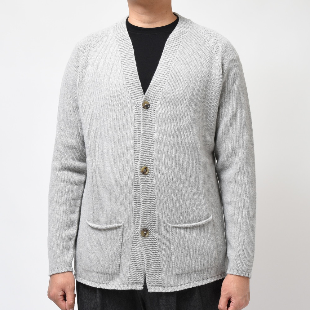 裾部分には絞りを入れずストンと落ちるようにしているのがポイント、これによりスマートなシルエットであっても窮屈感が出ずスッキリと着ていただける形に。片意地張らずに着ることが出来るのがカーディガンの良い所、サッと羽織れる一着はデイリーに活躍してくれるはずです。