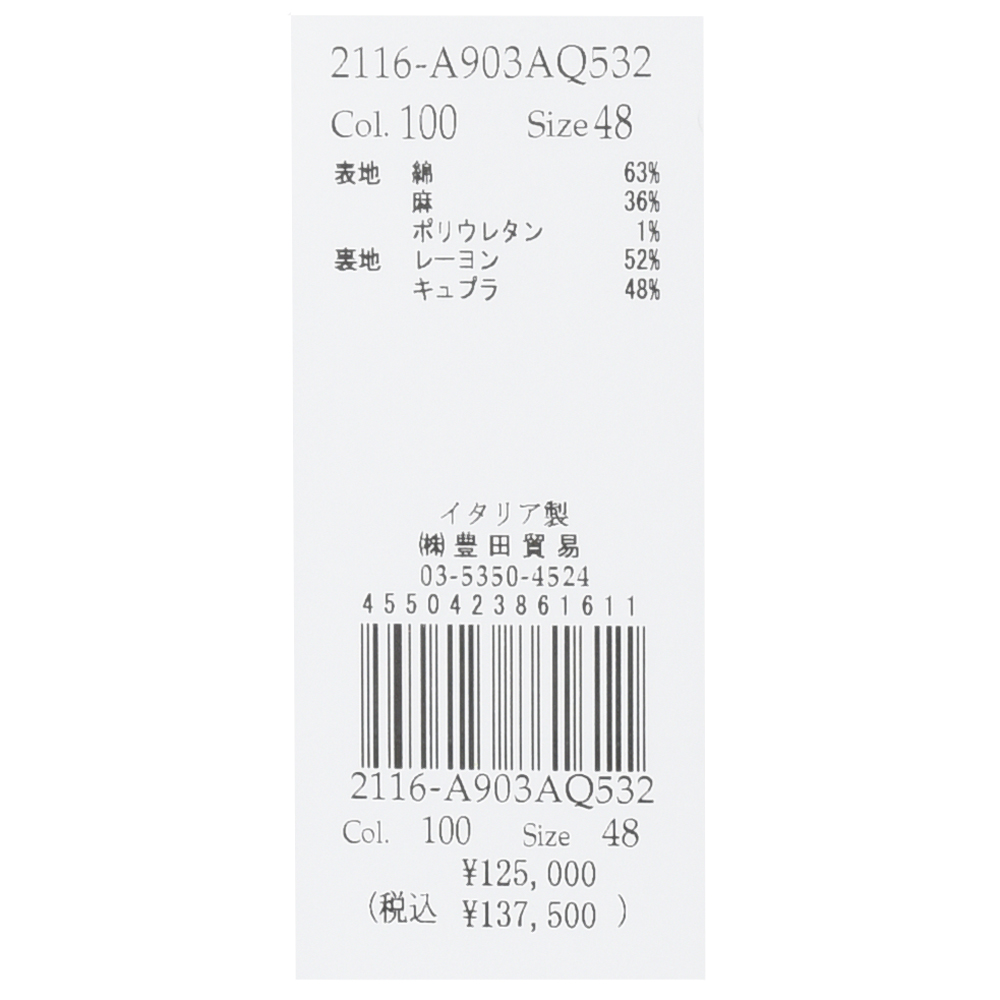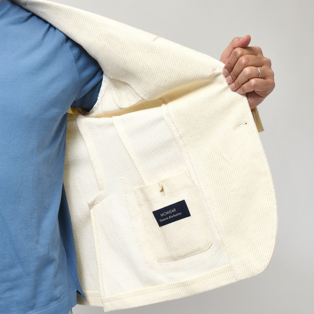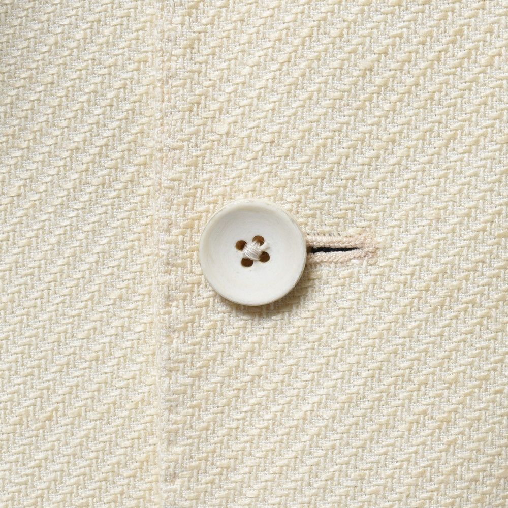 真っ白ではなく生成りっぽい色合いなのが良いですね、キリっとしたシャープなスタイルを形成しながら、こういった柔和な色で全体の雰囲気をマイルドに魅せてくれるセンスの良いジャケットです。
