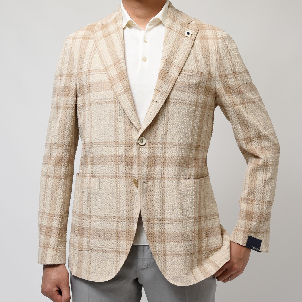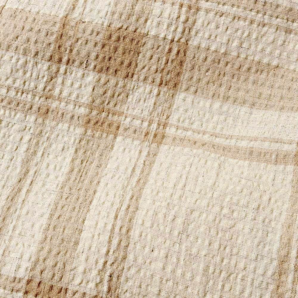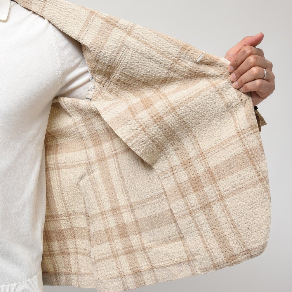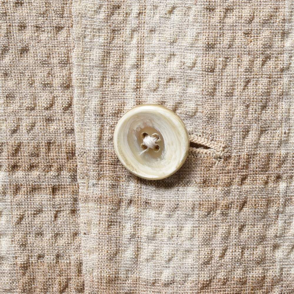 大柄のタータンチェック、ベージュとダークベージュのコンビネーションはシアサッカー特有の涼感はそのままに、マイルドでナチュラルな雰囲気を醸し出します。また、コットン×リネンというのもポイントで、他にはないエレガントなタッチに仕上がっています。