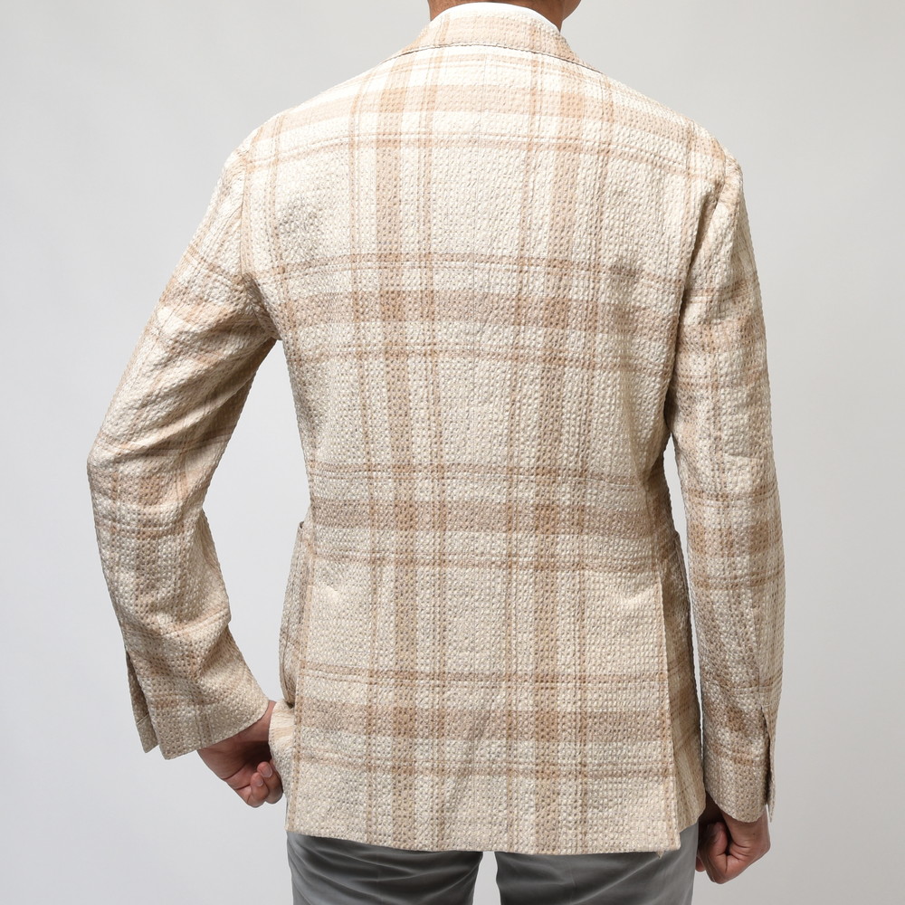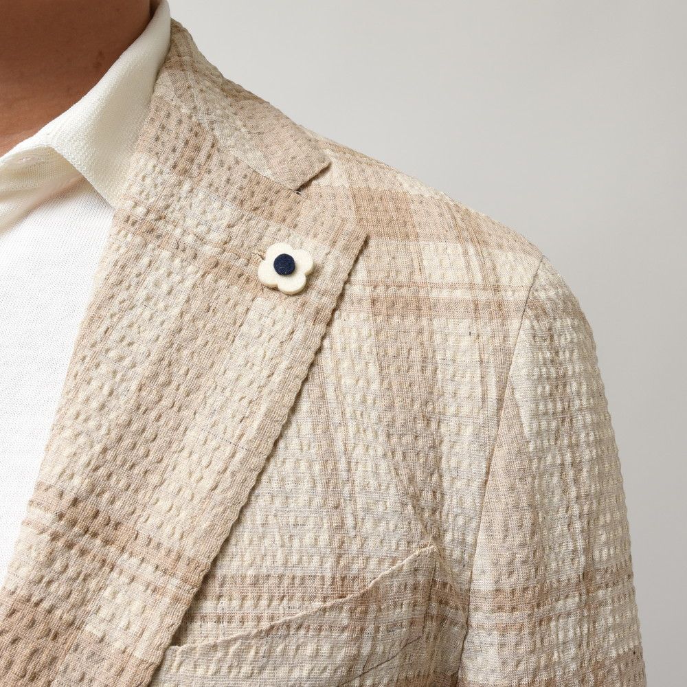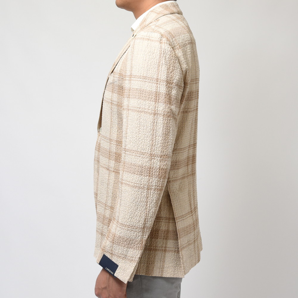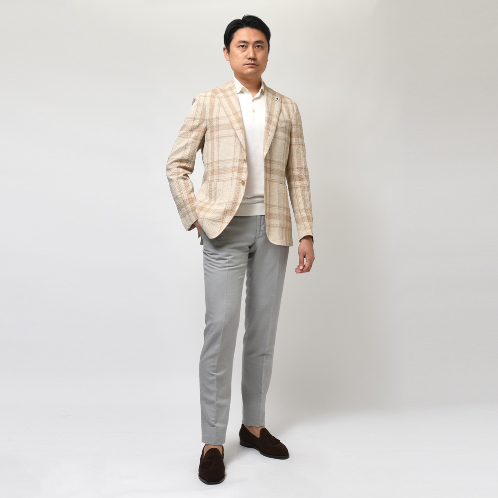 大柄のタータンチェック、ベージュとダークベージュのコンビネーションはシアサッカー特有の涼感はそのままに、マイルドでナチュラルな雰囲気を醸し出します。また、コットン×リネンというのもポイントで、他にはないエレガントなタッチに仕上がっています。