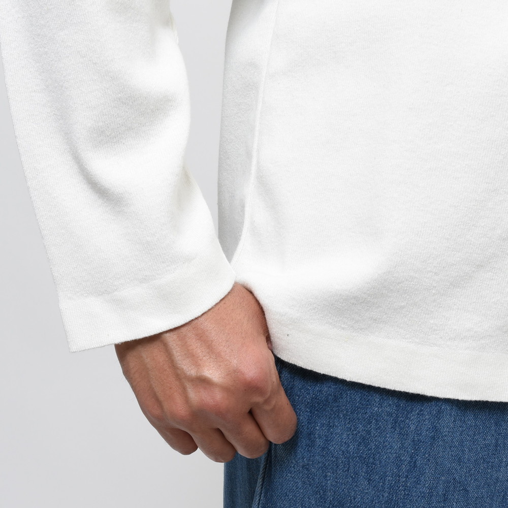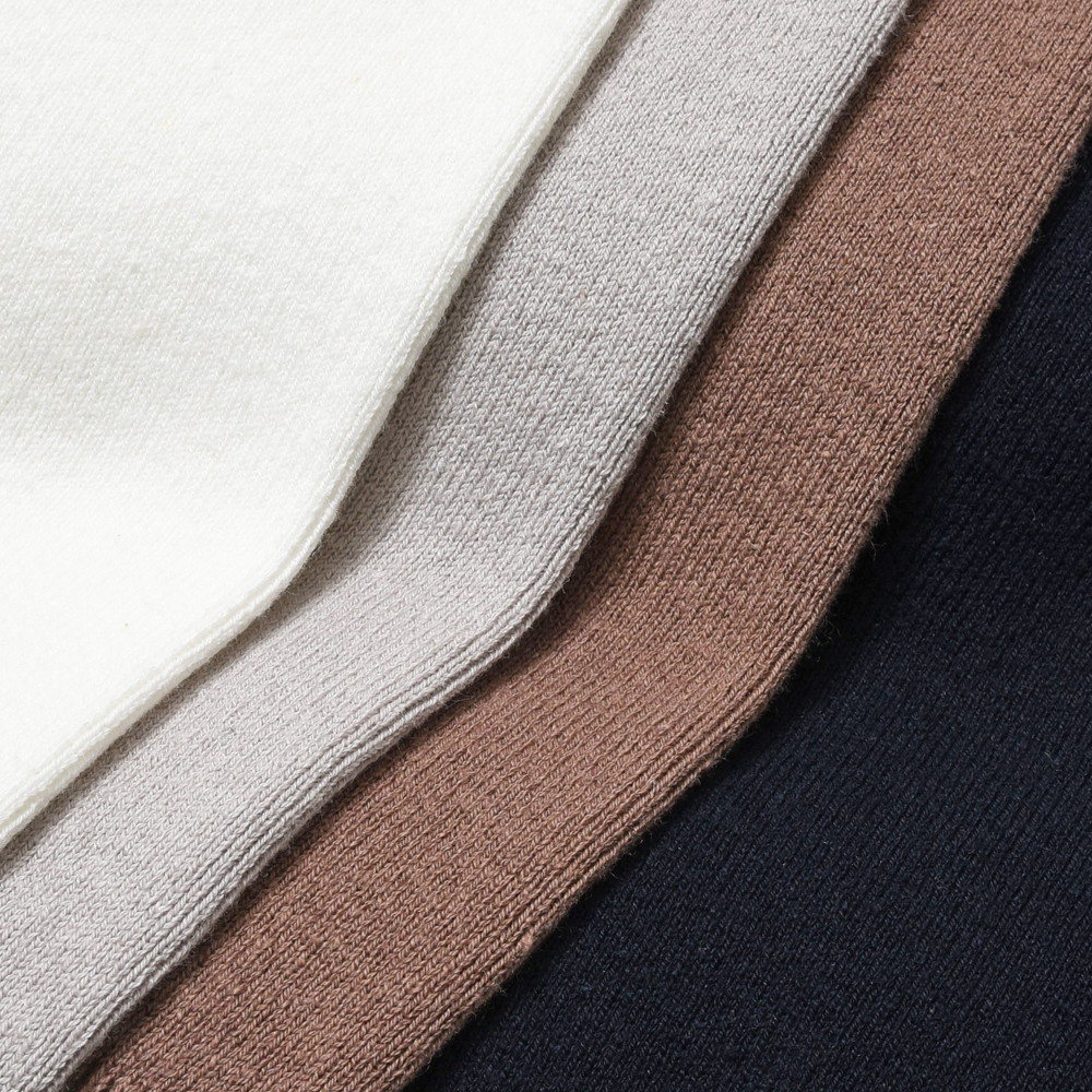 高級ソックスなどにも用いられる糸を撚って編地にしており肌触りが非常に良く、それでいて丈夫さも兼ね備えているという気の利いたニットなんですね。