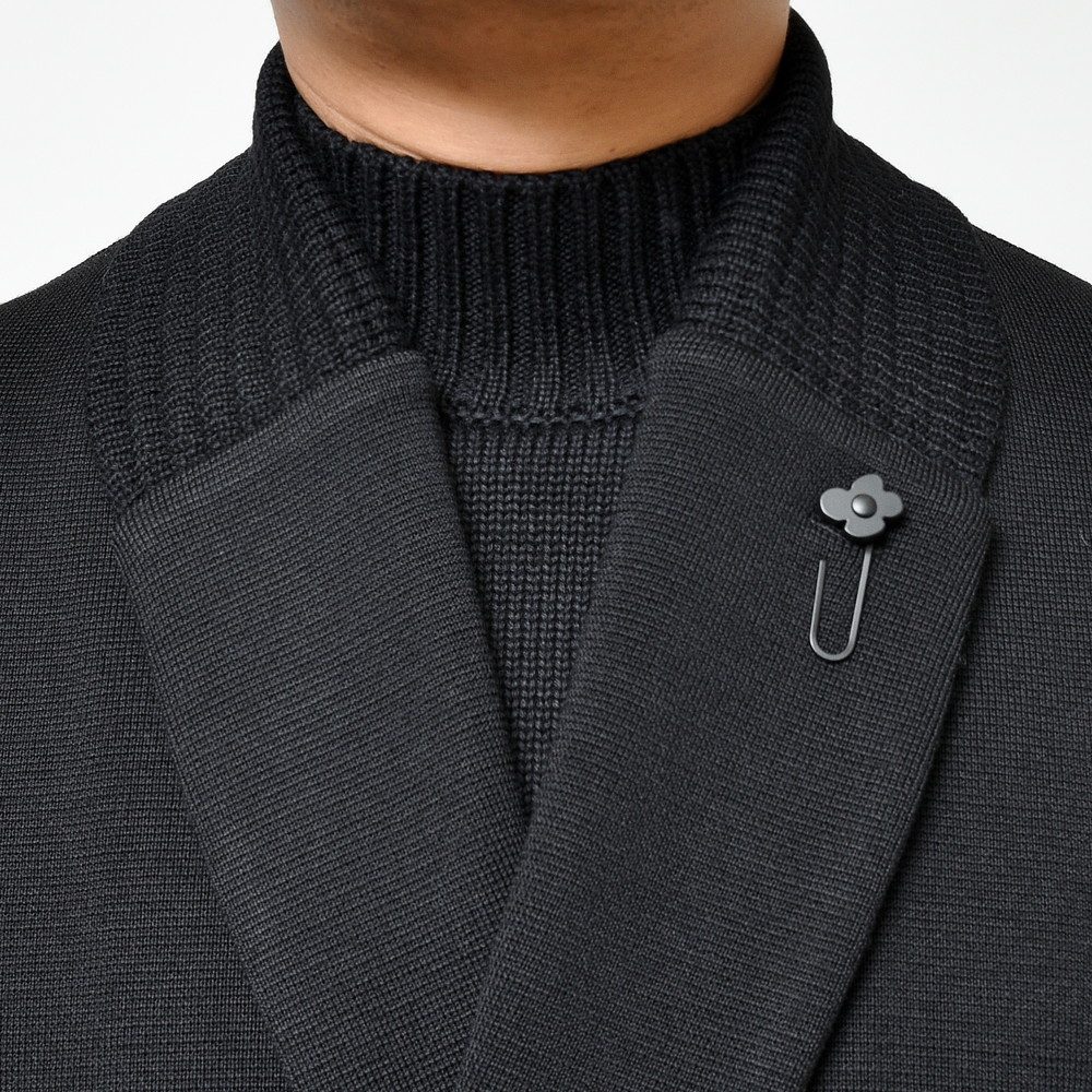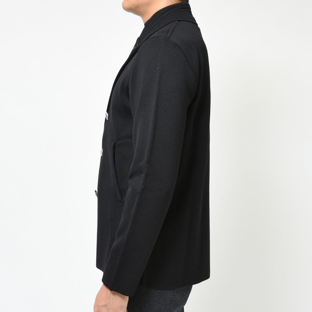こちらはダブルブレストタイプでショールカラー、上衿は平編みリブ、それ以外はミラノリブを採用。