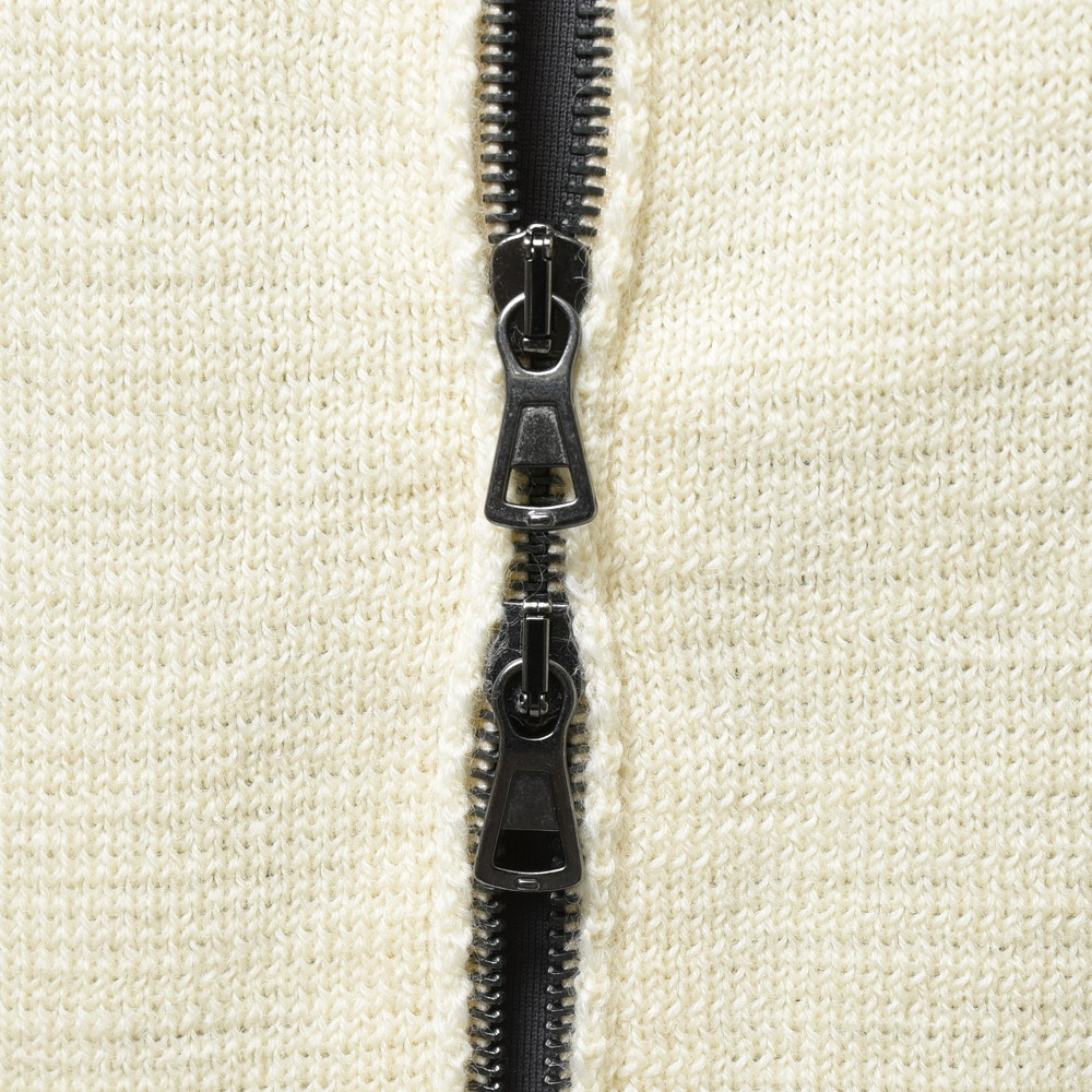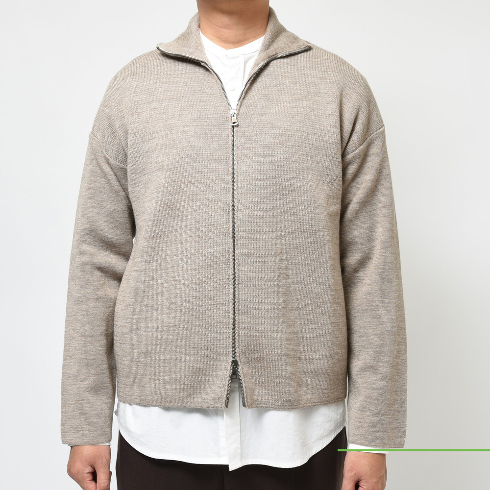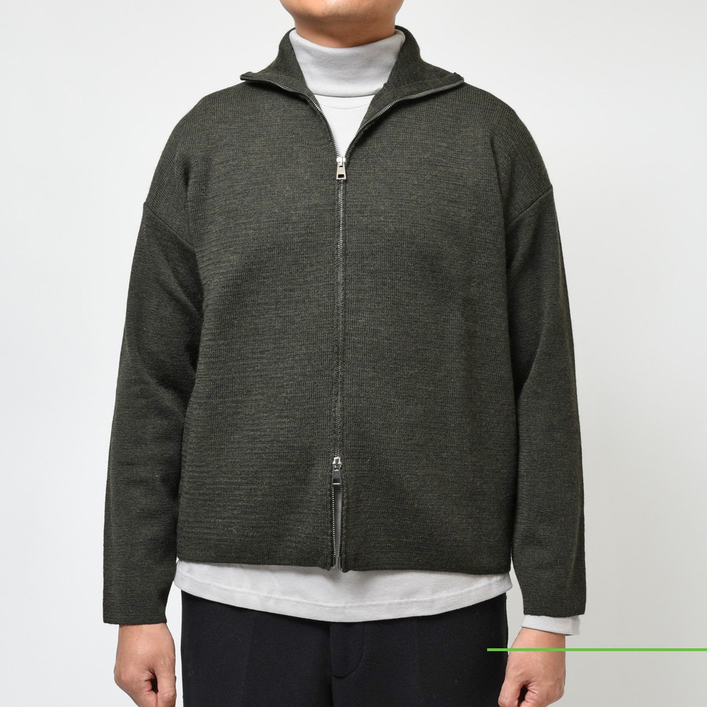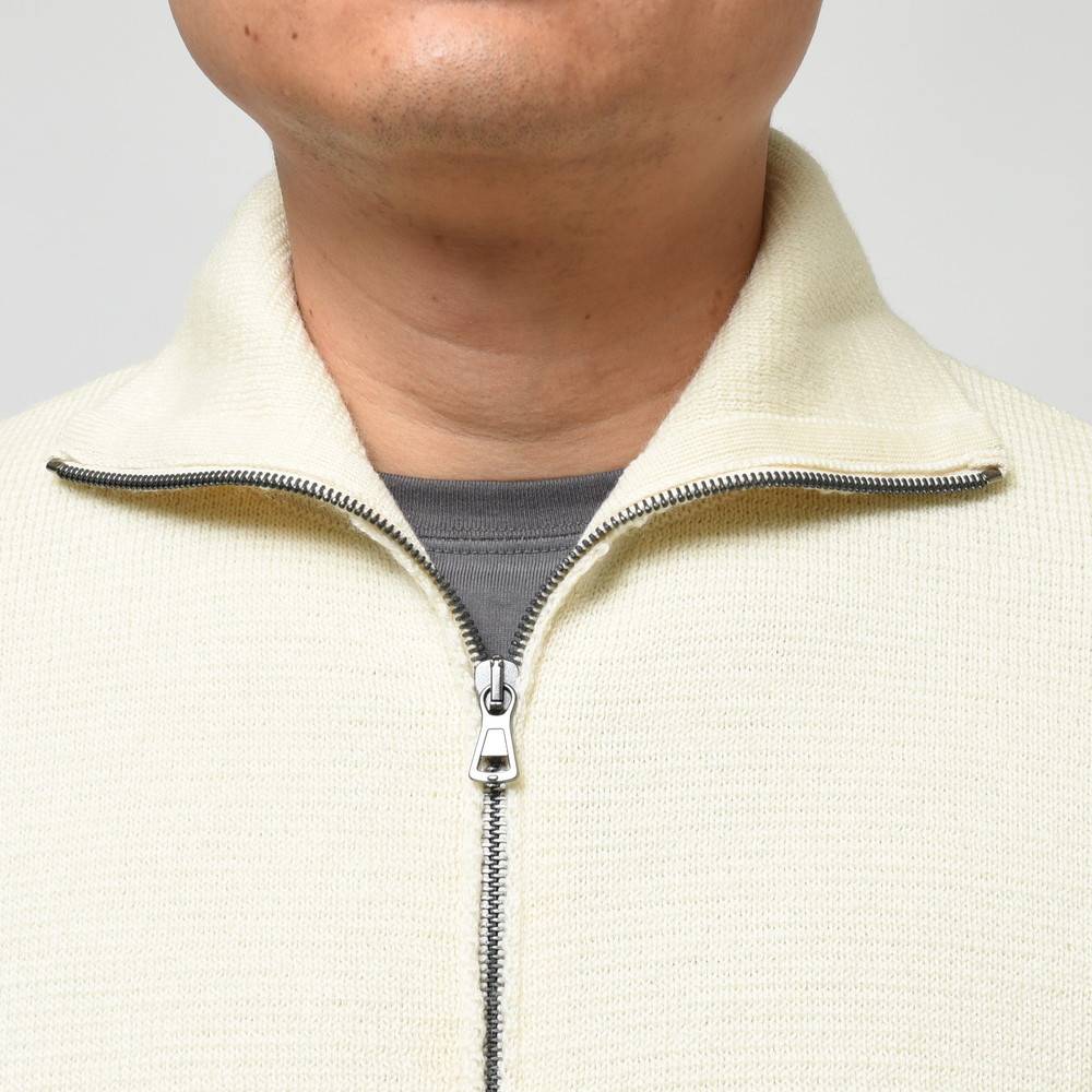 所謂一般的なドライバーズニットとはシルエットが異なっていまして、丈感はコンパクト、肩は落とし気味のデザインになる事で特徴を出しています。ダブルジップの仕様になっているのも嬉しいポイント、上までしっかり締めて、下は動きやすいように少し開けたり、動きを出すことが出来るので着こなしの幅も広い印象なんです。