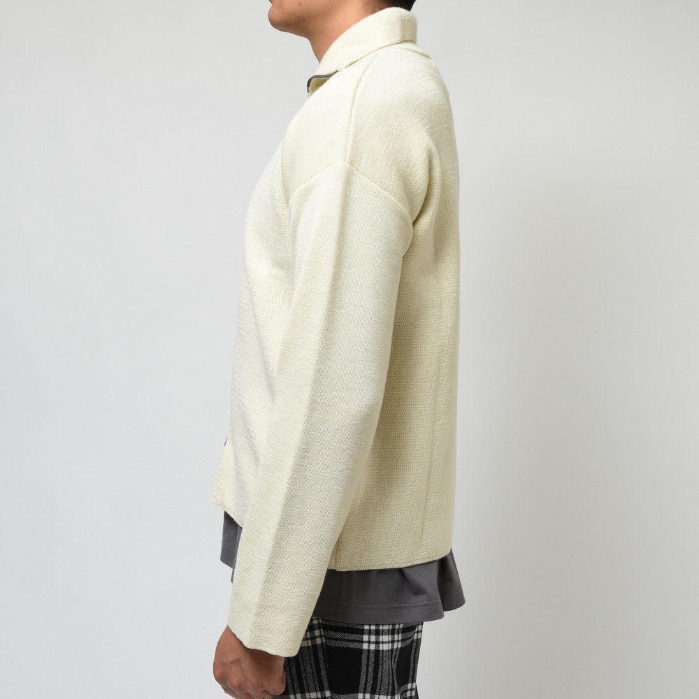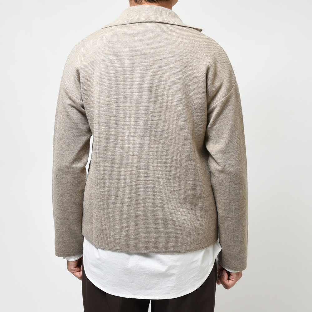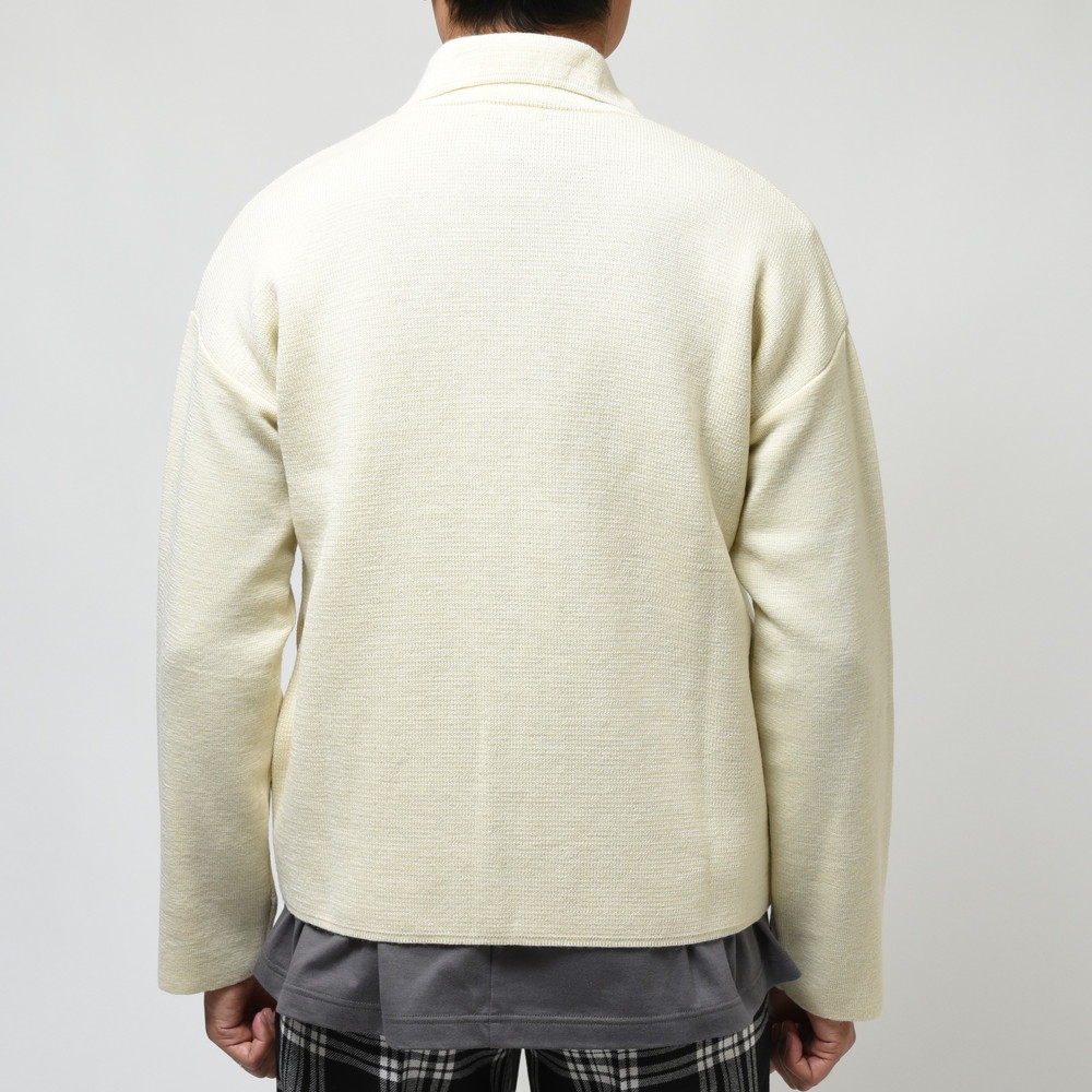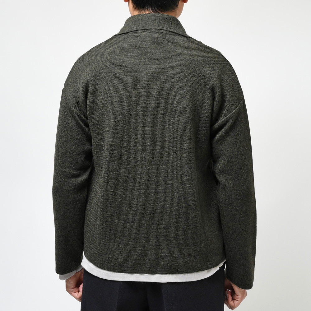 所謂一般的なドライバーズニットとはシルエットが異なっていまして、丈感はコンパクト、肩は落とし気味のデザインになる事で特徴を出しています。ダブルジップの仕様になっているのも嬉しいポイント、上までしっかり締めて、下は動きやすいように少し開けたり、動きを出すことが出来るので着こなしの幅も広い印象なんです。