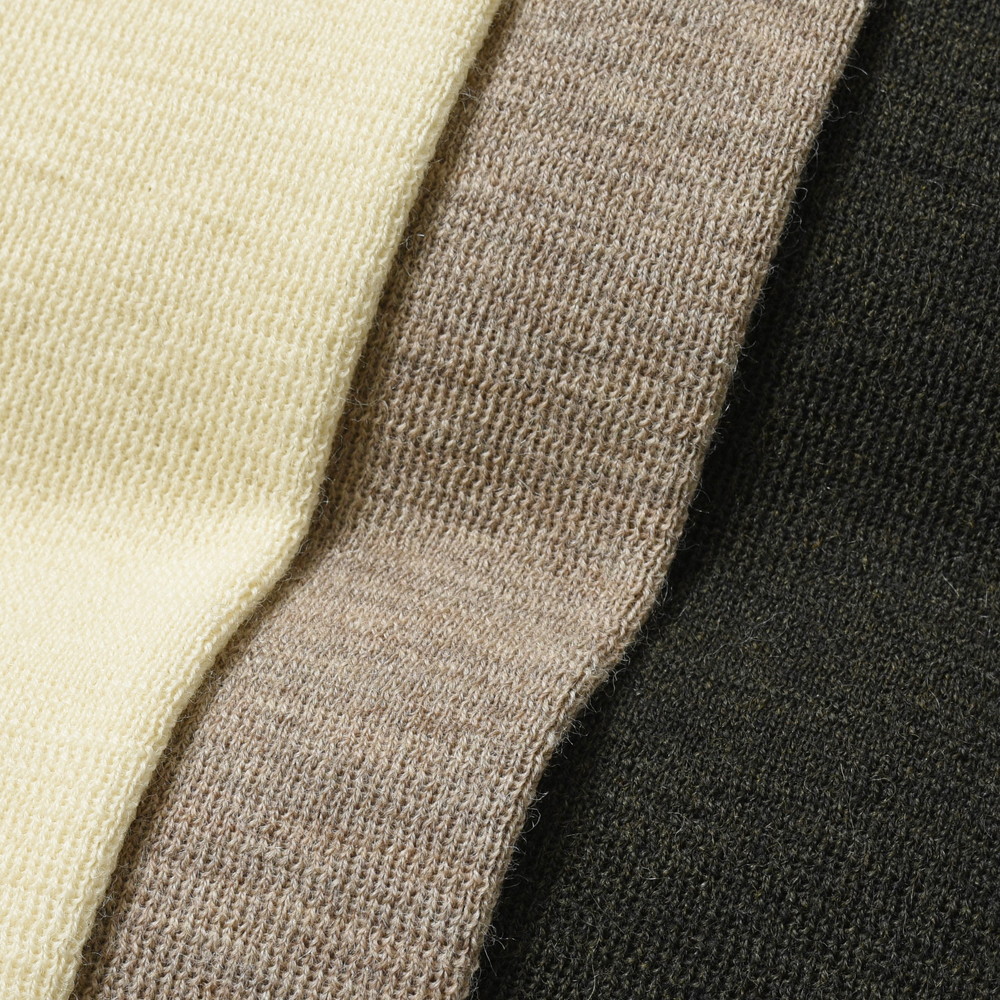 非常に軽やかな見え方で、ニットの表面感も凹凸はありつつざっくりしていないプレーンさがあり、何と合わせても上品に着られる一着だと思います。