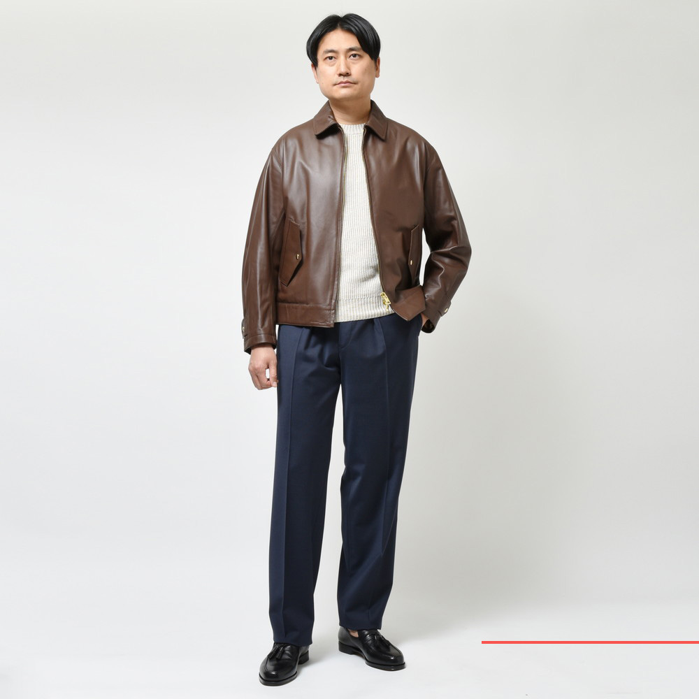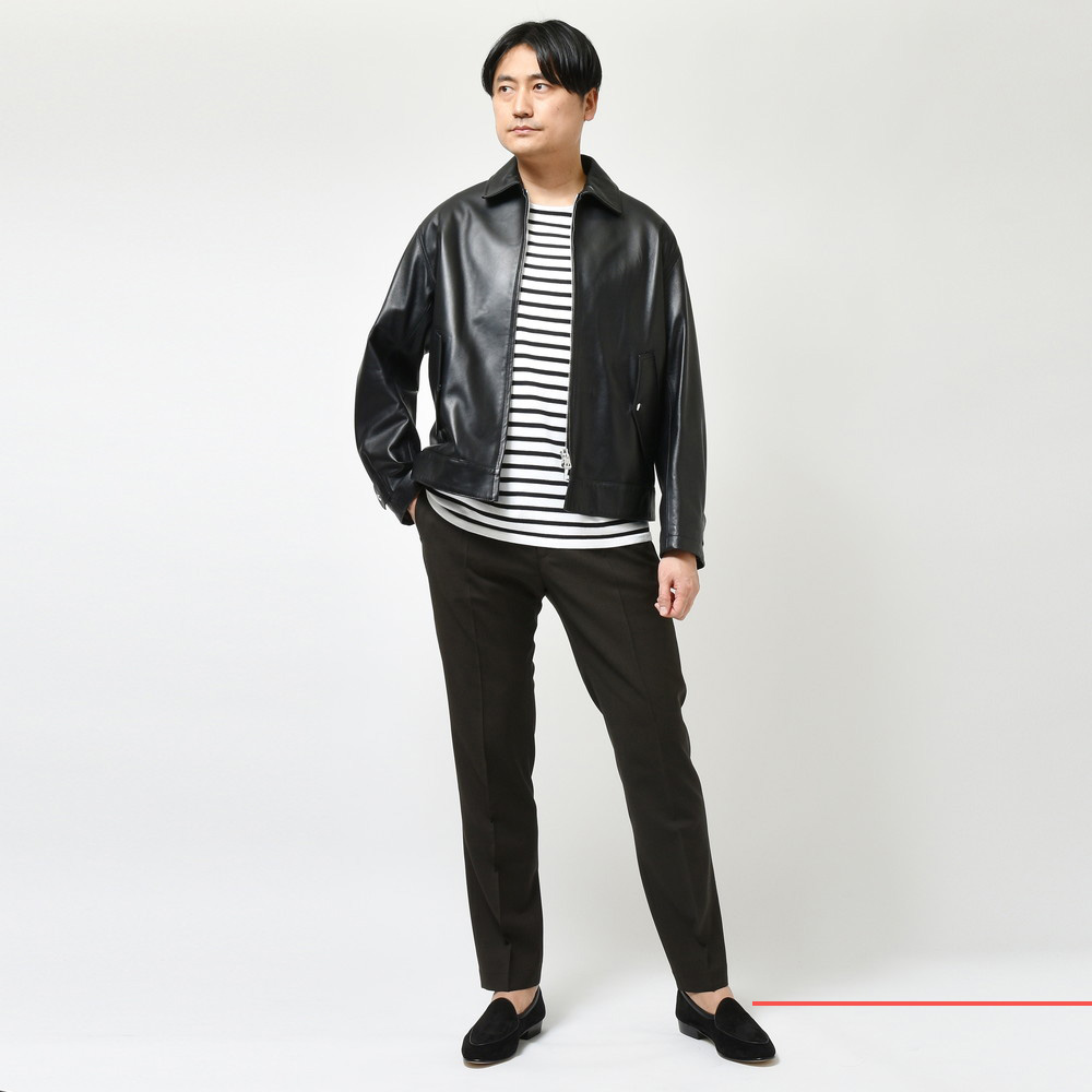 ゆとりのあるシルエットなのでワイドなパンツを持ってきても上下のコントラストが付きにくいのもポイントでして、所謂シャープさを大事にしたレザーブルゾンとは違った見え方になります。攻めつつも使い勝手がいい、そんな一着です。