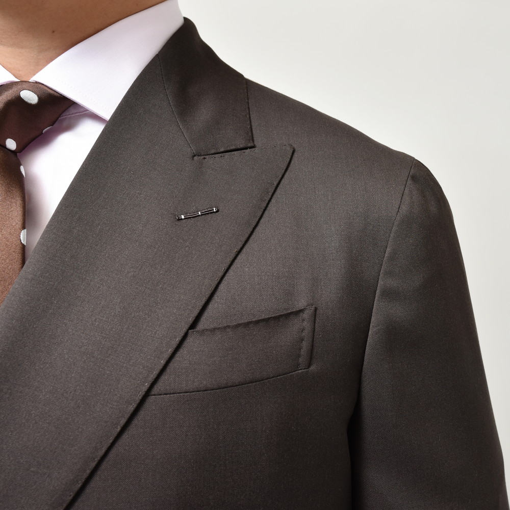 こちらは定番のダブルブレストスーツ。柔らかなカーブを描くラペルのラインが特徴で、突出した美意識を高い技術によって具現化しているフラッグシップモデルです。