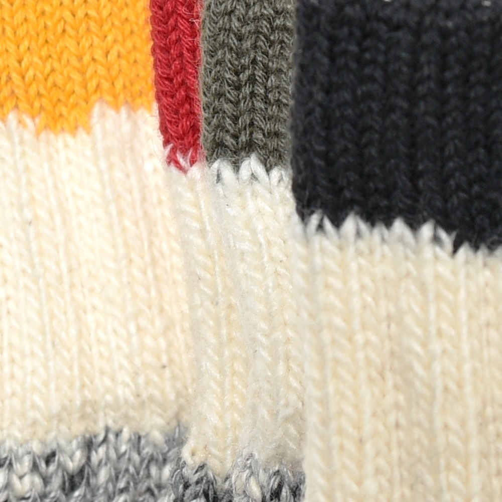 粒の粗い独特な杢調の糸で編み立てられたスラブ感の中に、一本のカラーラインが入ることでうまく調和のとれたデザインとなっています。