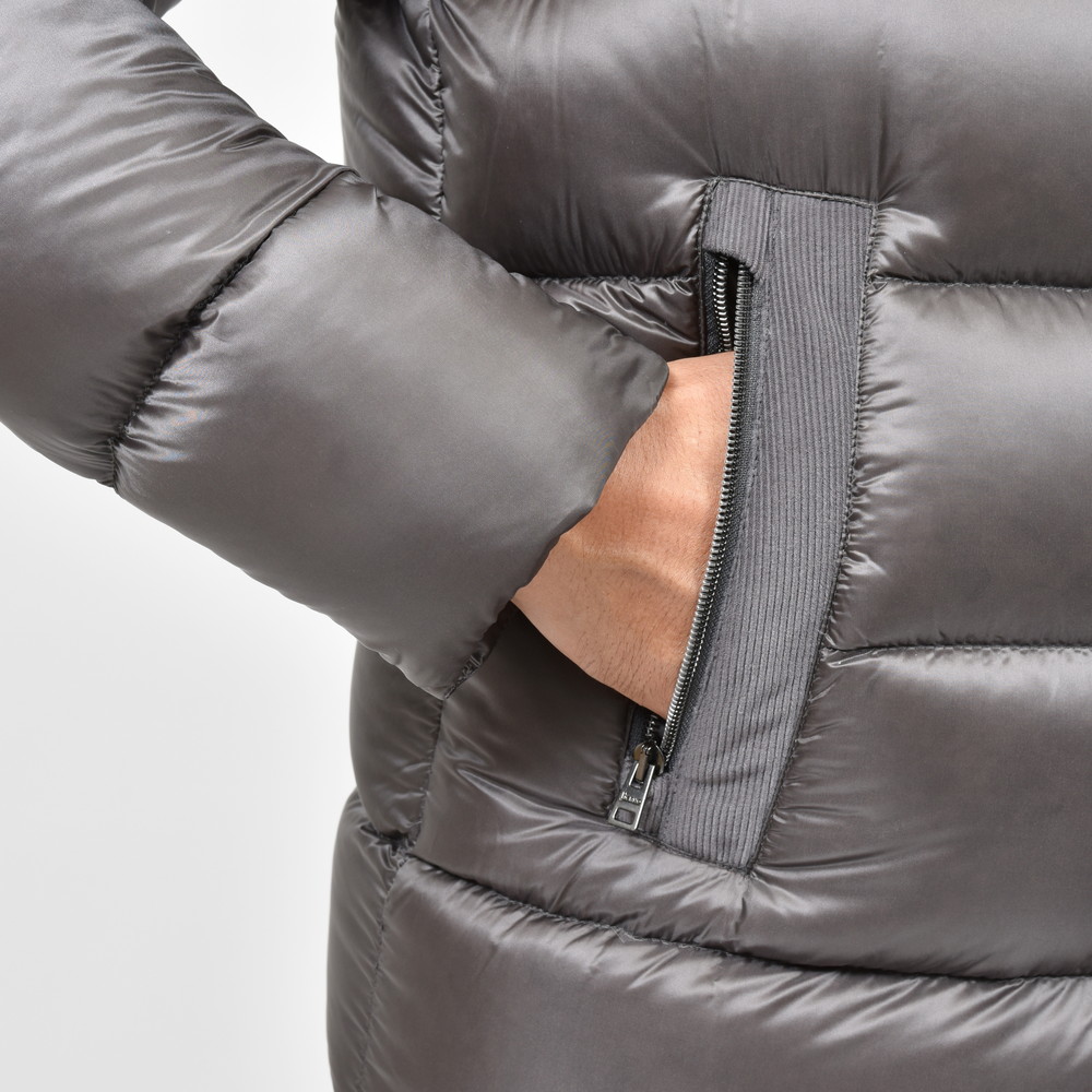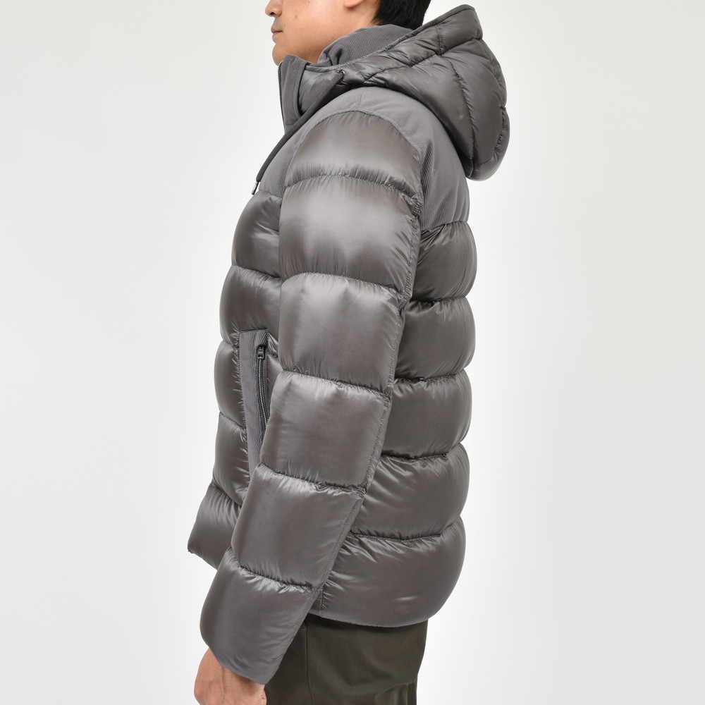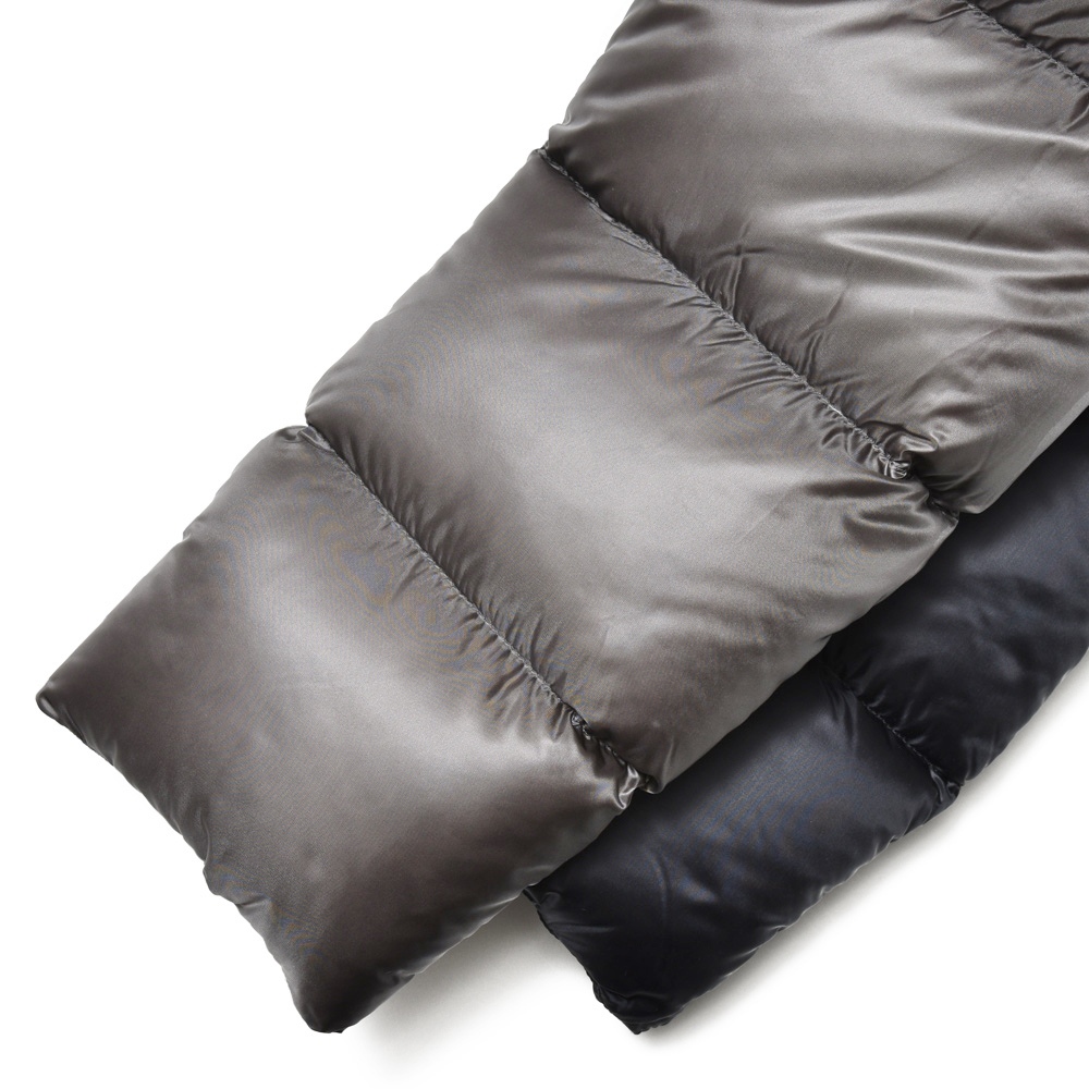 20デニールの超極細糸で織られた撥水ナイロン。圧倒的な軽さと上品な光沢が特徴。ダウンが吹き出し辛いダウンプルーフ加工を施している。インジェクション(ダウン直接封入)仕様で圧倒的な軽さを実現している。