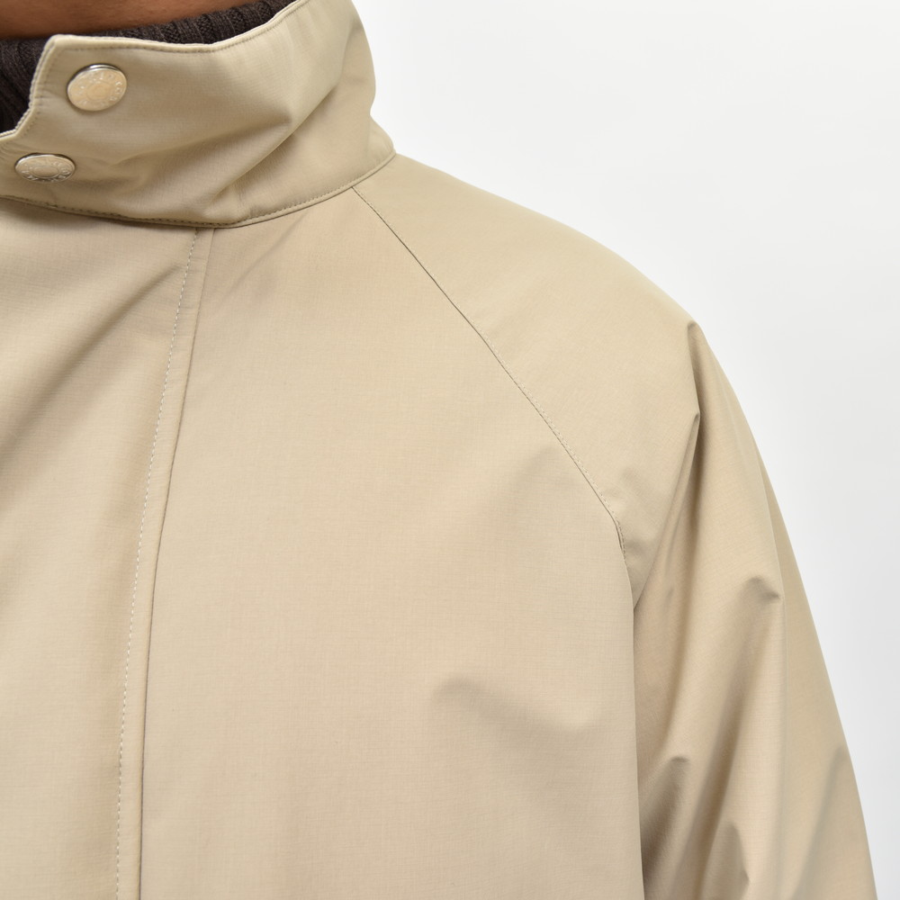 ゴム引きコートの佇まいで機能性コートを実現する試みの過程で誕生したレインテックはブランドの姿勢を如実に表すと同時に、表現の幅を広げることに一役買っているスペシャルファブリック。