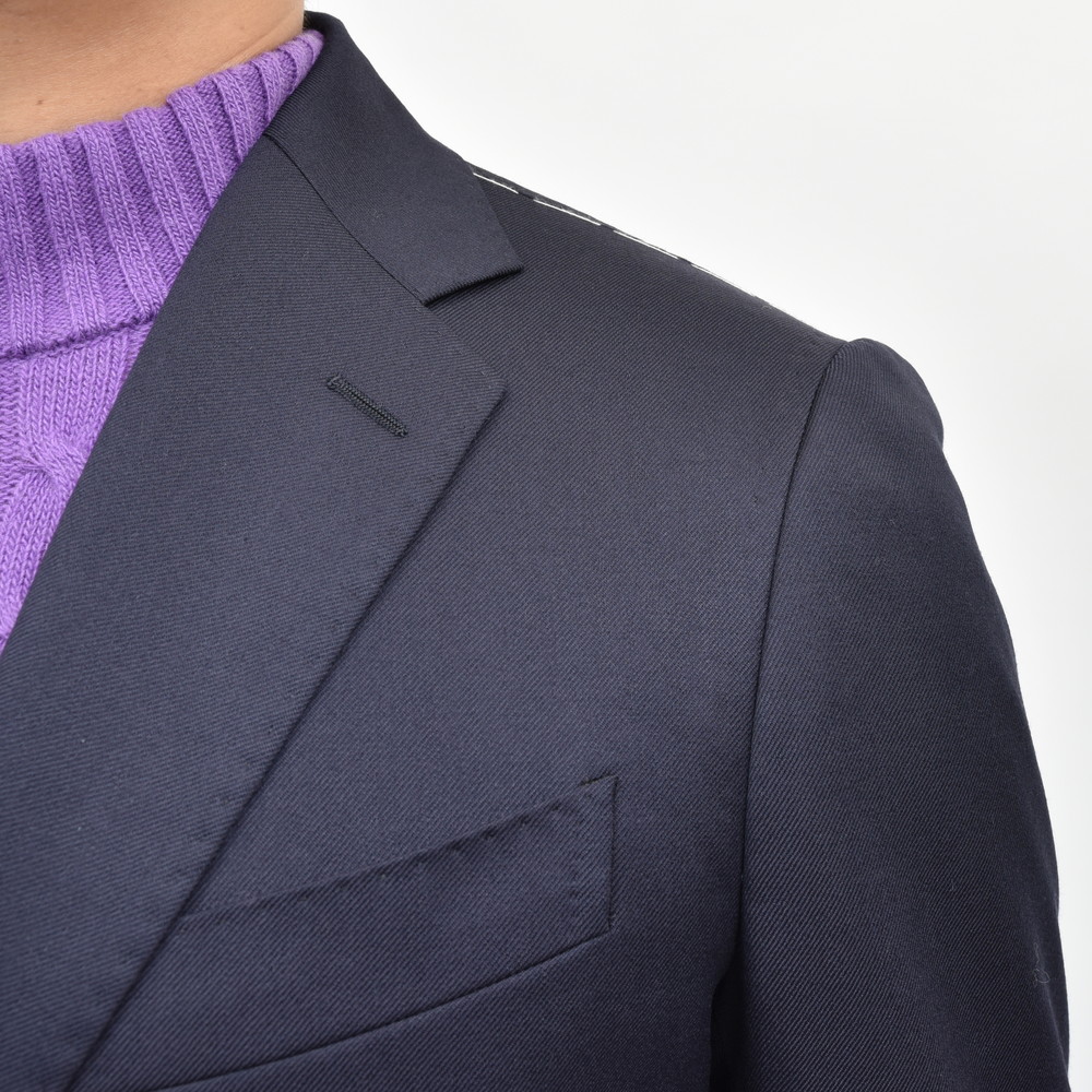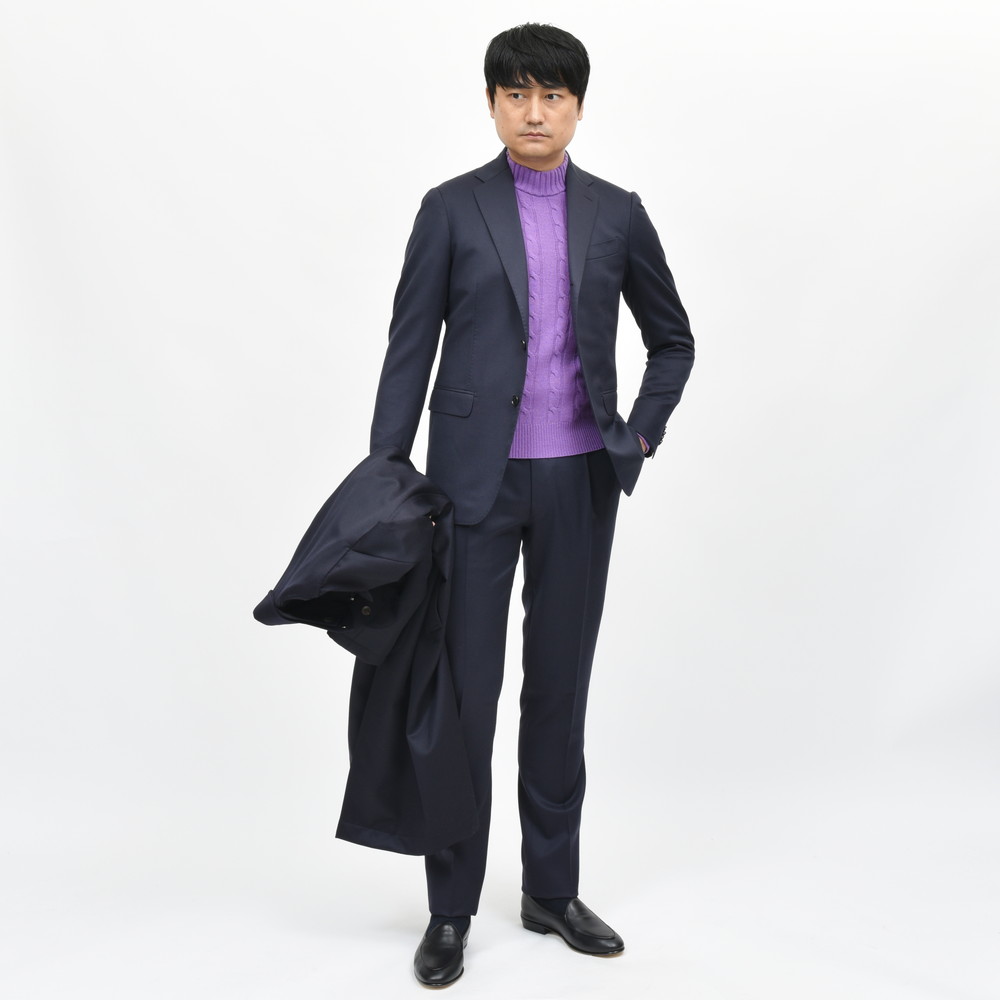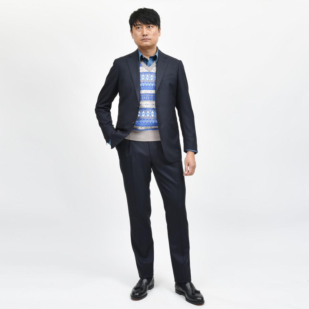 ワードローブにネイビースーツは絶対に必要、そんな強い思いを感じる一着です。何せ色違いが同系統のネイビーということから、「どっちでもいいやん」とは言わせない圧倒的なこだわりを感じます。