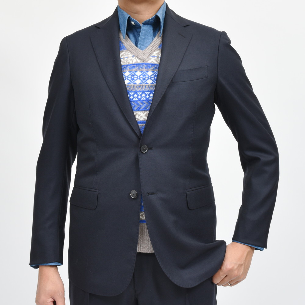 カラーはネイビーとダークネイビーをご用意、ある意味この2色とグレーのスーツがあればワードローブは完成してしまう気もしますね、、、。