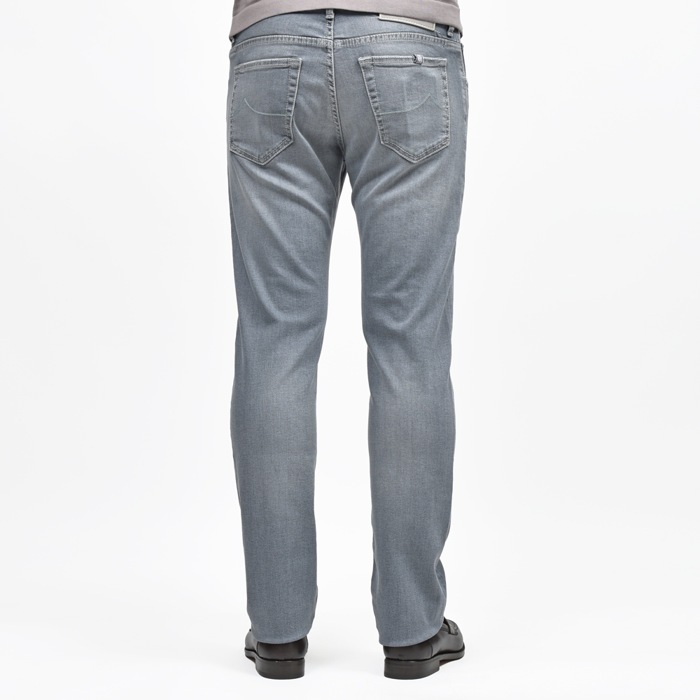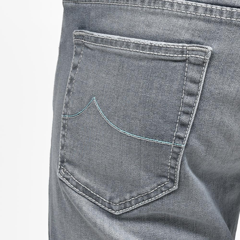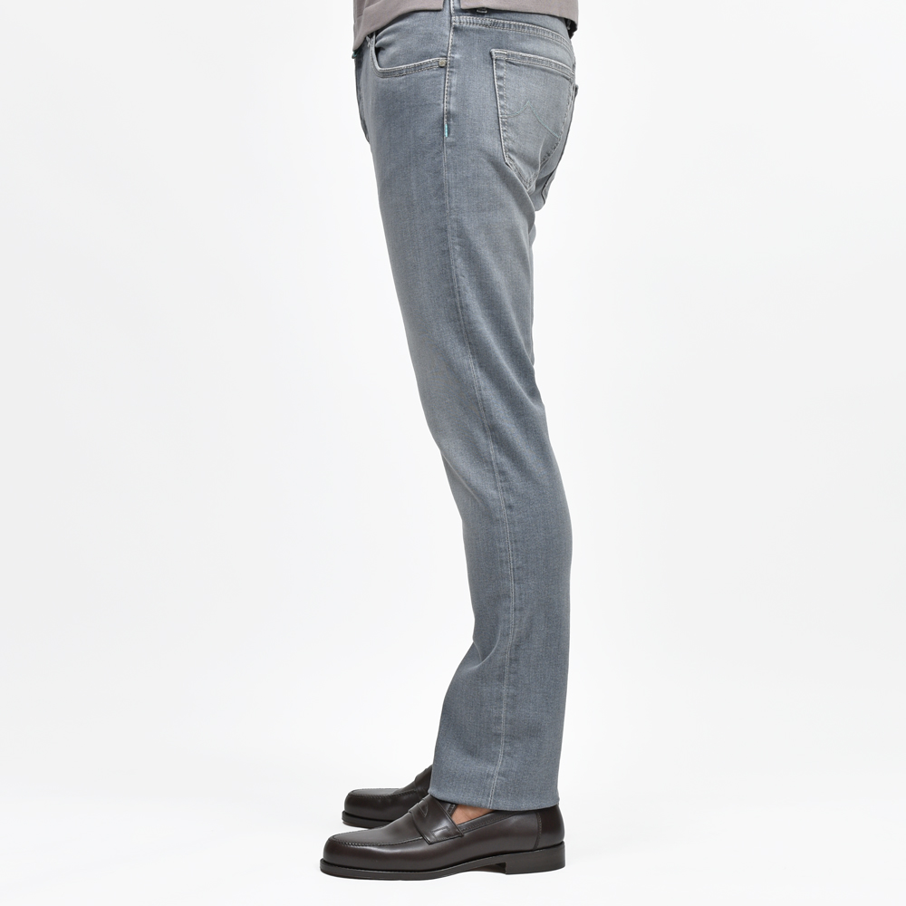 バイオウォッシュ加工によるブラックをかなり退色させたようなグレーの絶妙な色合いで、特に膝の表裏やヒップ付近で濃淡をつけることでヴィンテージのような風合いに。とはいえそういったデニム特有の野暮ったさを感じさせないのはJACOB COHENでも人気があり美しいシルエットが特徴のモデルとなるNICKのイタリアらしいシャープさによるところかと思います。