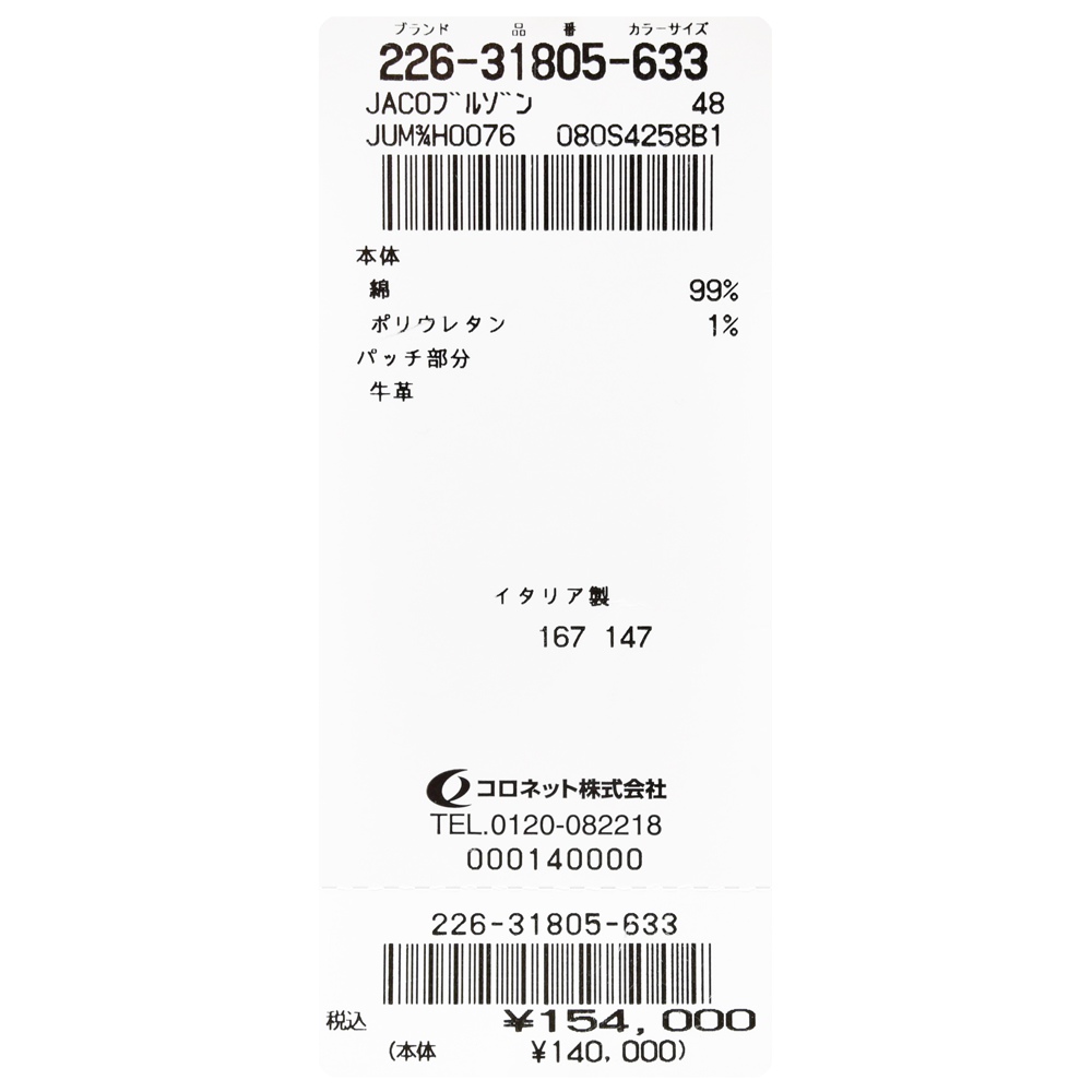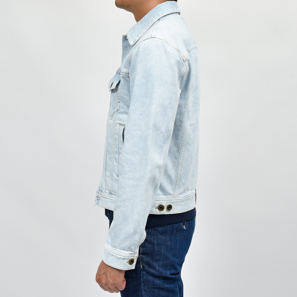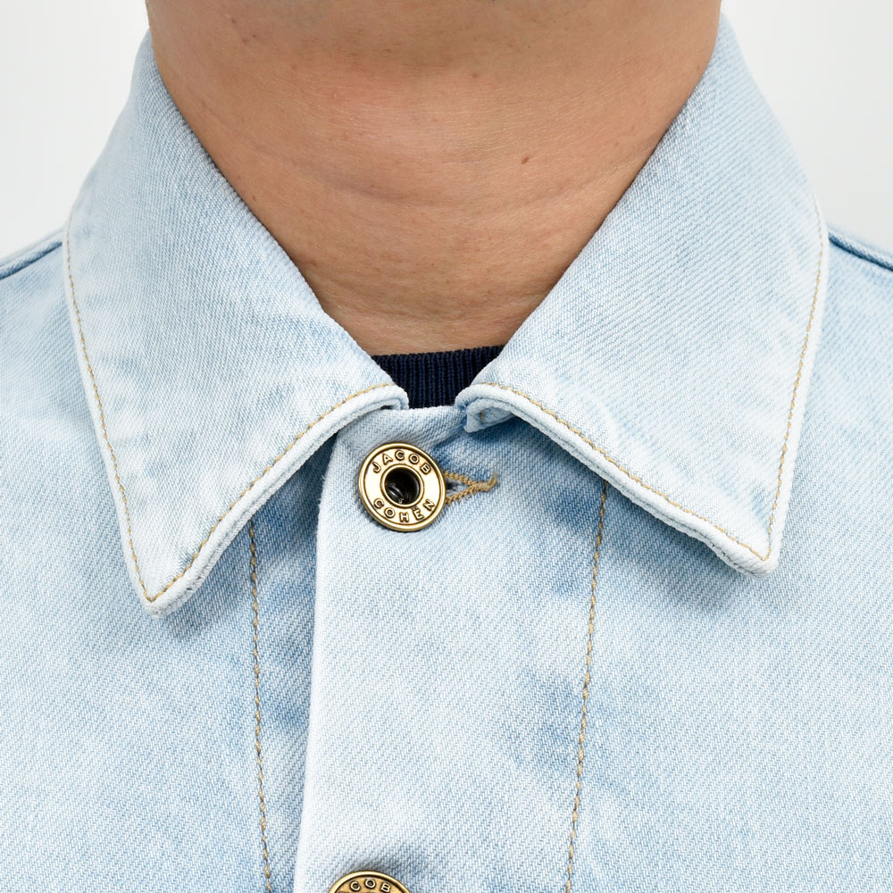 こちらは毎シーズンリリースされているトラッカージャケットよりもややワークなムードを感じさせる仕上がりでして、特徴的なウォッシュの具合もありますが今回はリベットボタンの仕様が定番の形からヴィンテージモチーフのものに変更されているのもポイント。ボタン変更自体は同ブランドのジーンズでも見かけますが、ジャケットではあまり見ない仕様です。こういったさり気ない変化で与える印象を変化させる手法は細かいディテールまでこだわるJACOB COHENの真骨頂ではないでしょうか。