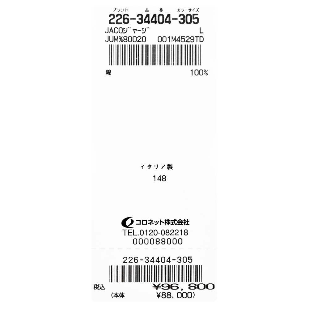 今回はロゴなしか、、、残念、、、と思っていましたがそこはJACOB、しっかりと期待に応えて襟の後ろ部分に同色でブランドネームが入っています、さすがですね。