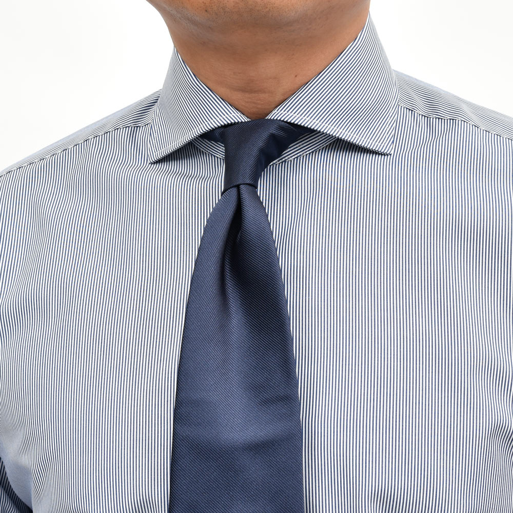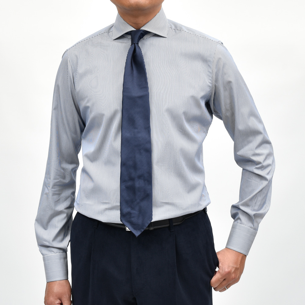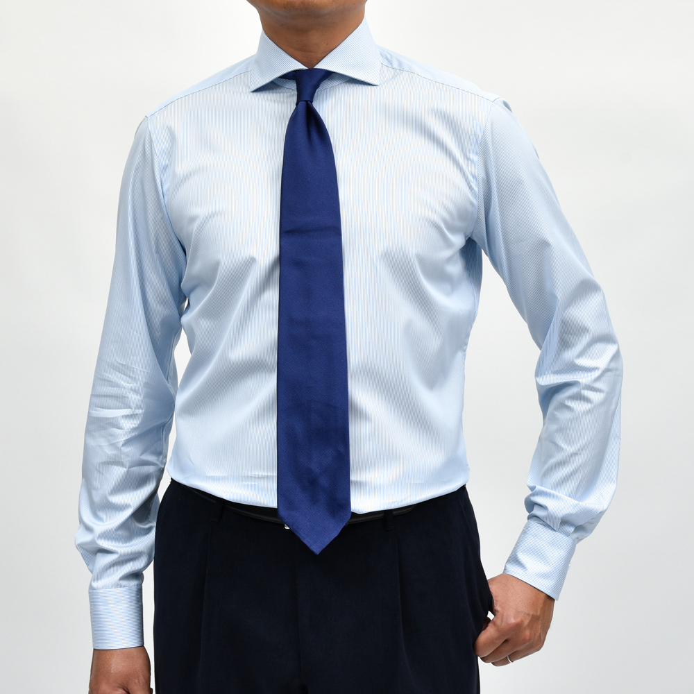 ブルー系のストライプはドレススタイルにおいて非常に便利なアイテムでして、特にナローなタイプはネクタイの柄を選ばずに合わせられるので重宝しますよね。