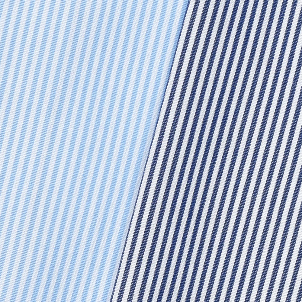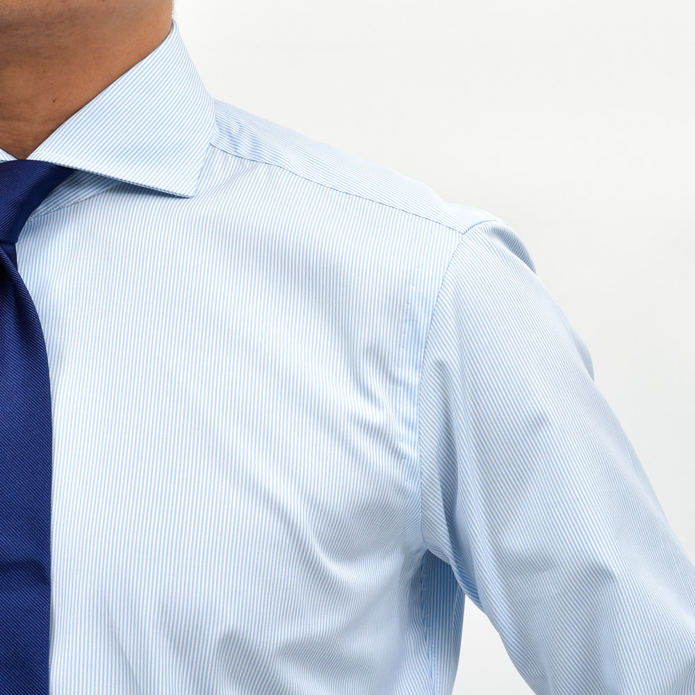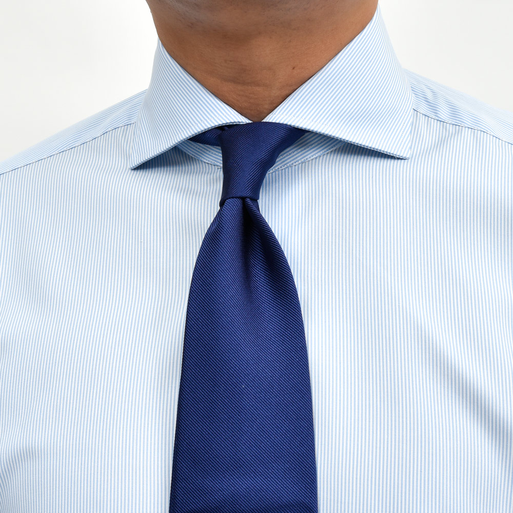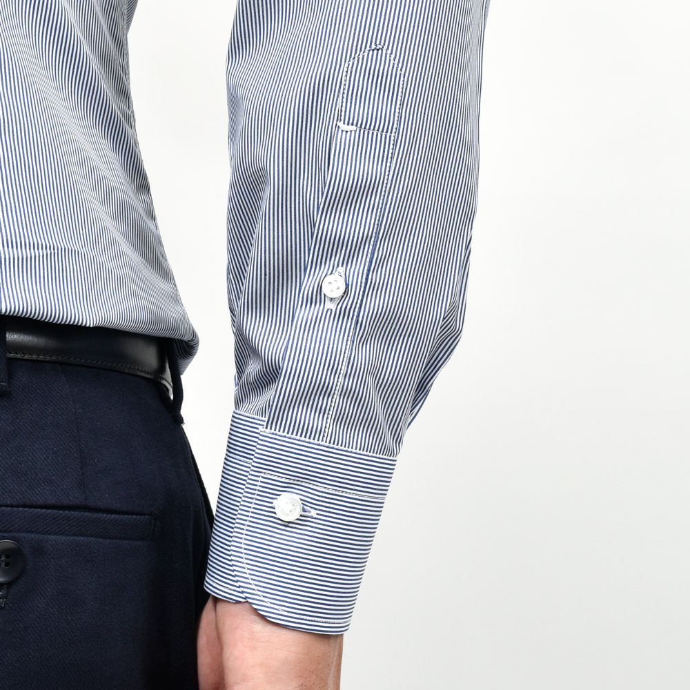 ブルー系のストライプはドレススタイルにおいて非常に便利なアイテムでして、特にナローなタイプはネクタイの柄を選ばずに合わせられるので重宝しますよね。