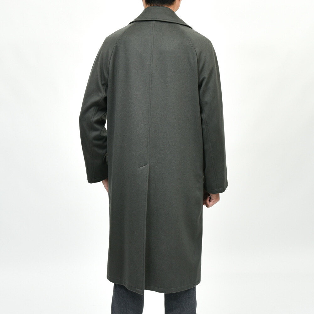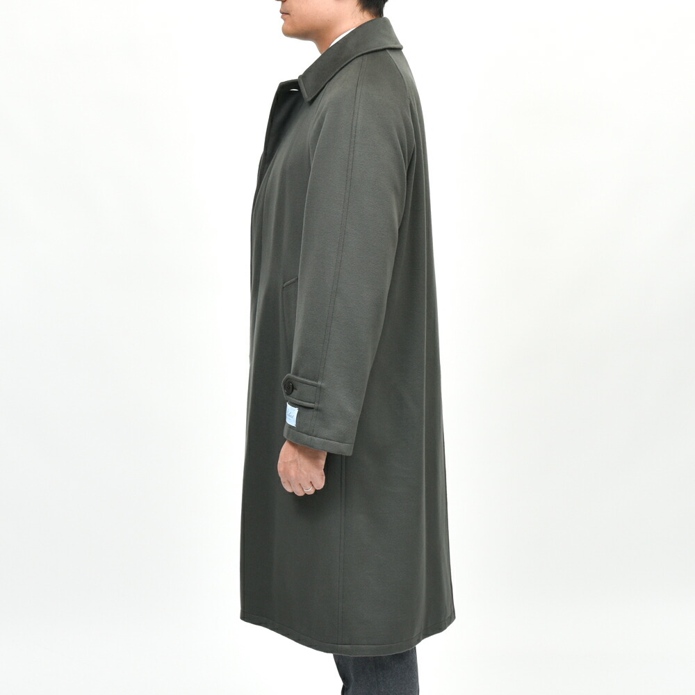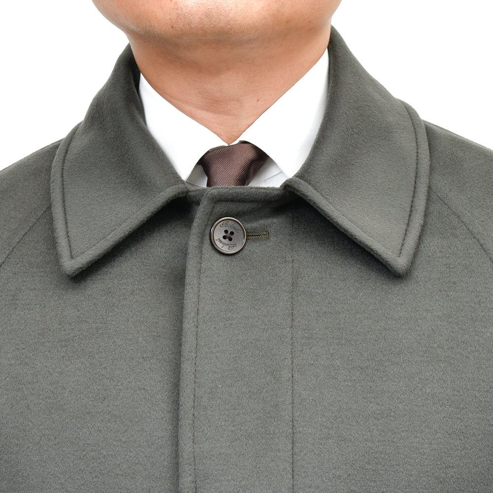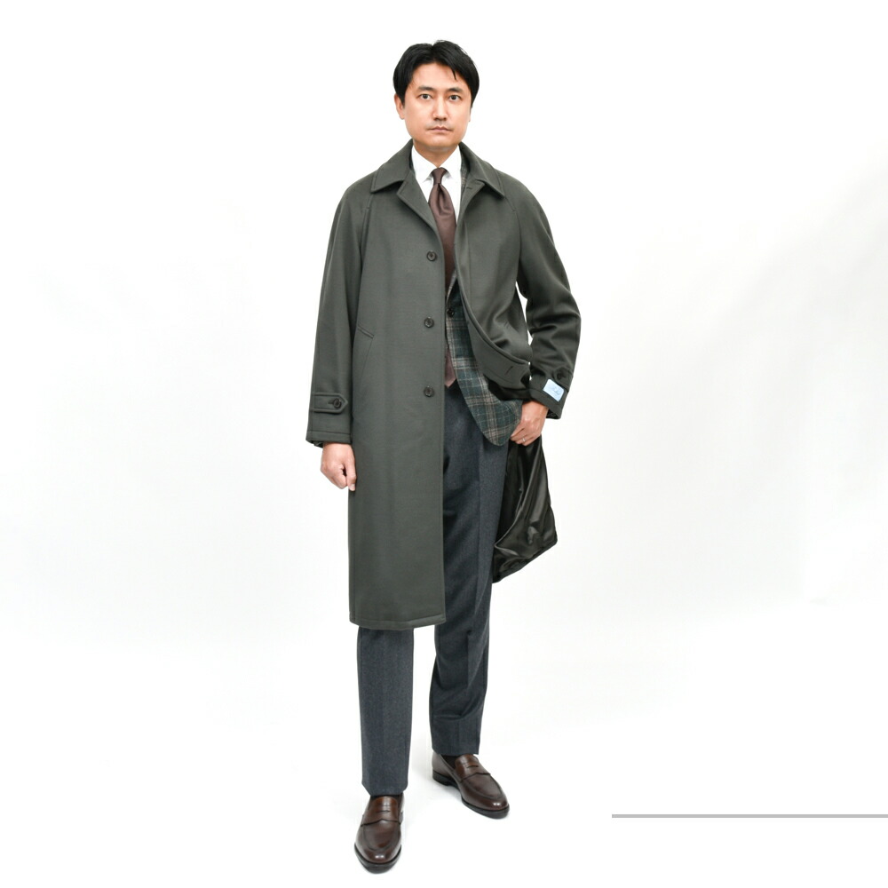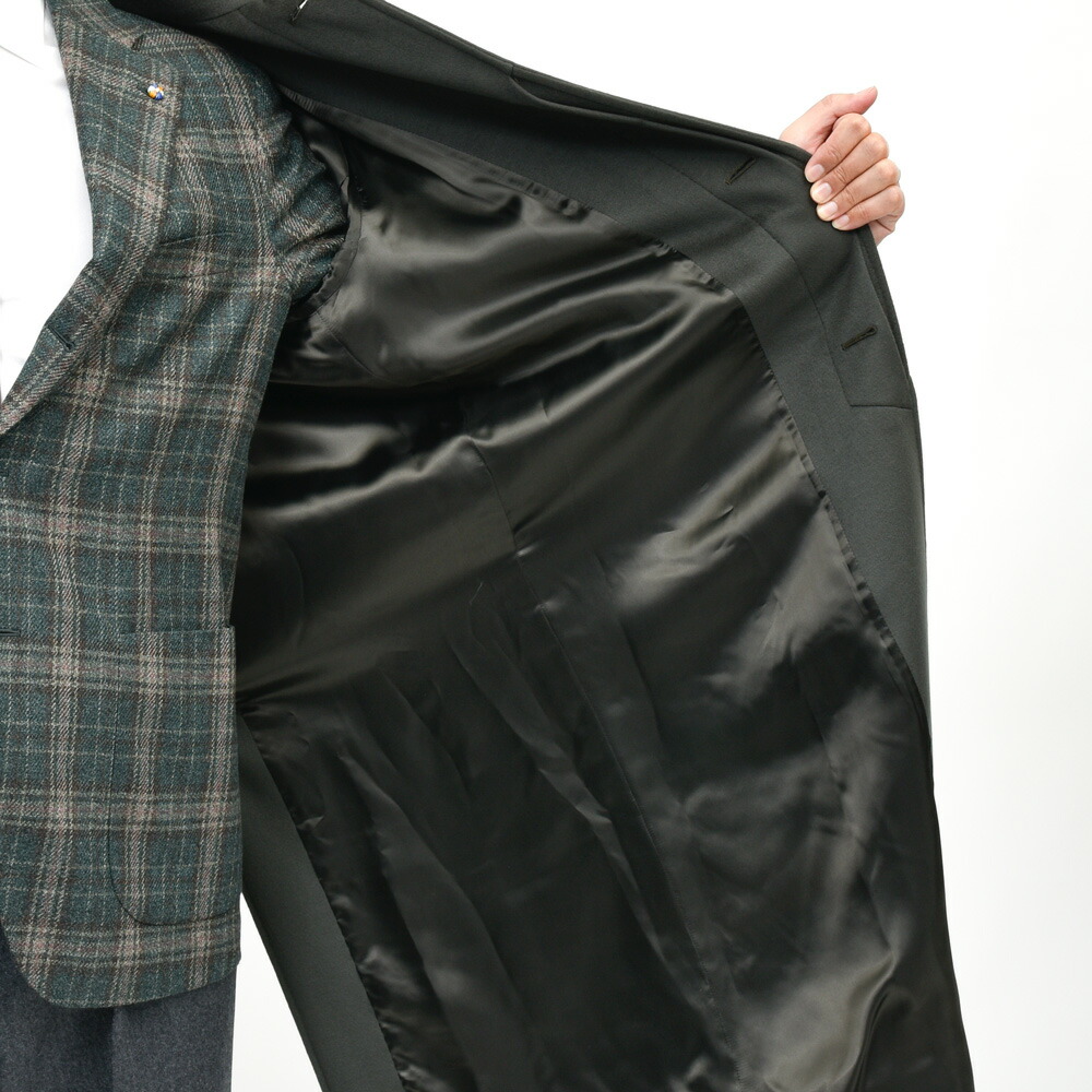 深いオリーブの発色と上品な光沢は生地の高いグレードと仕上げの良さによるもので、着用すると美しく体に沿う落ち感が出ます。