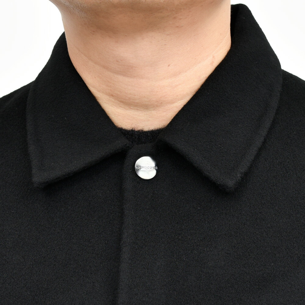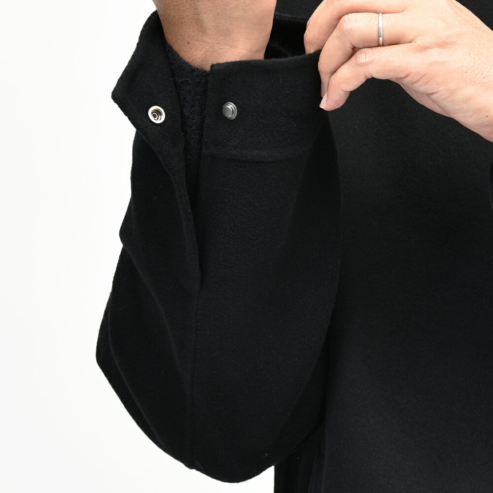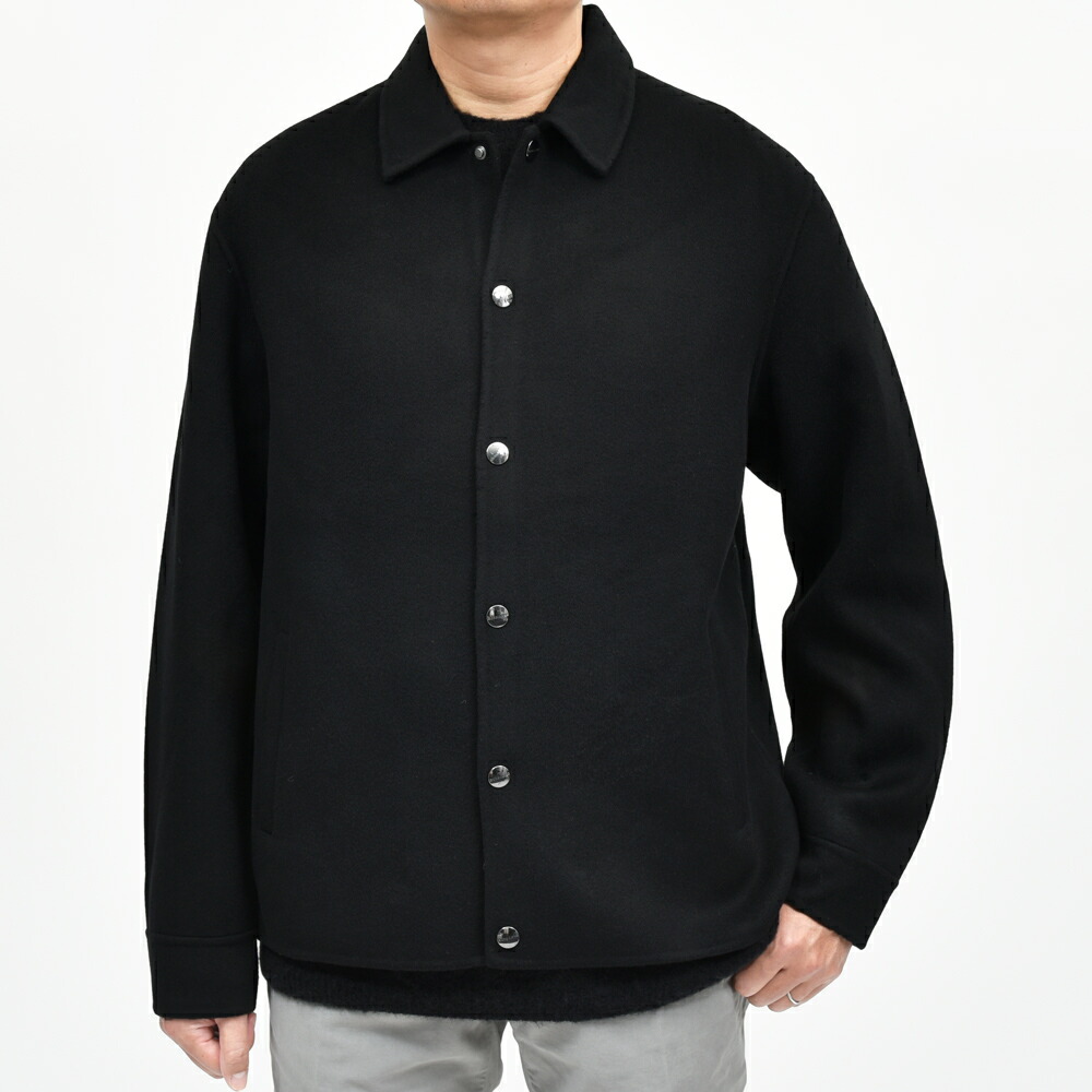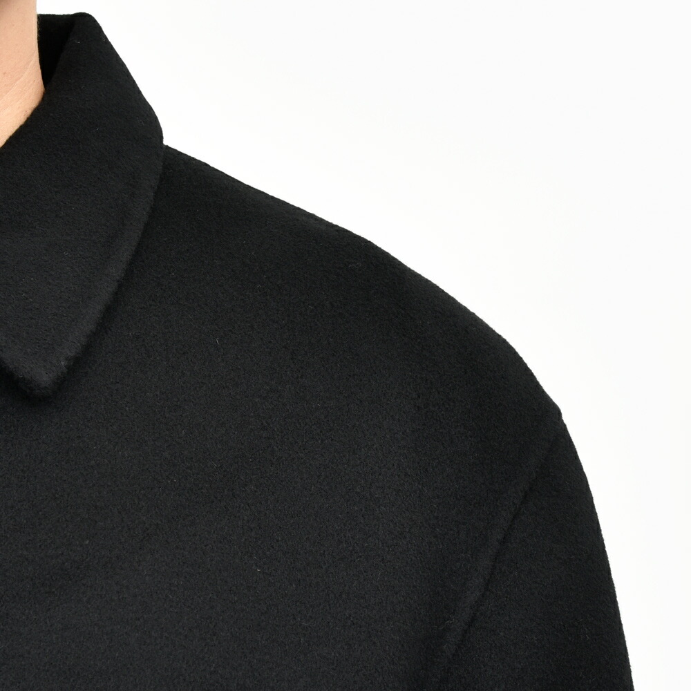 シンプルなコーチジャケットタイプ、スナップボタンでフロントを留めるカジュアルなデザインですが、襟付きなので一定の品格が備わっており、さらにウールカシミアのダブルフェイスで仕立てることでグッと優雅に仕上がっています。