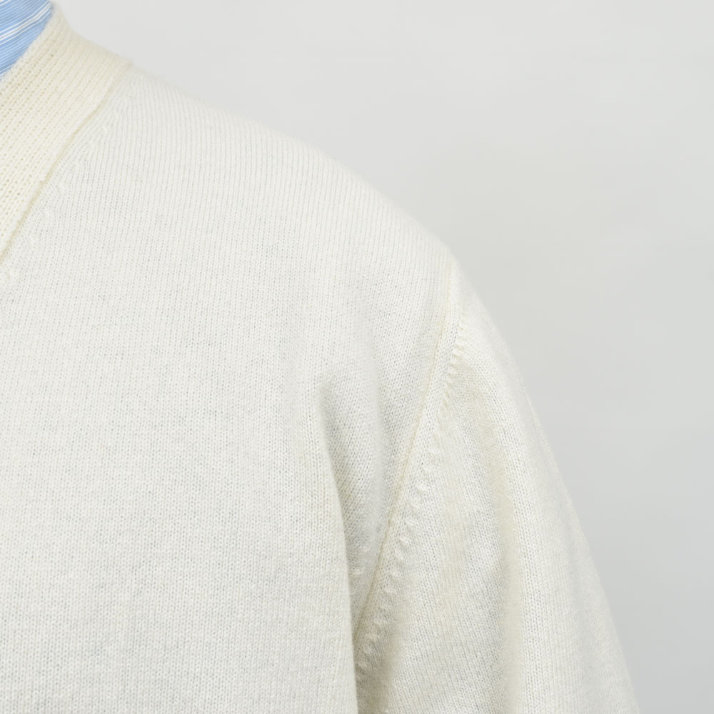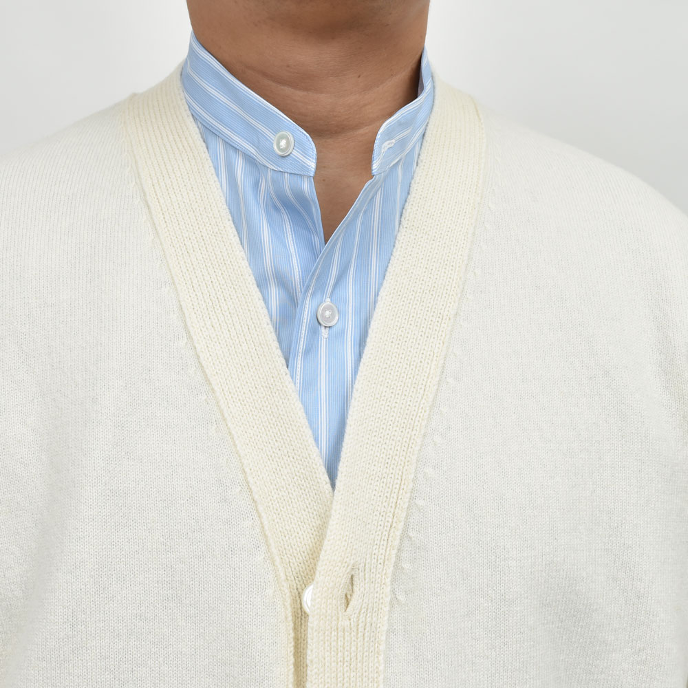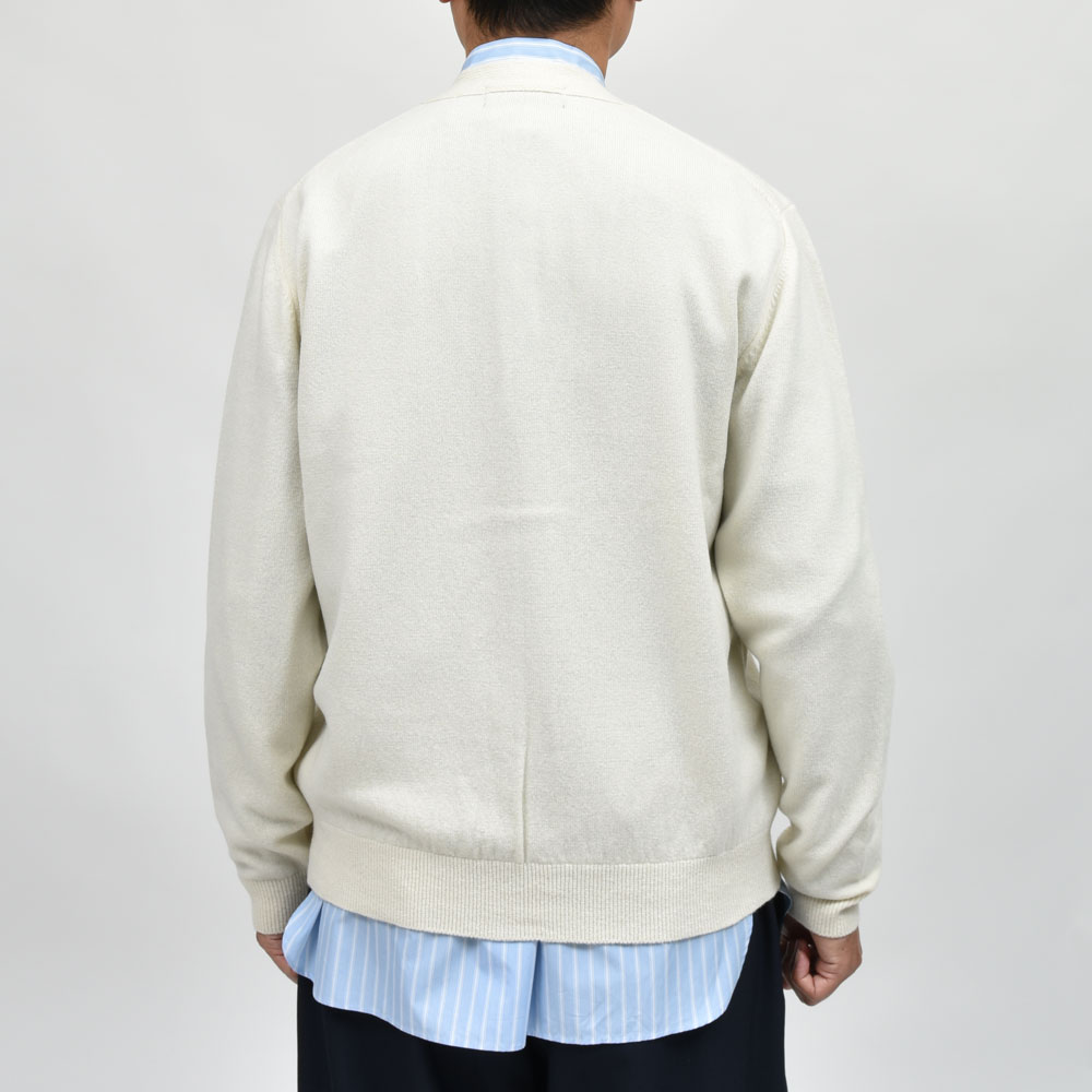 AMBELL(アンベル)とbalconeの協業プロジェクトであるKEY PIECEライン、普遍的でありながらも何処かモダンさを感じさせるコレクションを展開しています。こちらはメンズでは欠かせない存在であるVネックのカーディガン、ご覧いただく通り至ってベーシックな気を衒わないタイプのアイテムになっています。