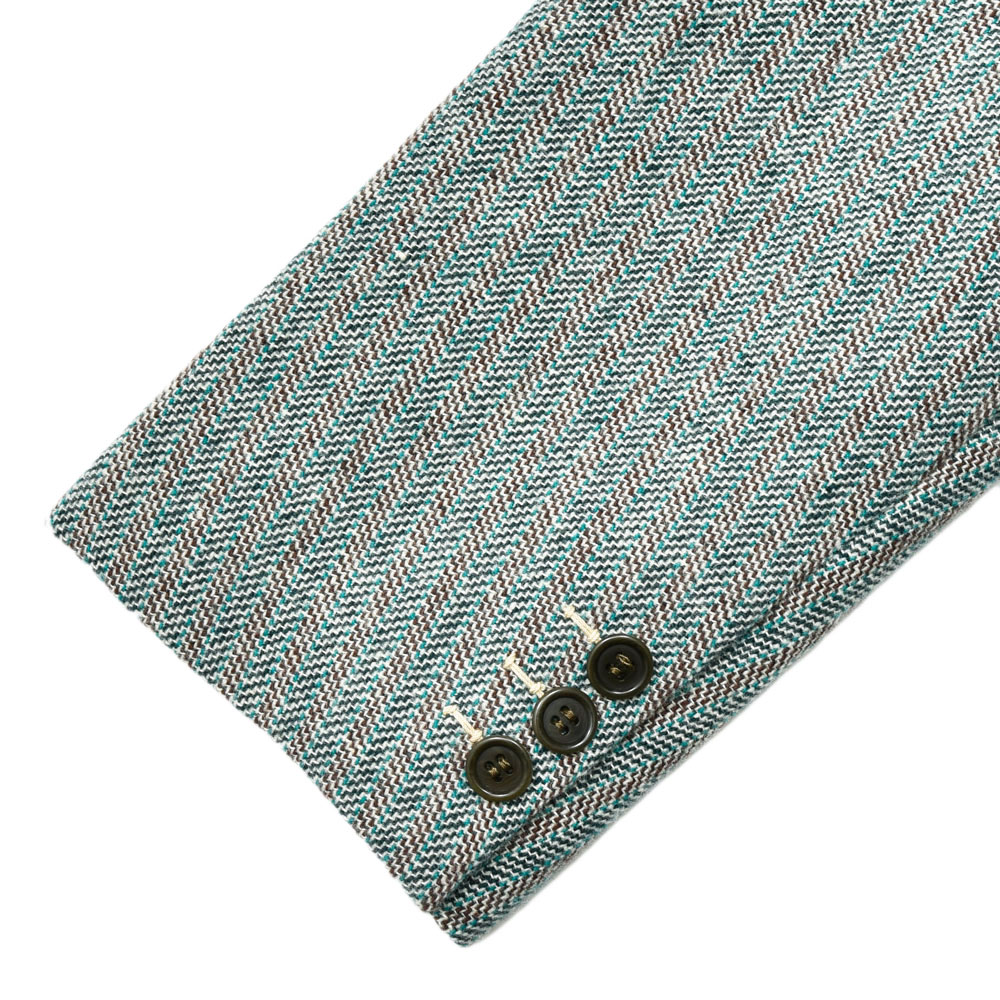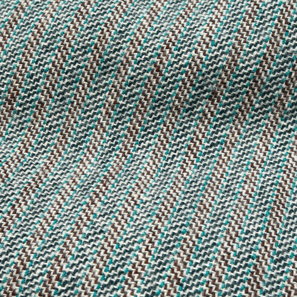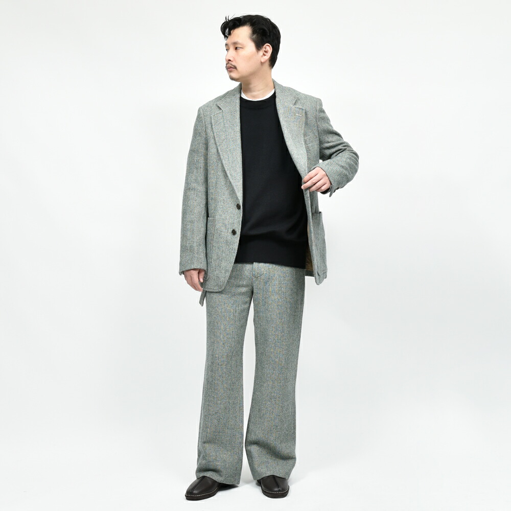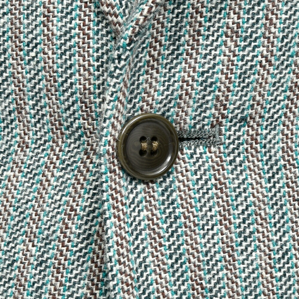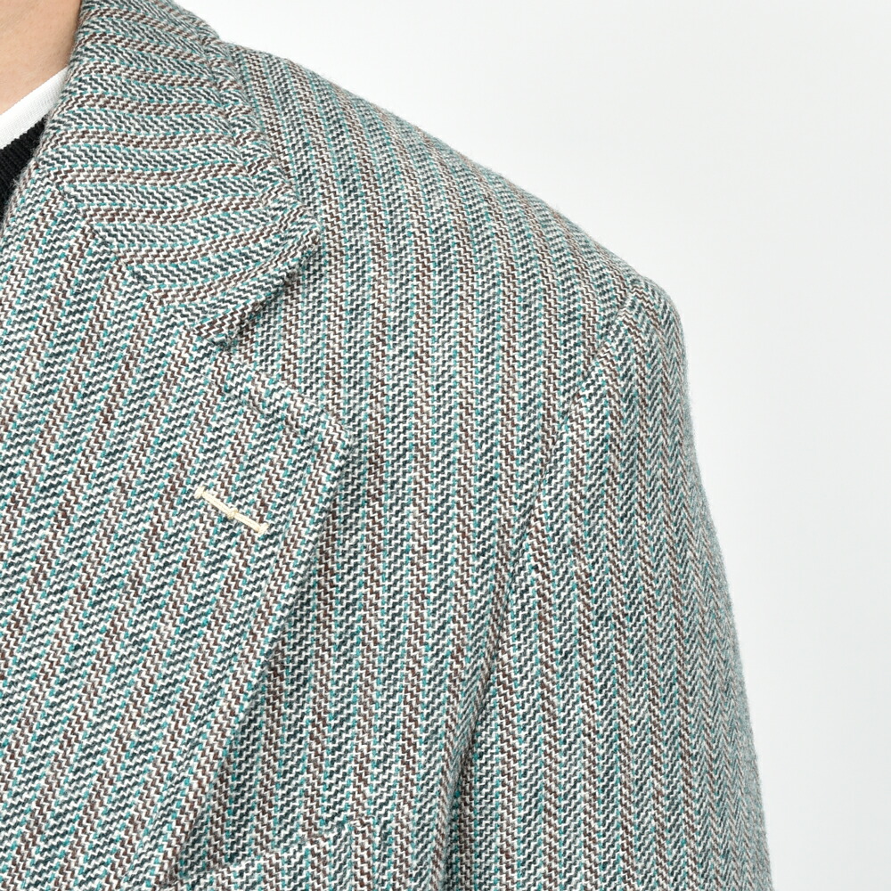 ヴィンテージのようなムード漂うmando(マンド)一着、やはり特筆すべきは生地使いでしょうか。グリーン、ブラウン、ホワイトをベースにしたライトツィードの生地、ストライプのような構成になっているものは中々見つからないタイプのものだと思います。