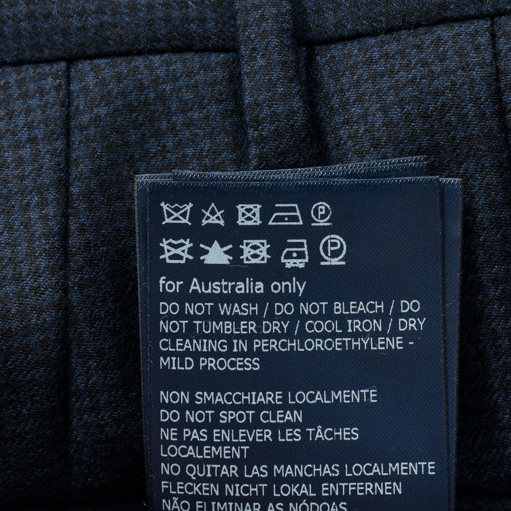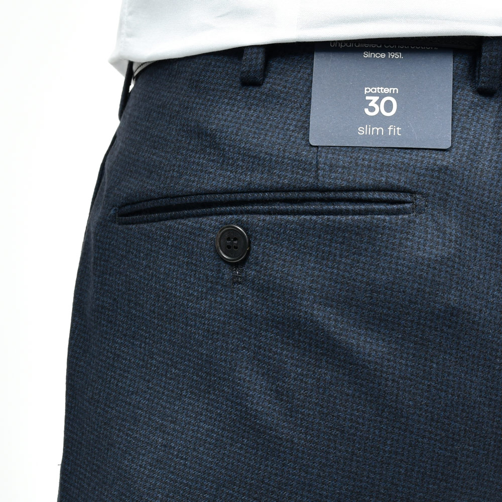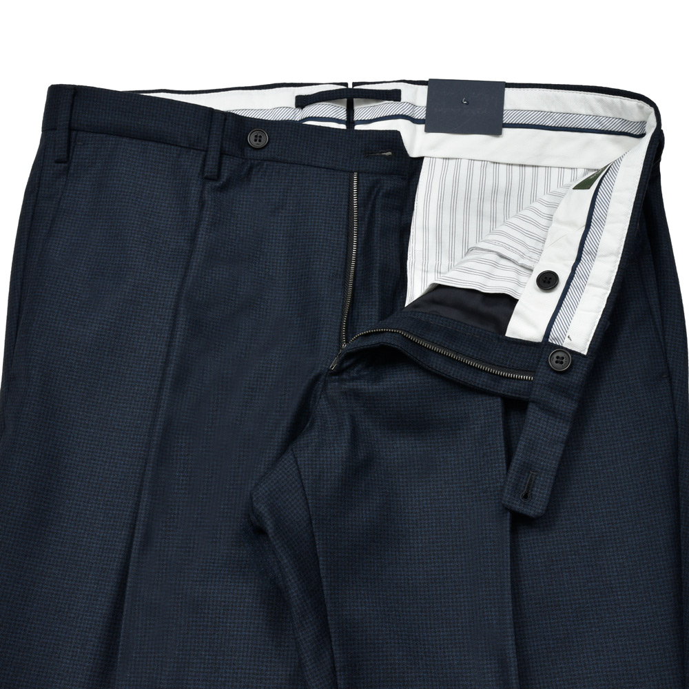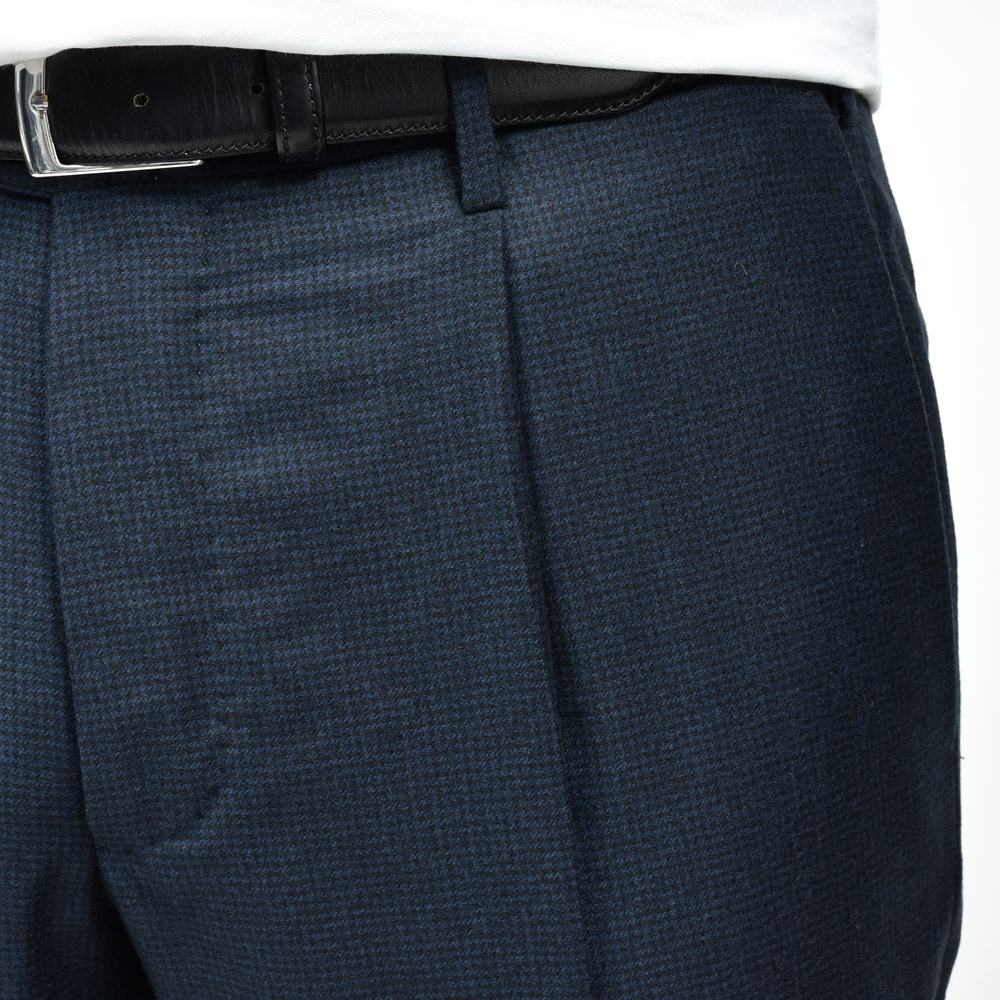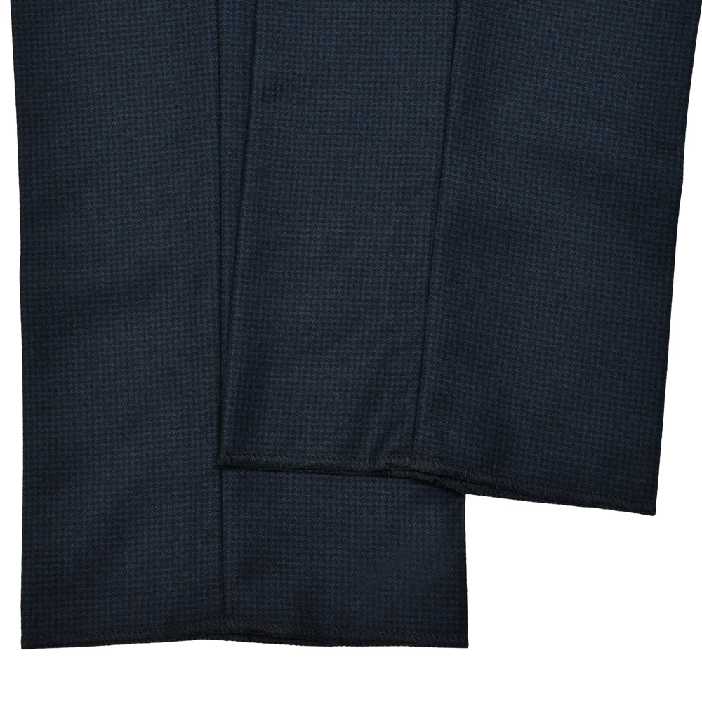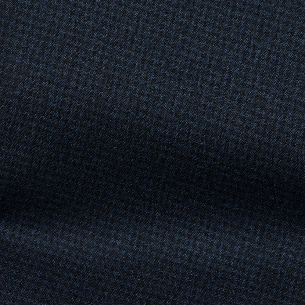 SUPER100’sウールを使用したウーステッドフランネル生地は、繊細なマイクロハウンドトゥース柄をネイビーとブラックで織り上げ、奥行きのある上品な表情を生み出しています。