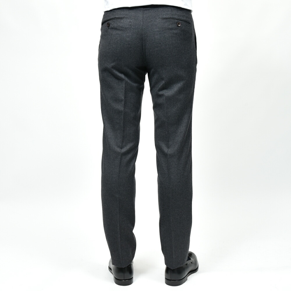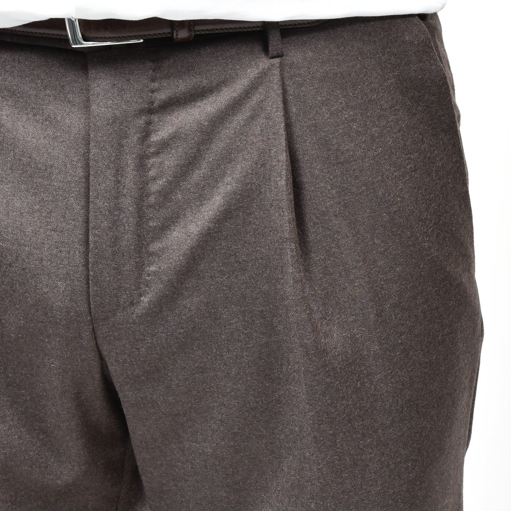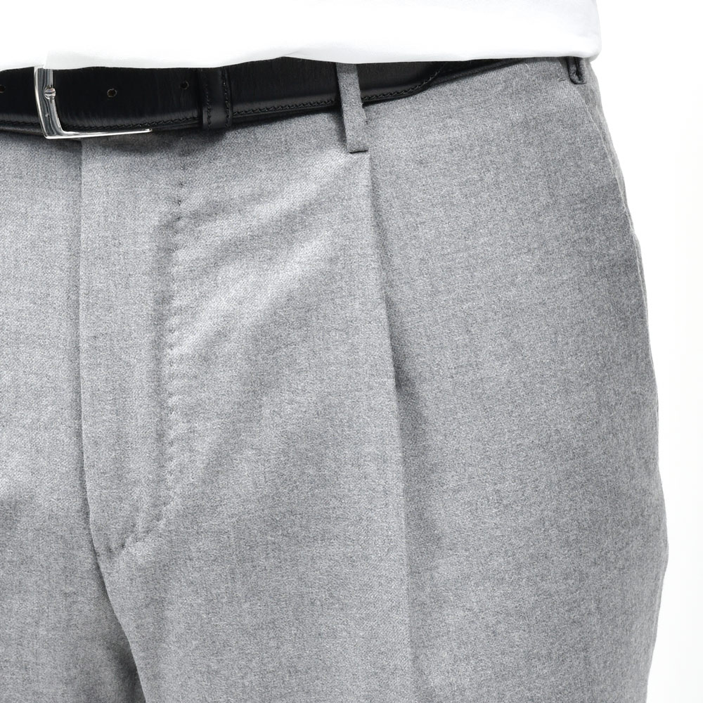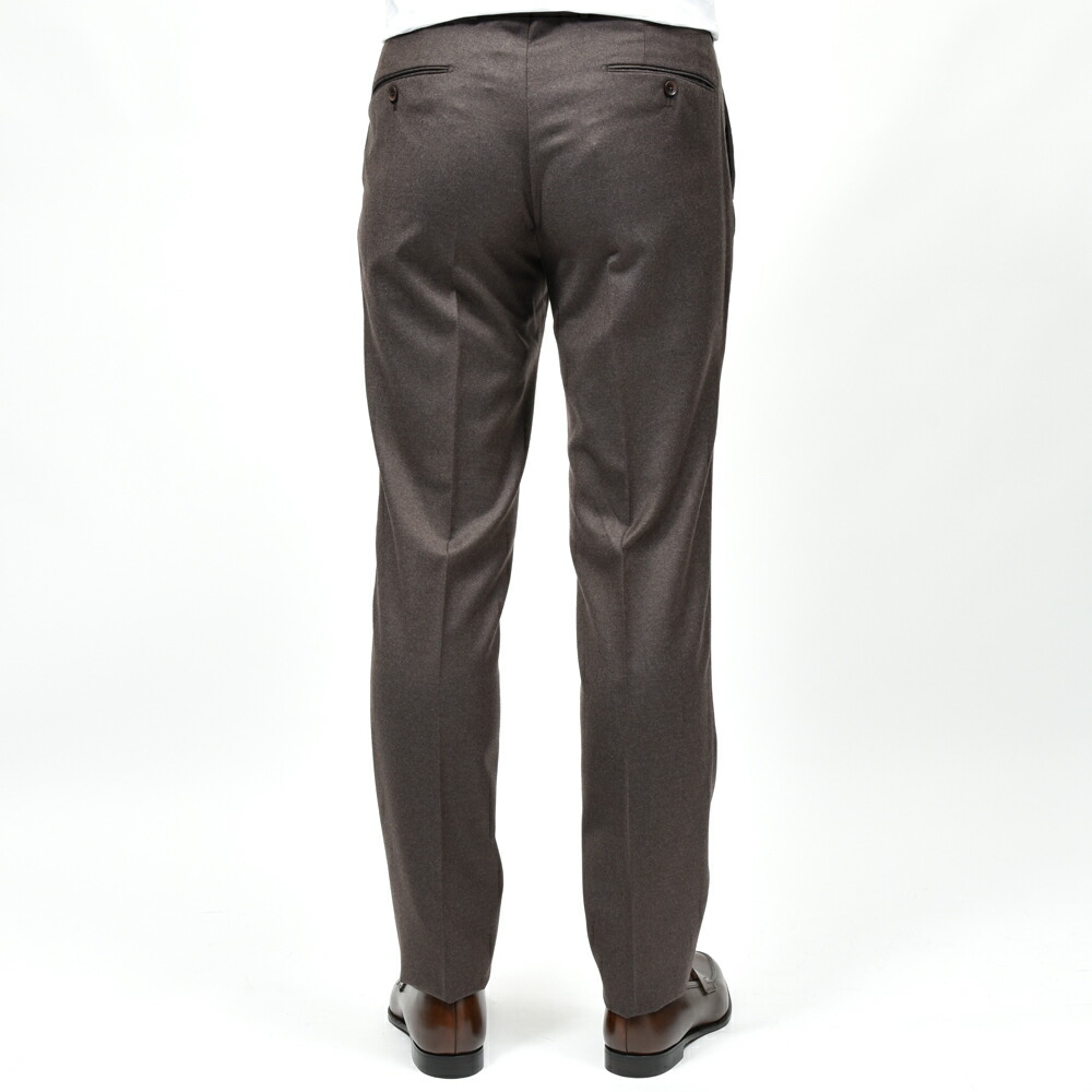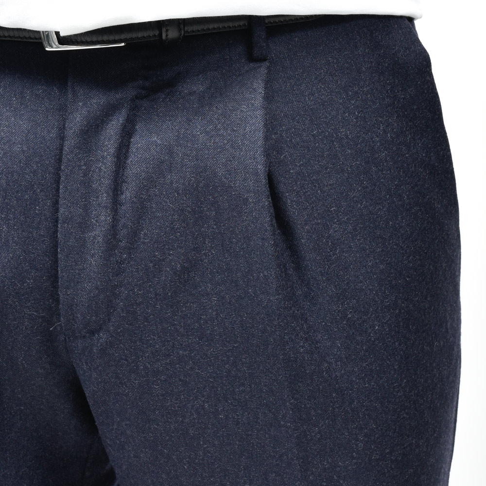 SUPER100’sウールを使用したフランネル生地は、柔らかさと適度なコシを併せ持ち、上品な起毛感を湛えています。