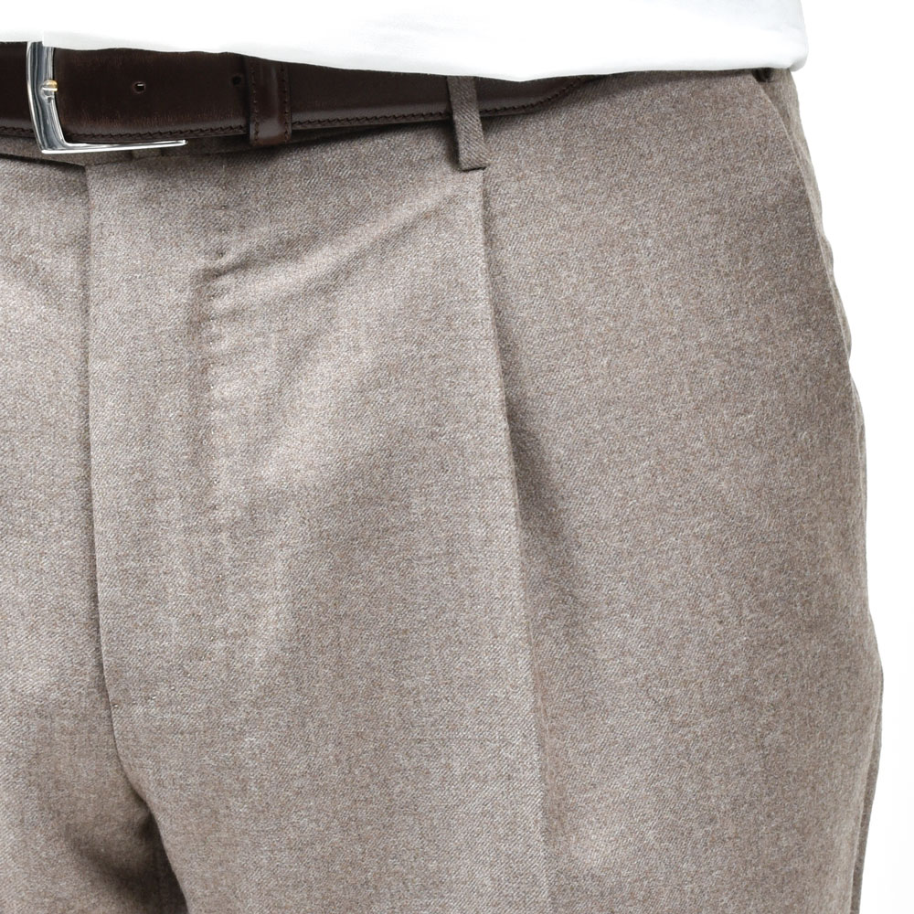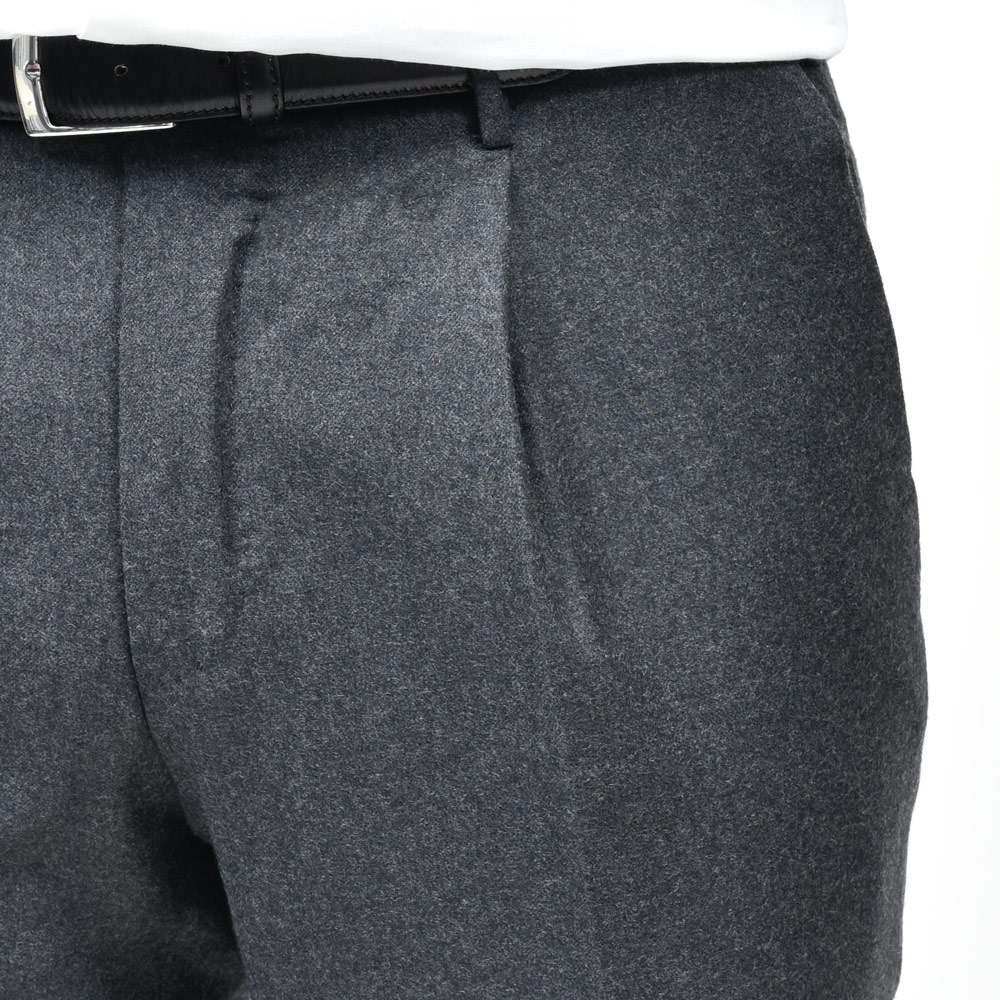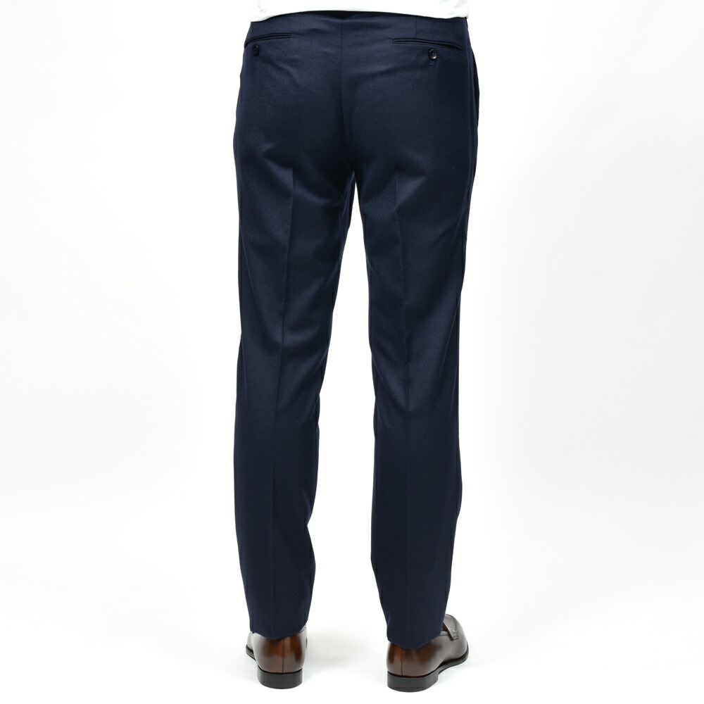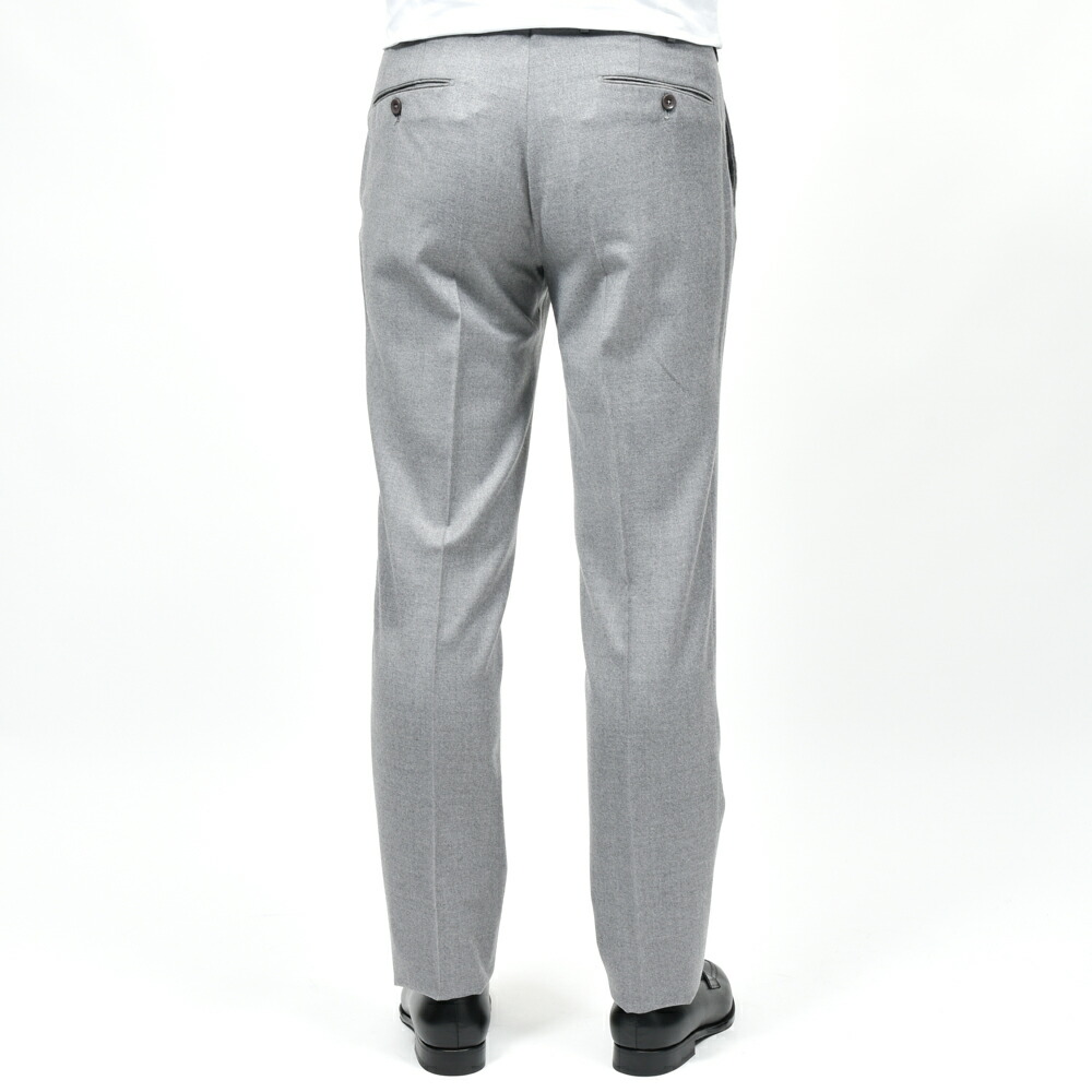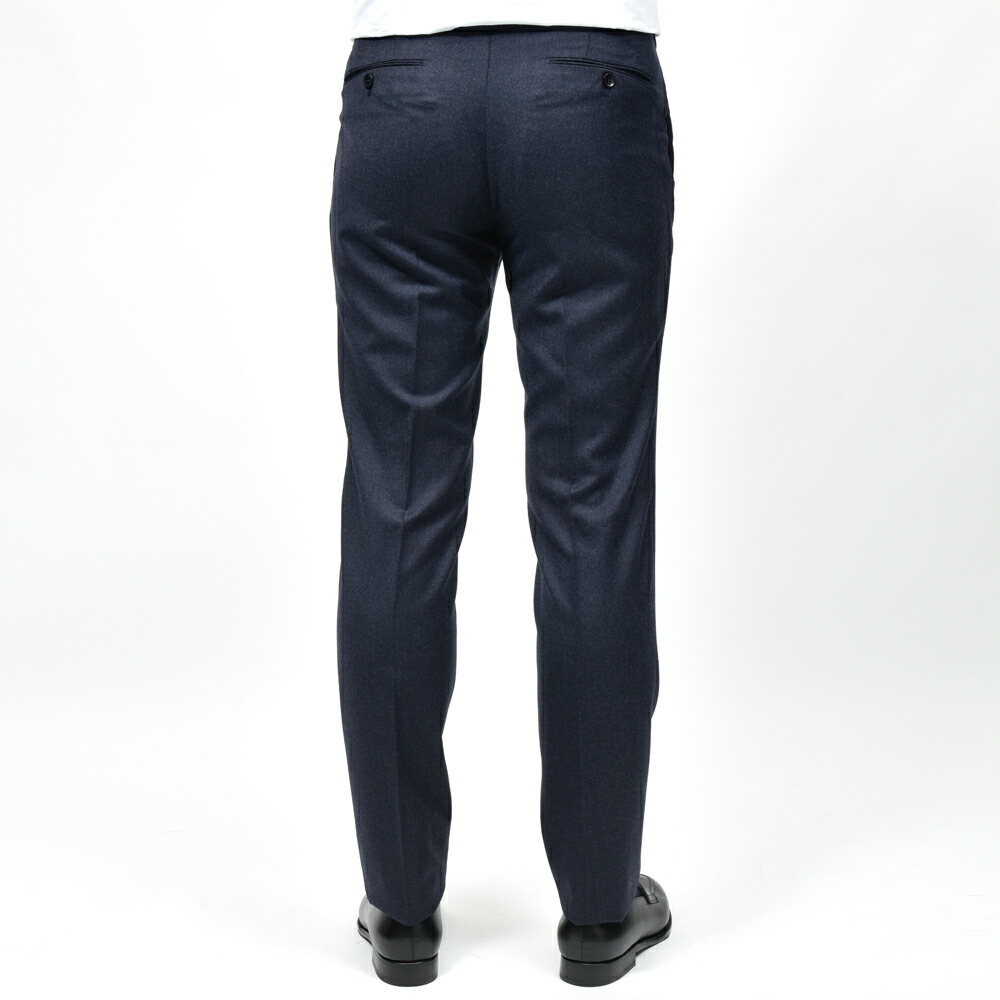SUPER100’sウールを使用したフランネル生地は、柔らかさと適度なコシを併せ持ち、上品な起毛感を湛えています。