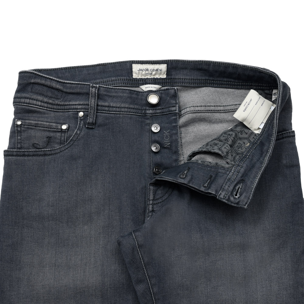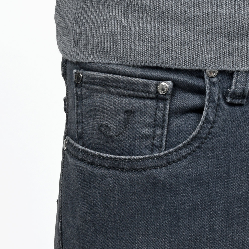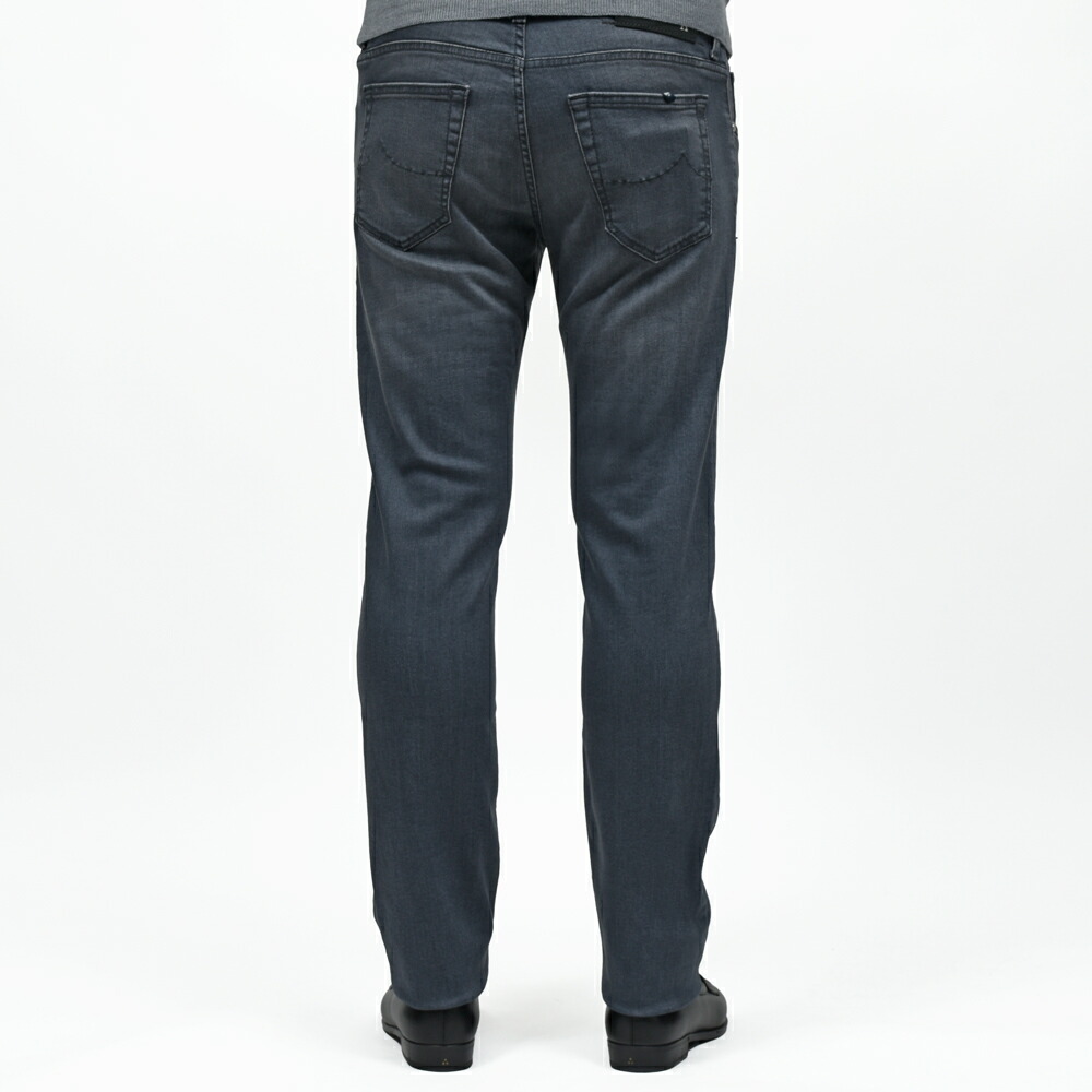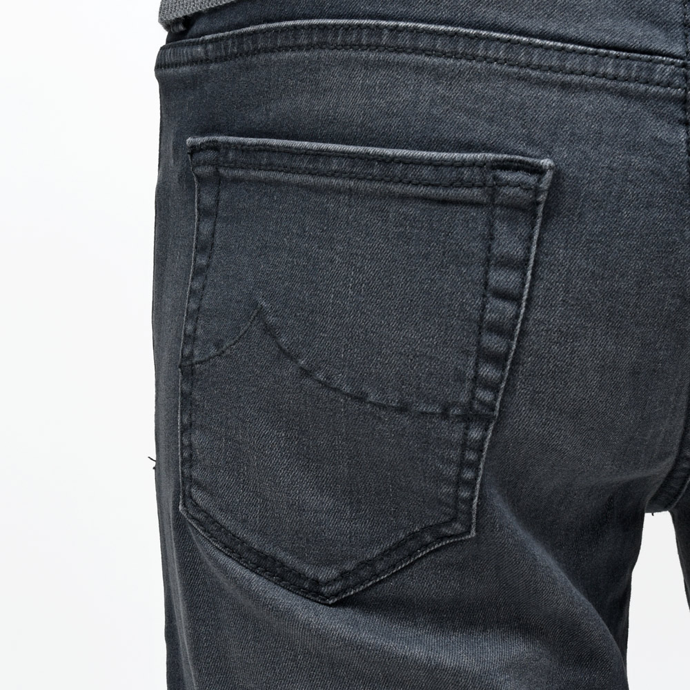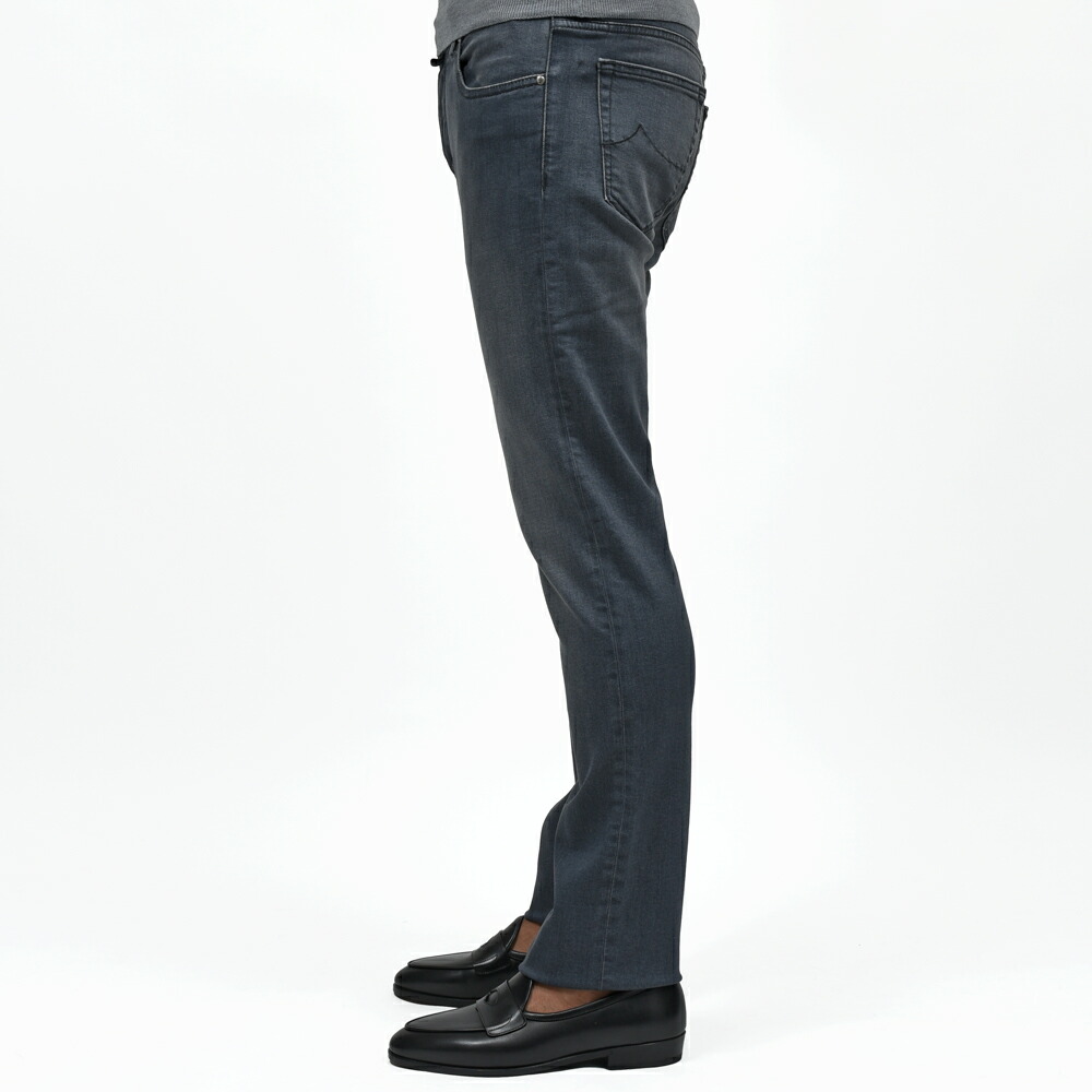 JACOB COHEN(ヤコブコーエン)が得意とする洗練された色出しを活かしグレーの落ち着いたトーンにほどよいウォッシュを重ねることで、NICKらしい都会的なムードを纏わせた一本に仕上がっています。ウエストやポケット口、裾に入る自然なアタリ、そして腿から膝へと続く穿き込んだような色落ちが単色に見えがちなグレーに奥行きと軽やかな陰影をもたらしています。