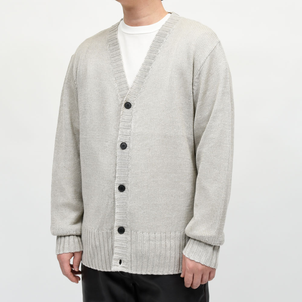 カーディガンなので何かしらの上に羽織る必要がある訳ですが、それがファッション的な面白さにも繋がっています、特にこのリネン特有の適度にざっくりとした雰囲気があるカーディガンの下ににはシャツなのかカットソーなのか?正解はありませんが色々と考える面白さもあるのかなと。