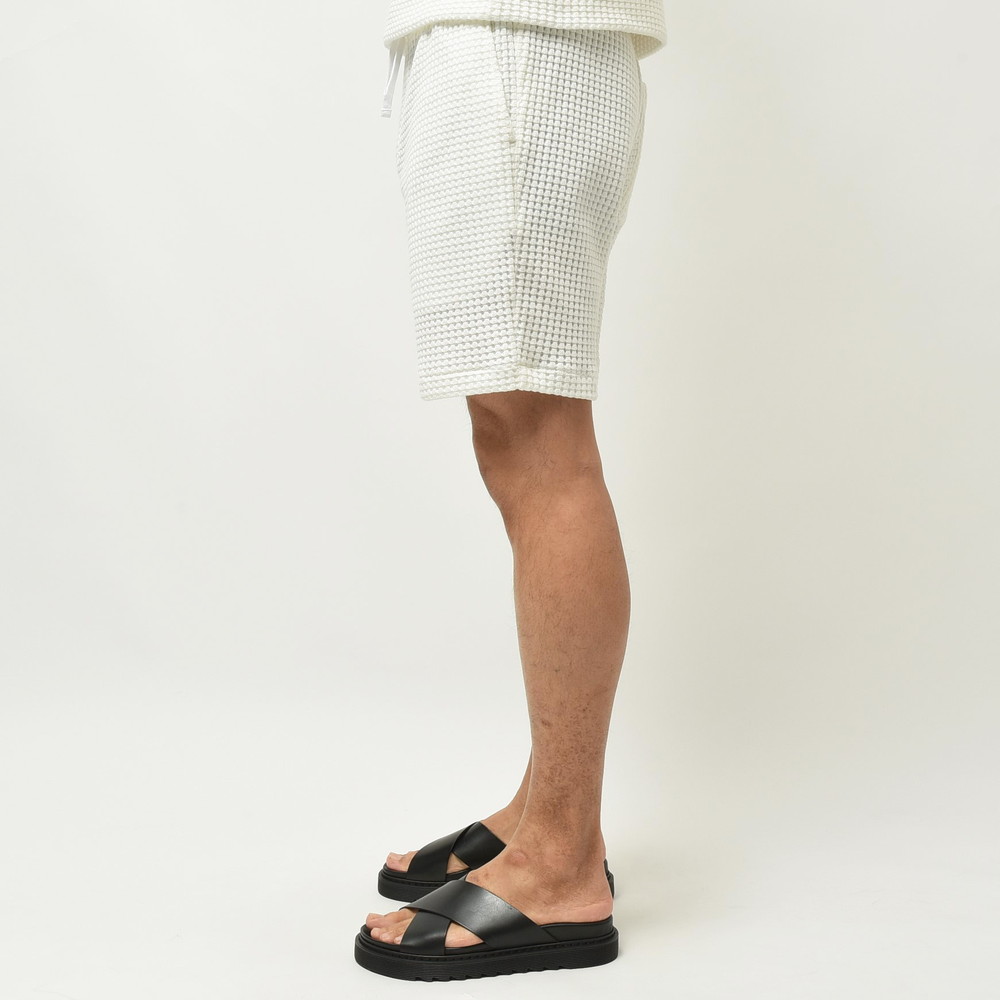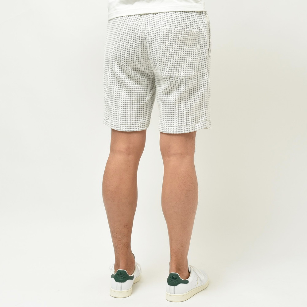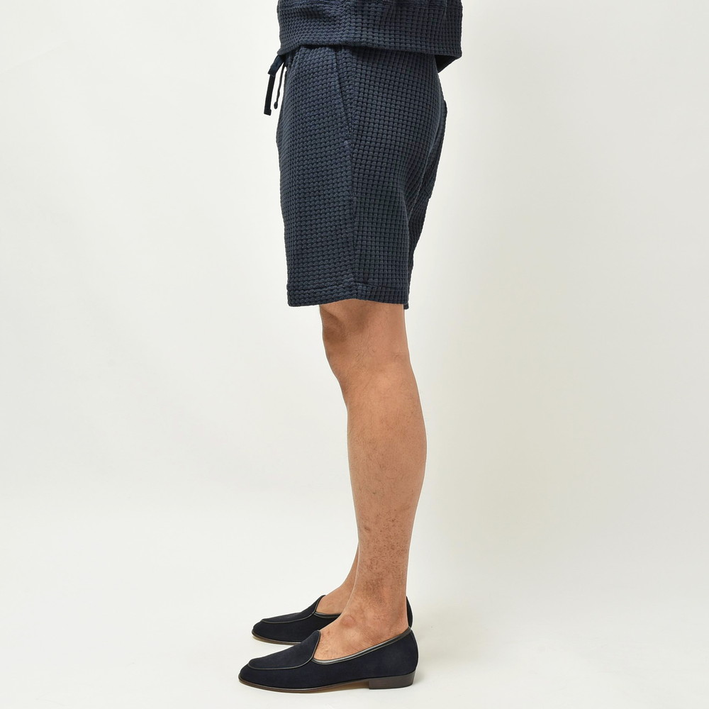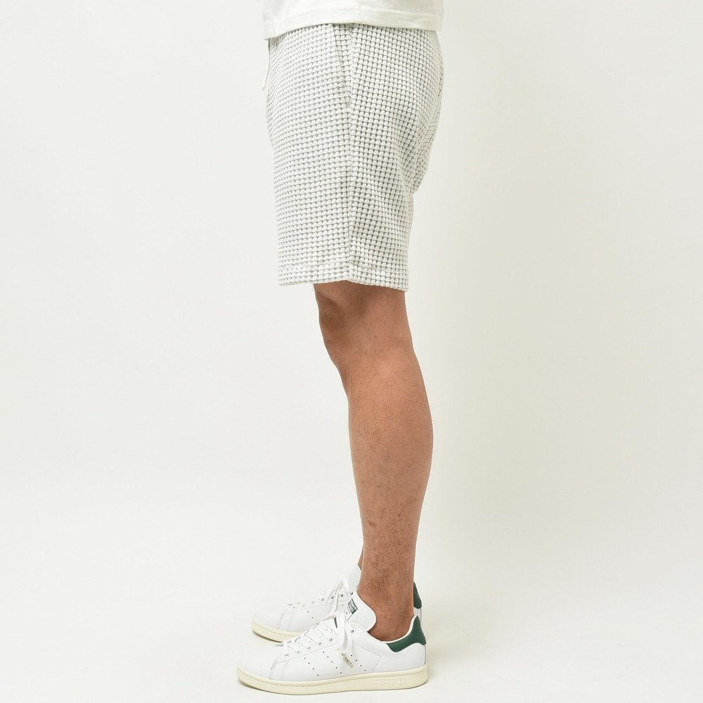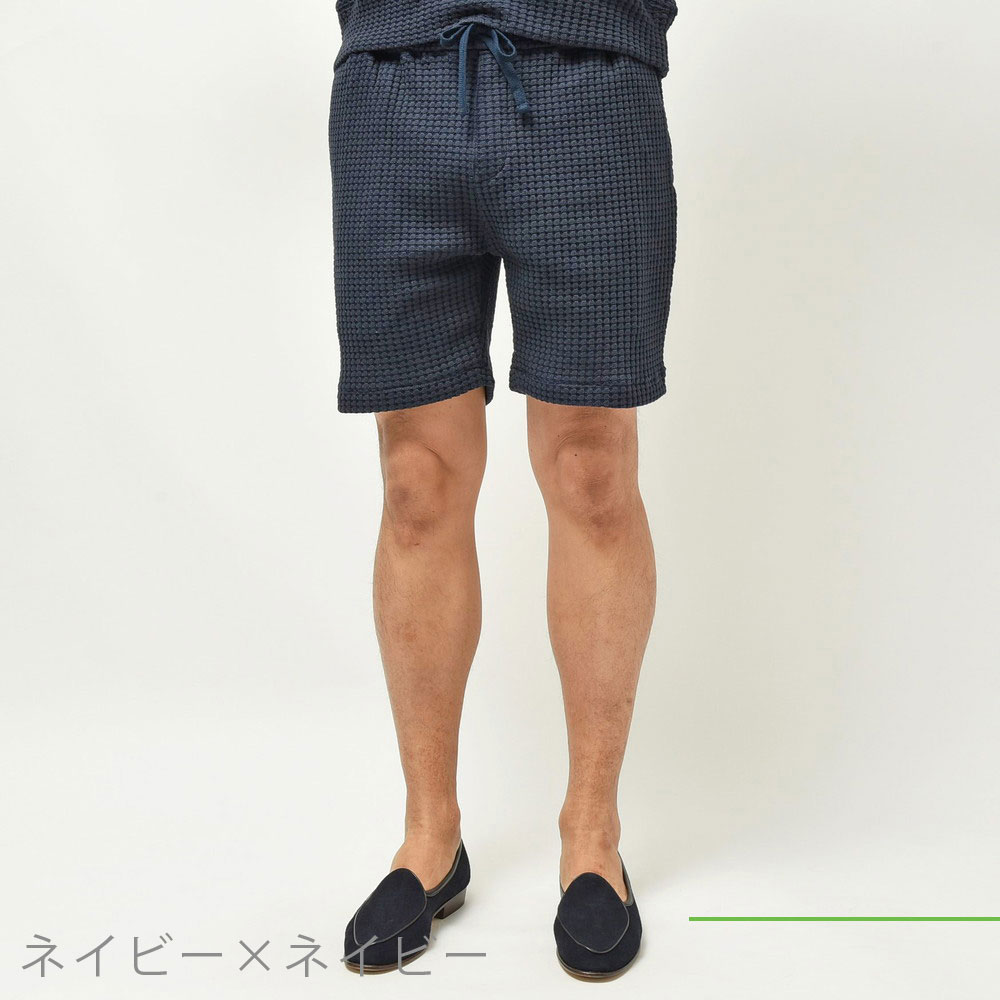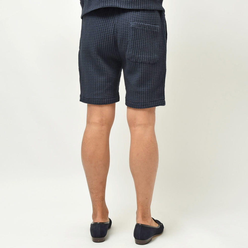 凹凸のある生地が特徴的なSeaGreen(シーグリーン)のオニワッフルを採用したシャーリングショーツ、膝上丈のスッキリしたシルエットなので合わせるアイテムを選ばずスマートに取り入れて頂ける一本に仕上がっています。