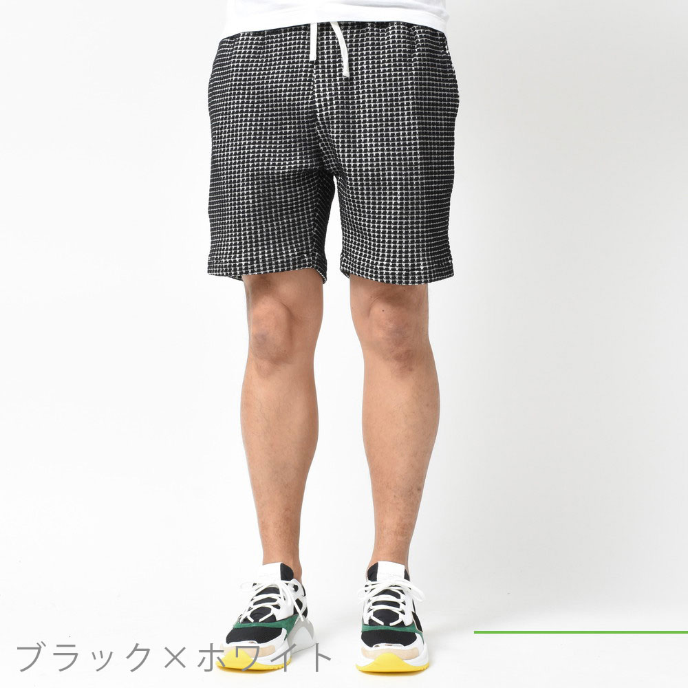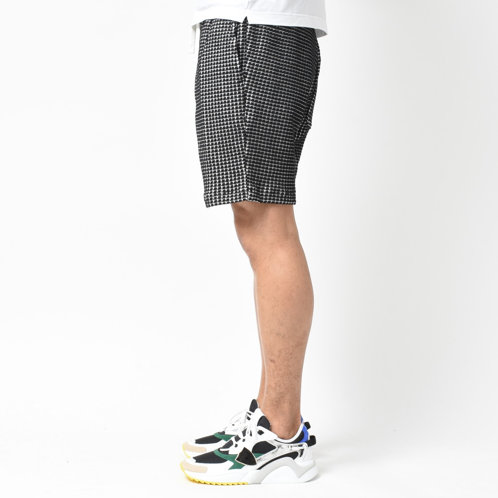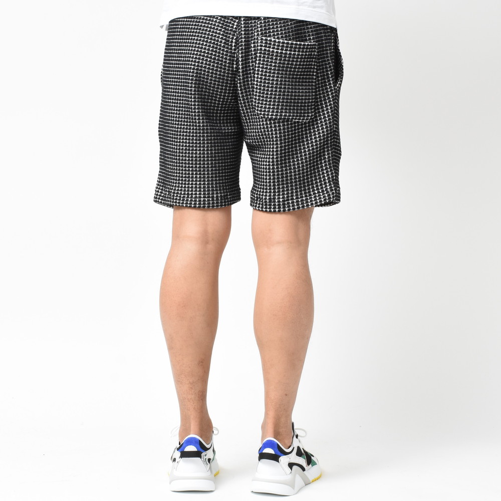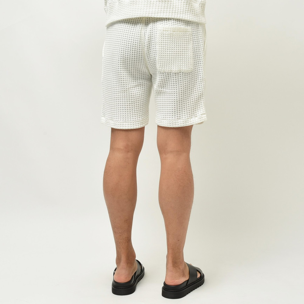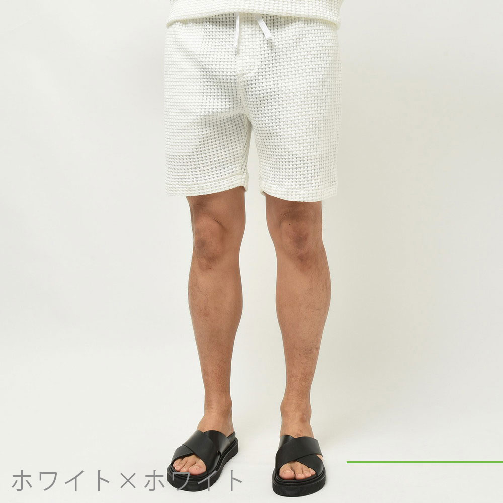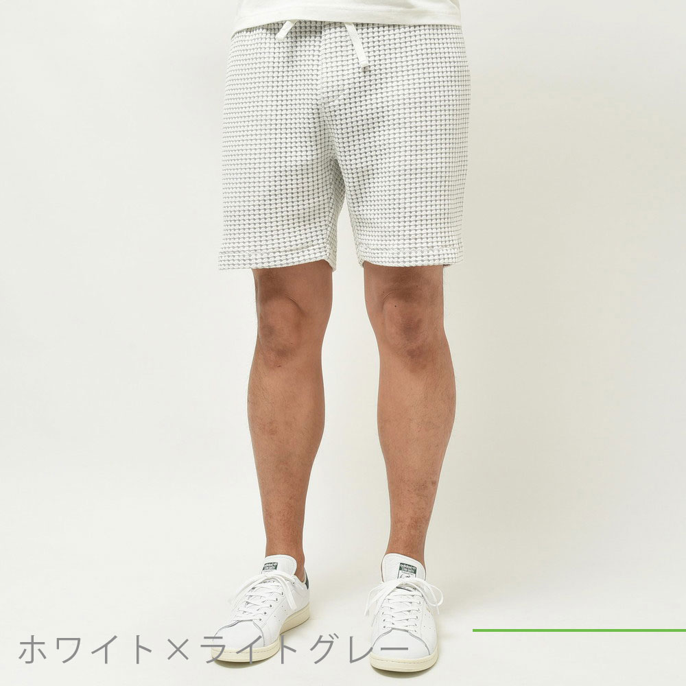凹凸のある生地が特徴的なSeaGreen(シーグリーン)のオニワッフルを採用したシャーリングショーツ、膝上丈のスッキリしたシルエットなので合わせるアイテムを選ばずスマートに取り入れて頂ける一本に仕上がっています。