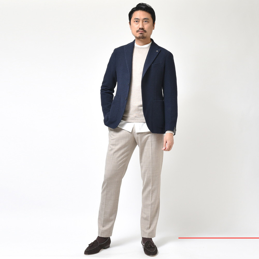 シャツを合わせるというよりは、クルーネックニットなんかを合わせた大人っぽいジャケットスタイルで着こなすのがオススメです。