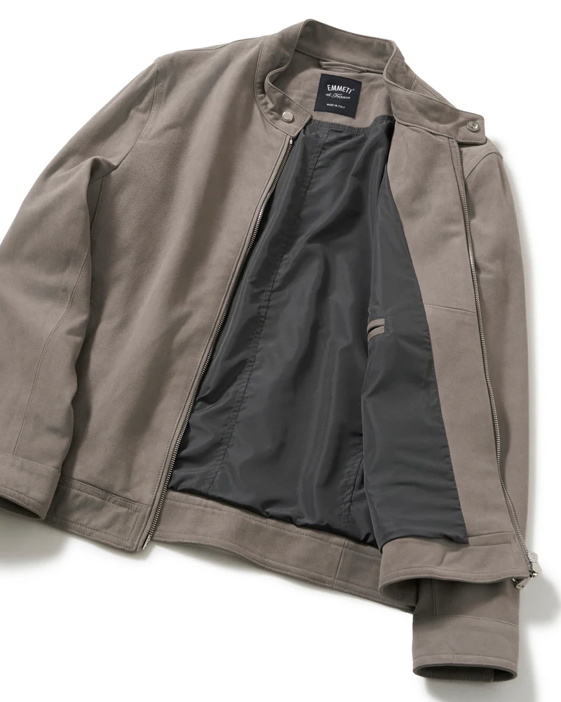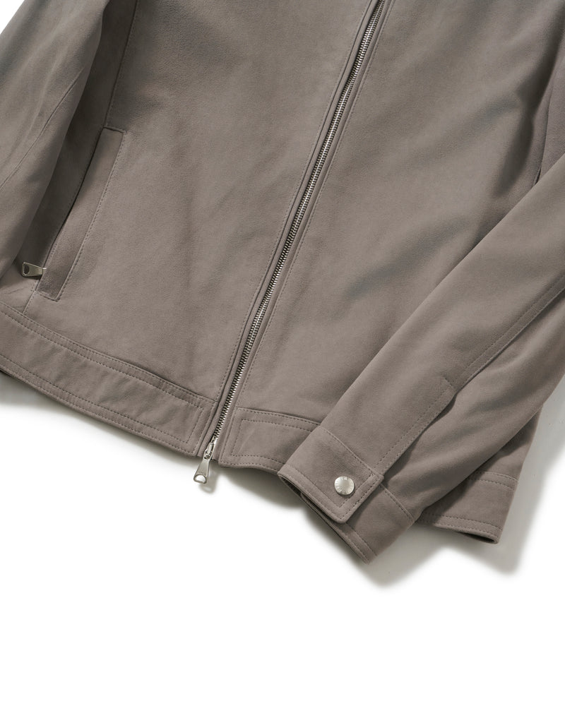 カラーは、柔らかな光を含んだサンドベージュ。単色でありながら奥行きを感じさせるニュアンスとなり、スエードらしい表情を楽しめる一着となっています。