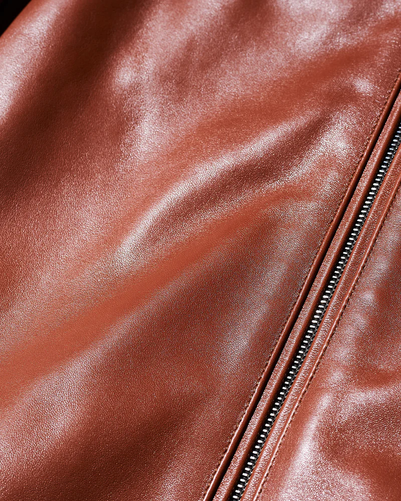 さらに、腰帯や袖口のカフス仕様を省略することで、装飾を抑えたミニマルなデザインに仕上げているのも特徴。余計なディテールを排することで、シルエットの美しさとレザーの上質な表情をより際立たせています。