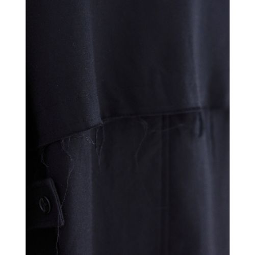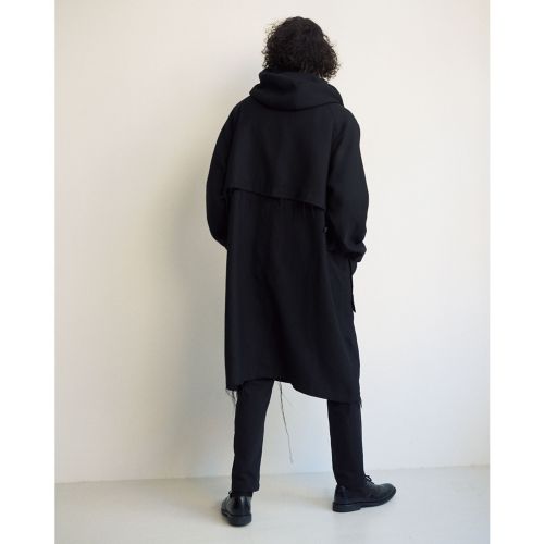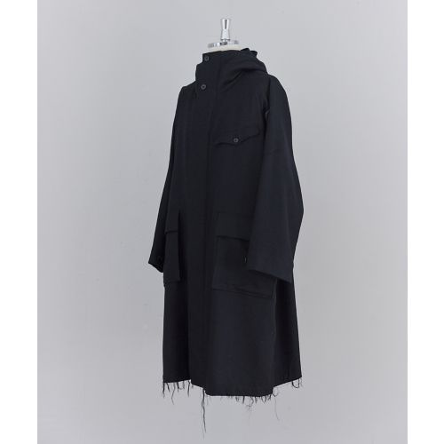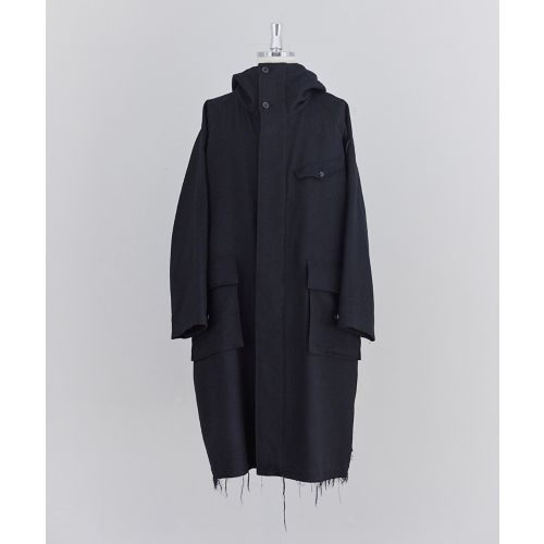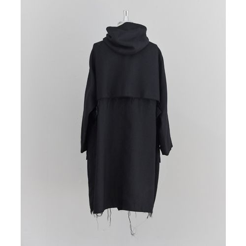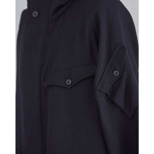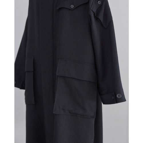 たっぷりとした分量感を持つ一重仕立てのウールコート。胸ポケットにスマートフォンやカードケースを、大きめな腰ポケットにはロングウォレットも収まります。左袖のポケットもアクセント。釦は本水牛、後ろケープ裾と裾を断ち切り仕上げ。細めの番手の糸でふっくらと心地よい厚みがある生地を目指して、接結糸に36中/2のシルクの糸を使い、美しい生地を開発しました。ダブルフェイスを織れる織機が少なくなり、その設計ができる職人さんも限られてきたなか、織っていただいた至極の一品です。