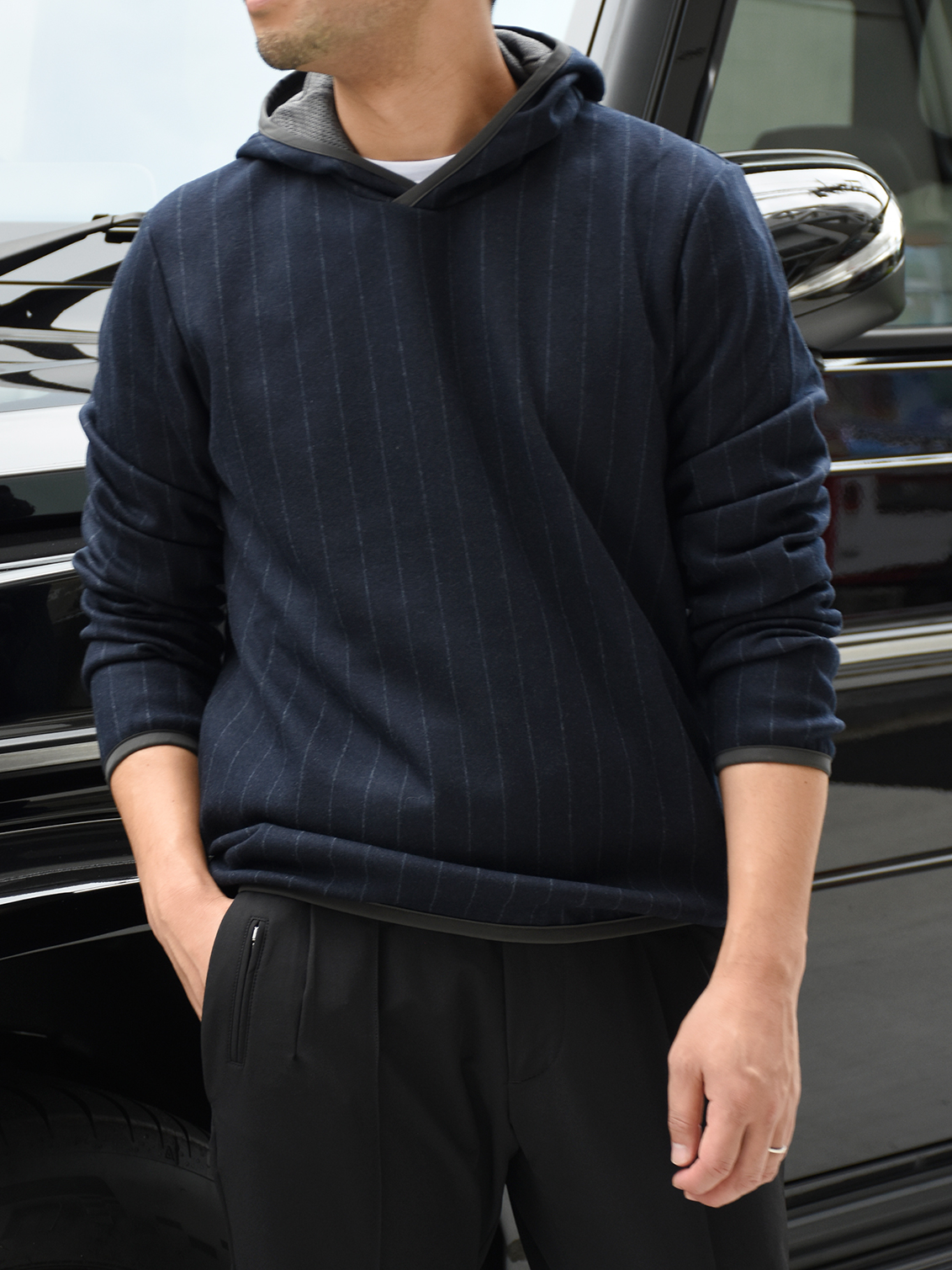 さりげないストライプと質の良い素材感が大人のカジュアルスタイルにぴったり。キレイめなシルエットのパンツを合わせるのもポイント。
