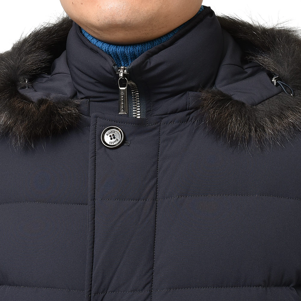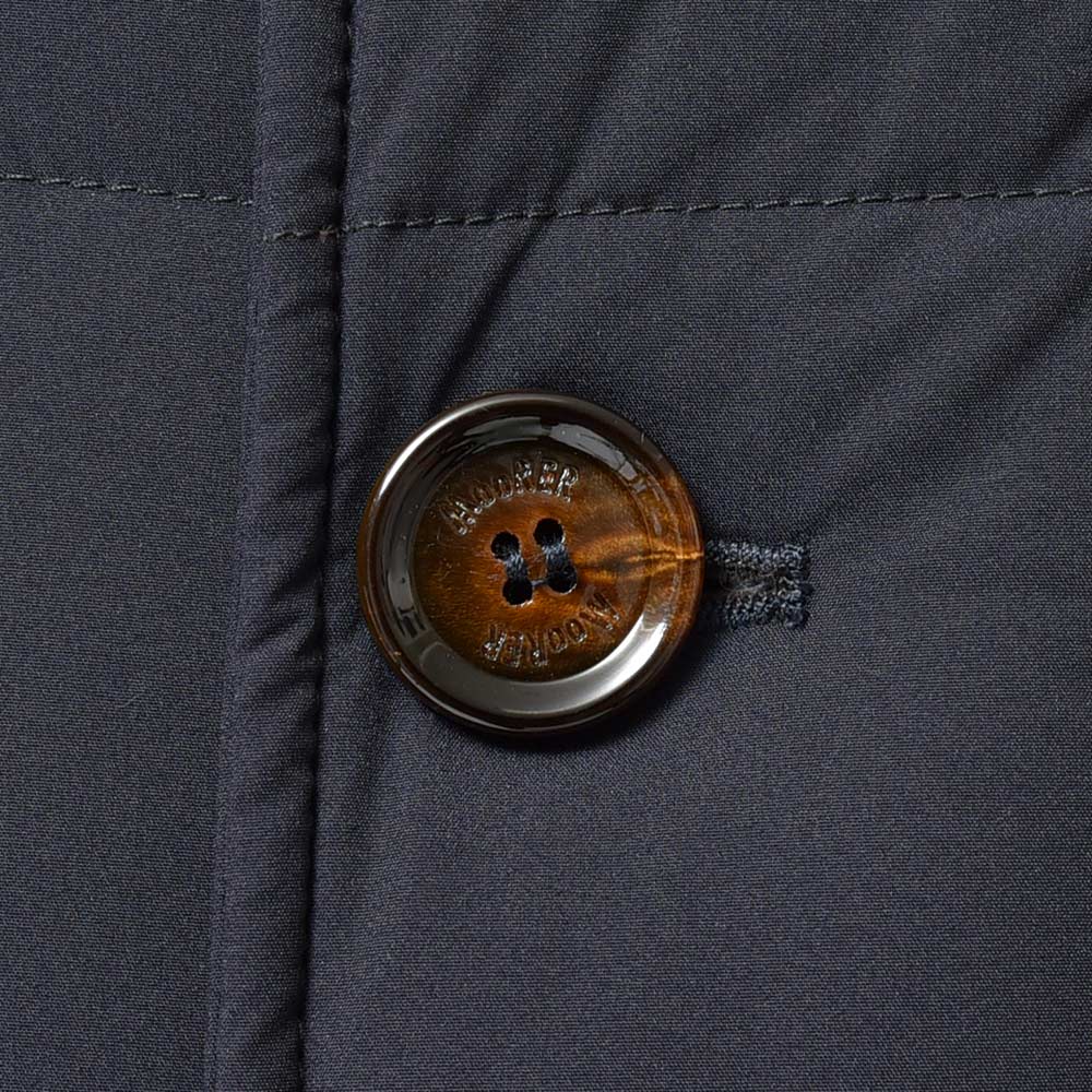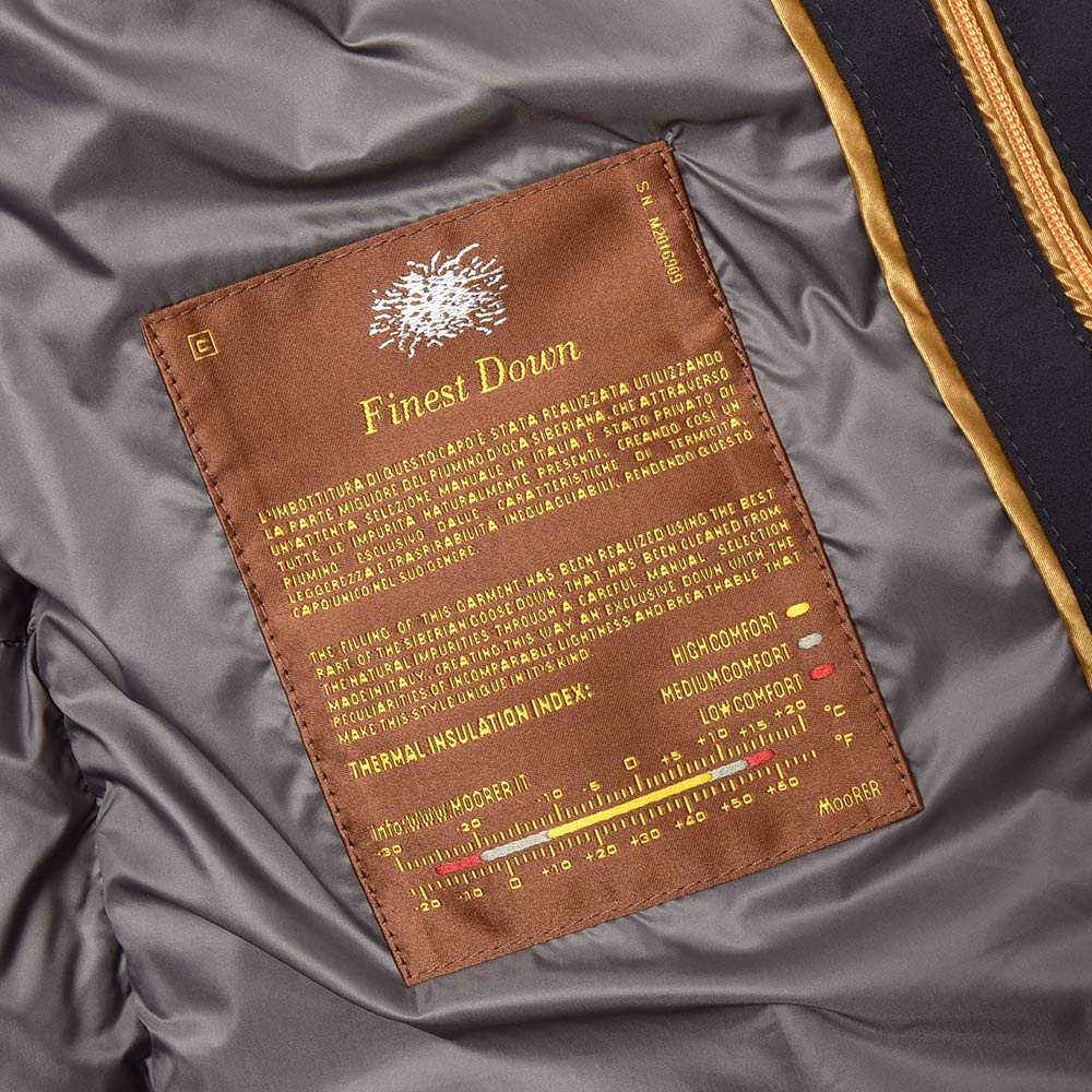 MOORERは最高のフィルパワーを誇るシベリア産の最高級ホワイトグースダウンを贅沢に使用。さらに、メタル製のジッパーと、ホーンボタンの二重の留め具によって、ダウンにとって必要不可欠な防寒性に隙はなく、かといって着膨れしないシルエットは秀逸としか言いようがありません。